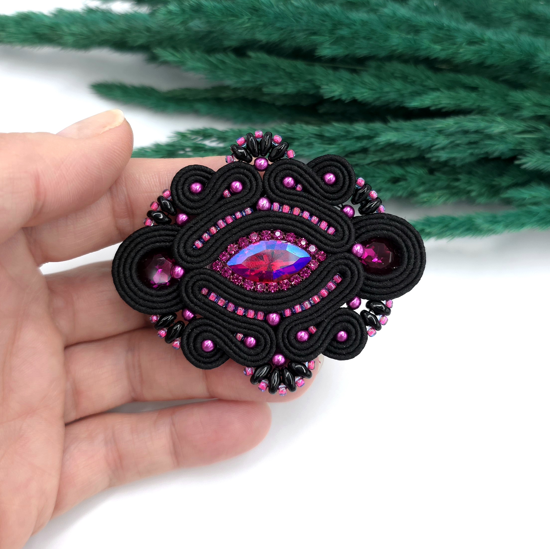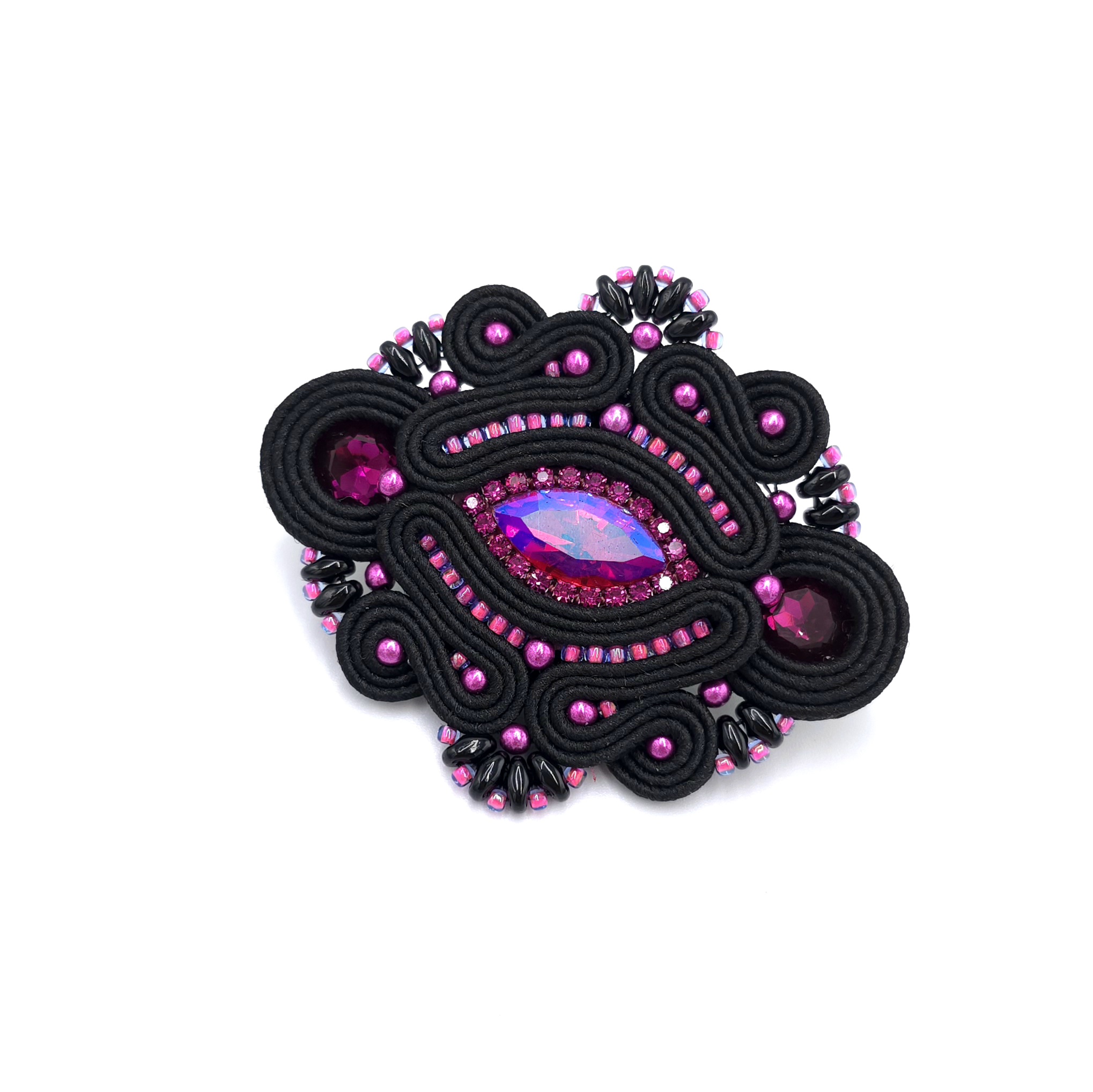 kaboszony szklane kryształki, taśma z cyrkoniami, koraliki Toho, koraliki Round Beads, koraliki SuperDuo, greckie sznurki sutasz, metalowe zapięcie broszki.