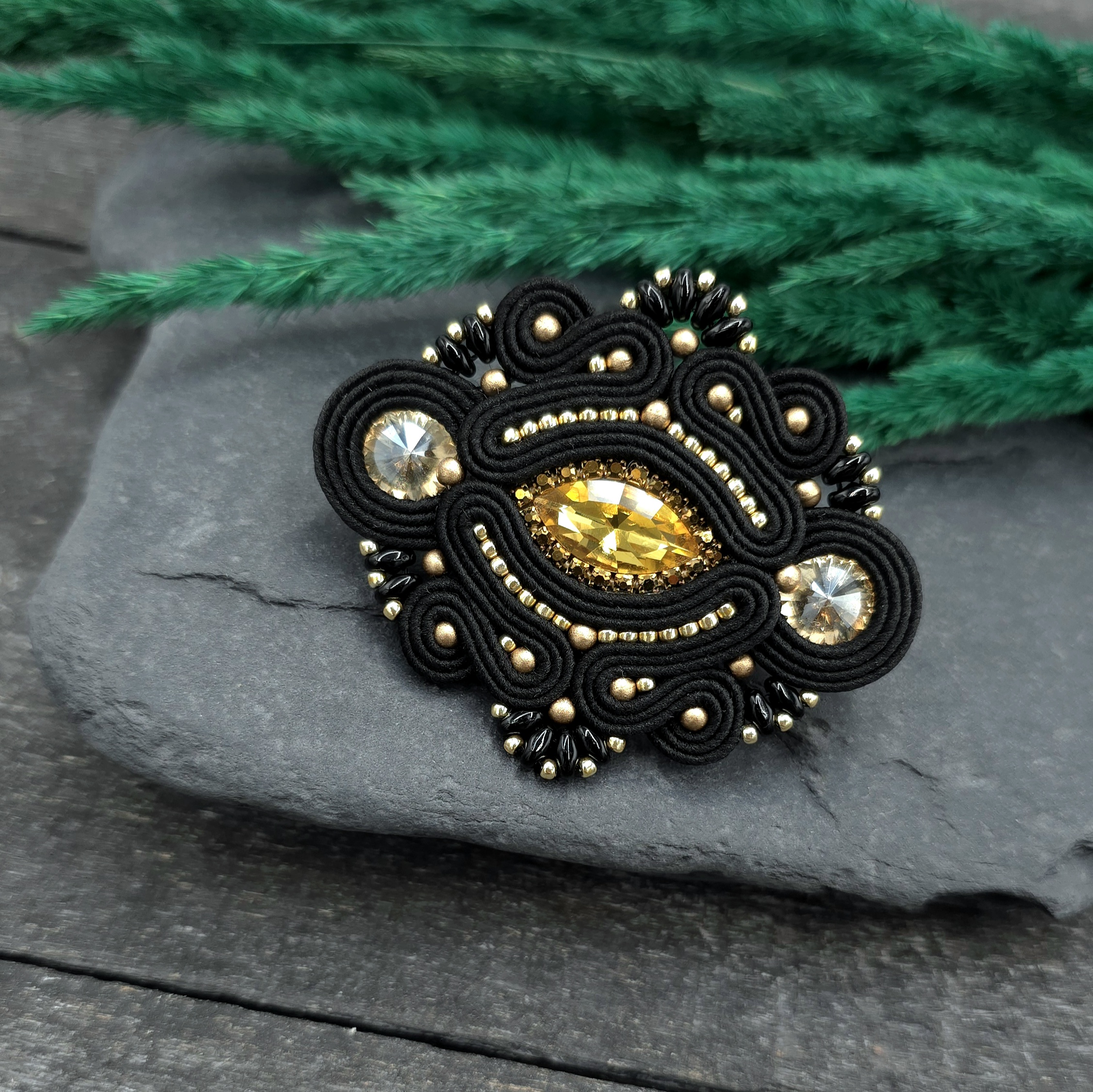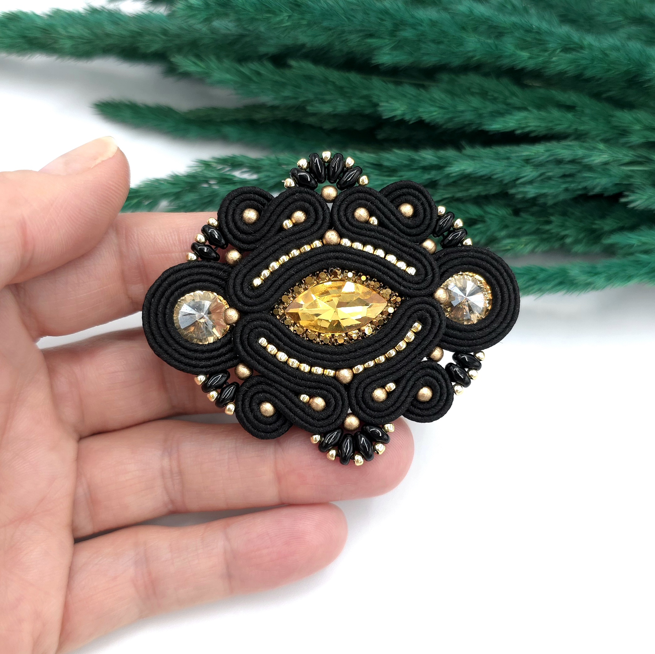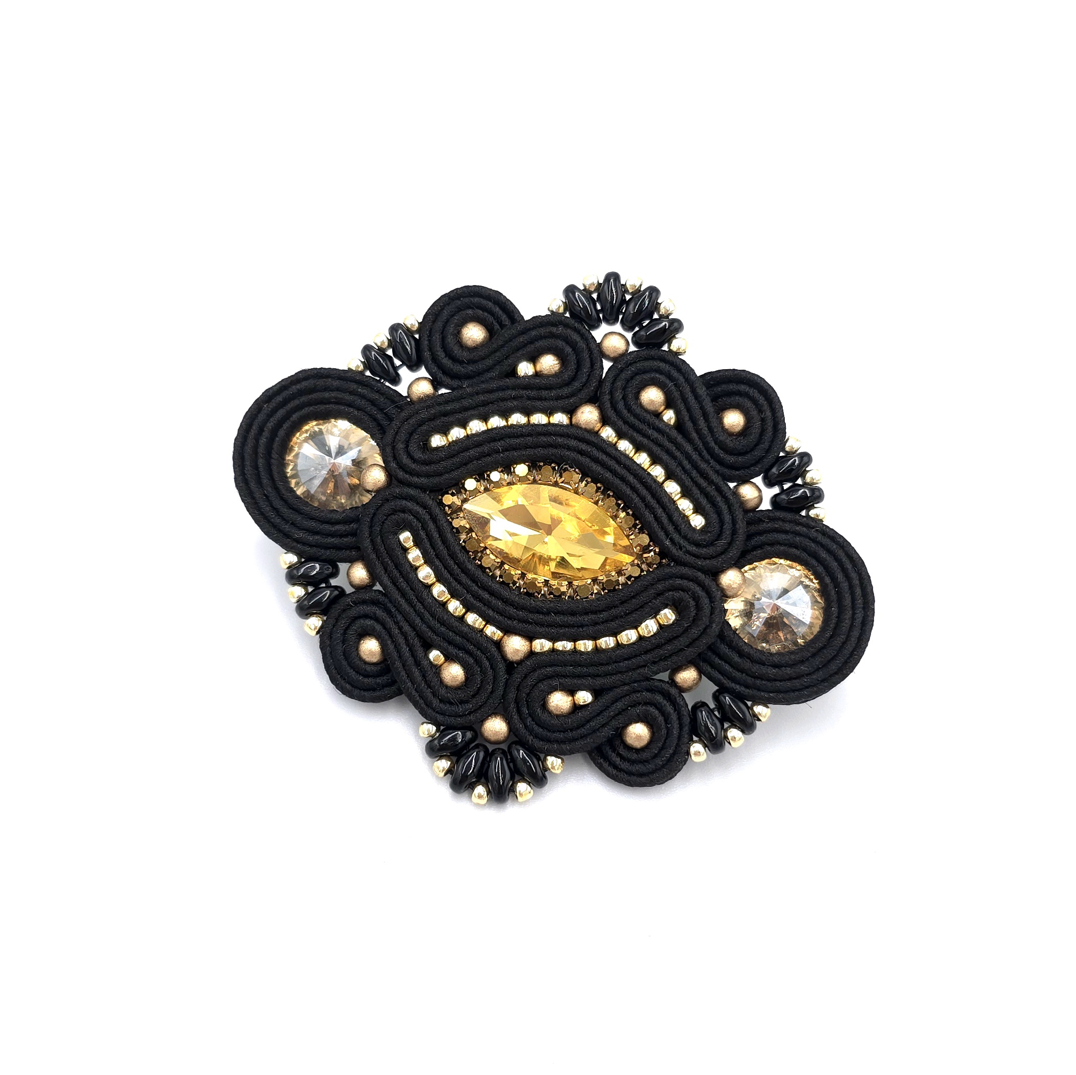 kaboszony szklane kryształki, taśma z cyrkoniami, koraliki Toho, koraliki Round Beads, koraliki SuperDuo, greckie sznurki sutasz, metalowe zapięcie broszki.