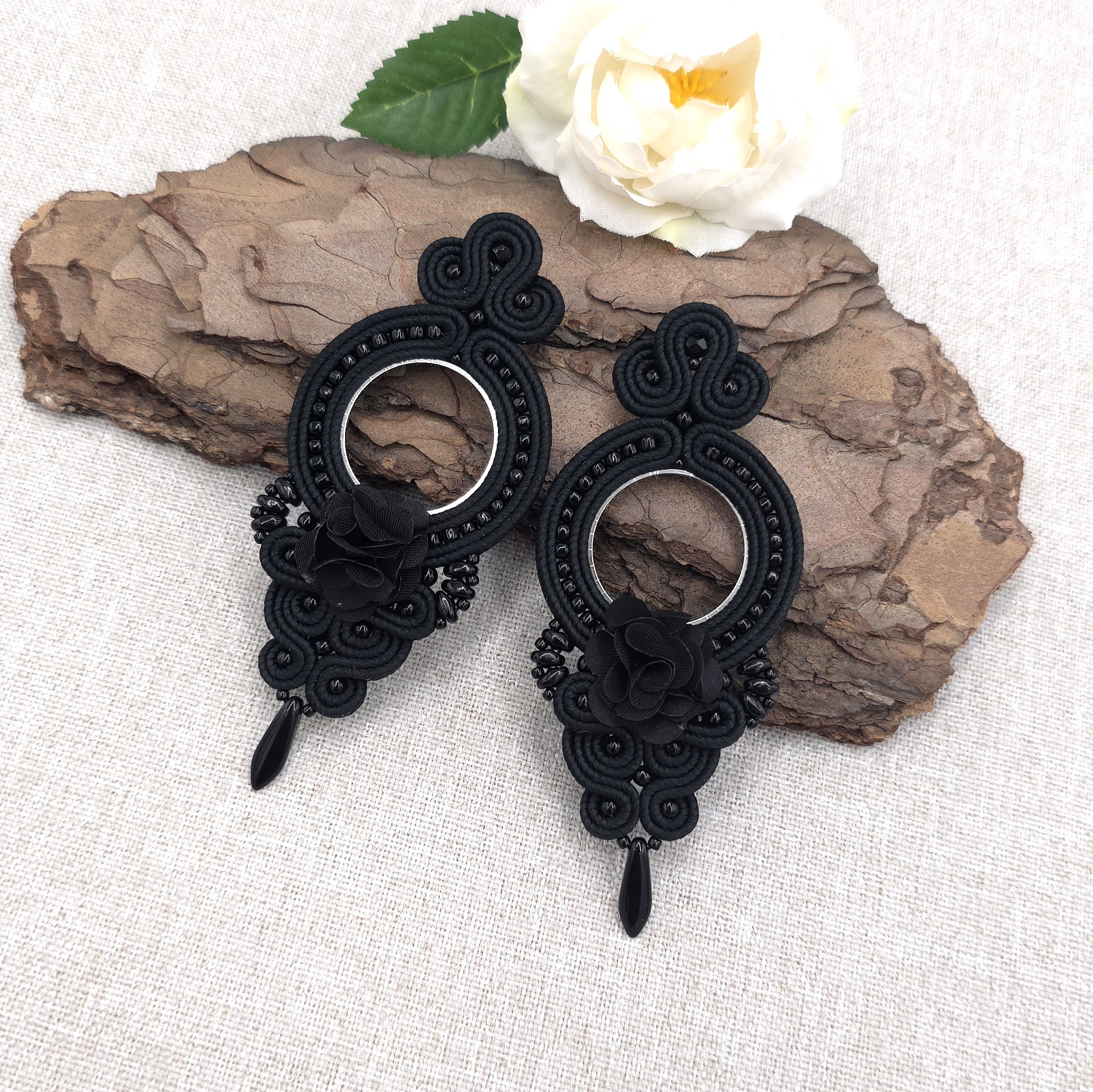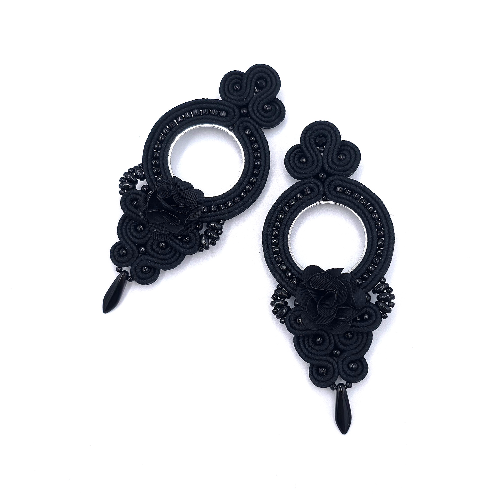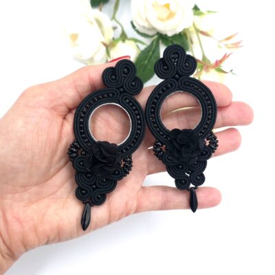 Eleganckie kolczyki sutasz w intensywnym, w głębokiej czerni, wykonane na bazie w kształcie koła.