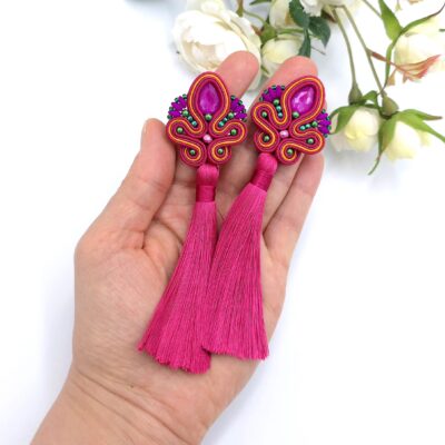 „Cosima” kolczyki sutasz z chwostami fuksjowe długie kolorowe na lato
