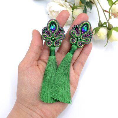 Efektowne, długie kolczyki sutasz z mięciutkimi, wiskozowymi chwostami.