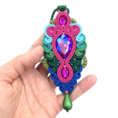 Niezwykle efektowny wisior z sutaszu, w którym pośrodku umieściłam cudowny mieniący się kryształ.