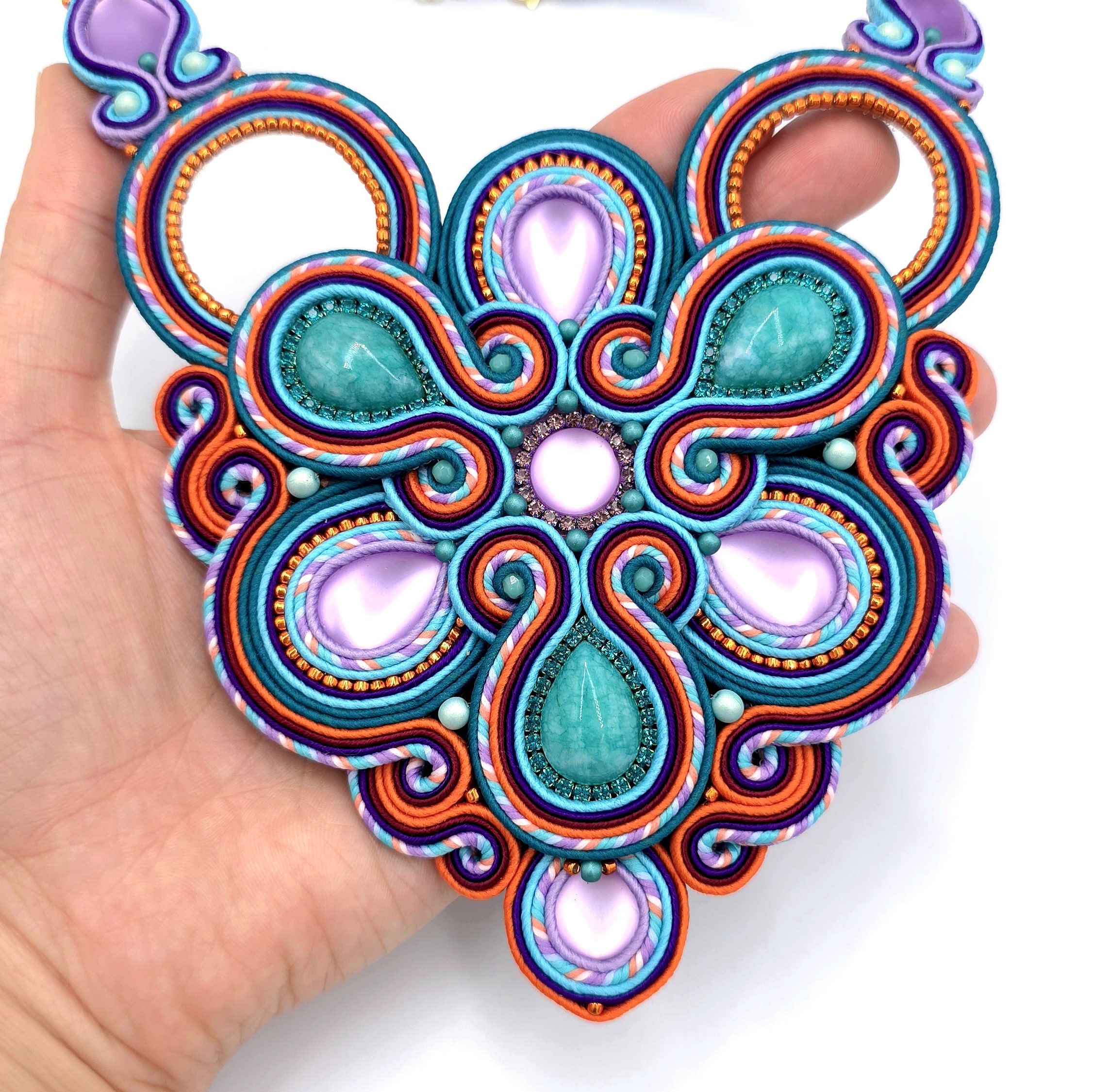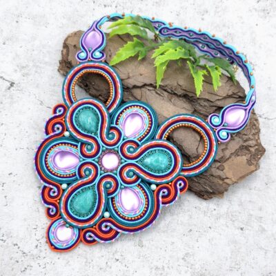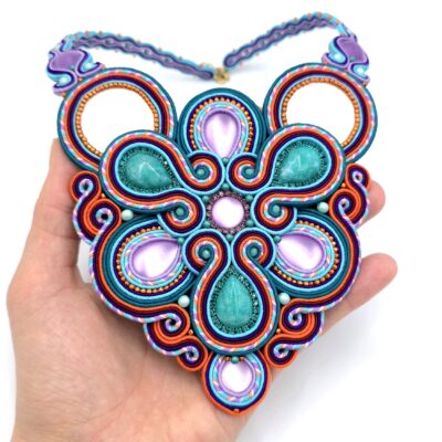 Z pięknymi turkusowymi jadeitami i liliowymi kaboszonami Lunasoft, które niesamowicie odbijają światło.