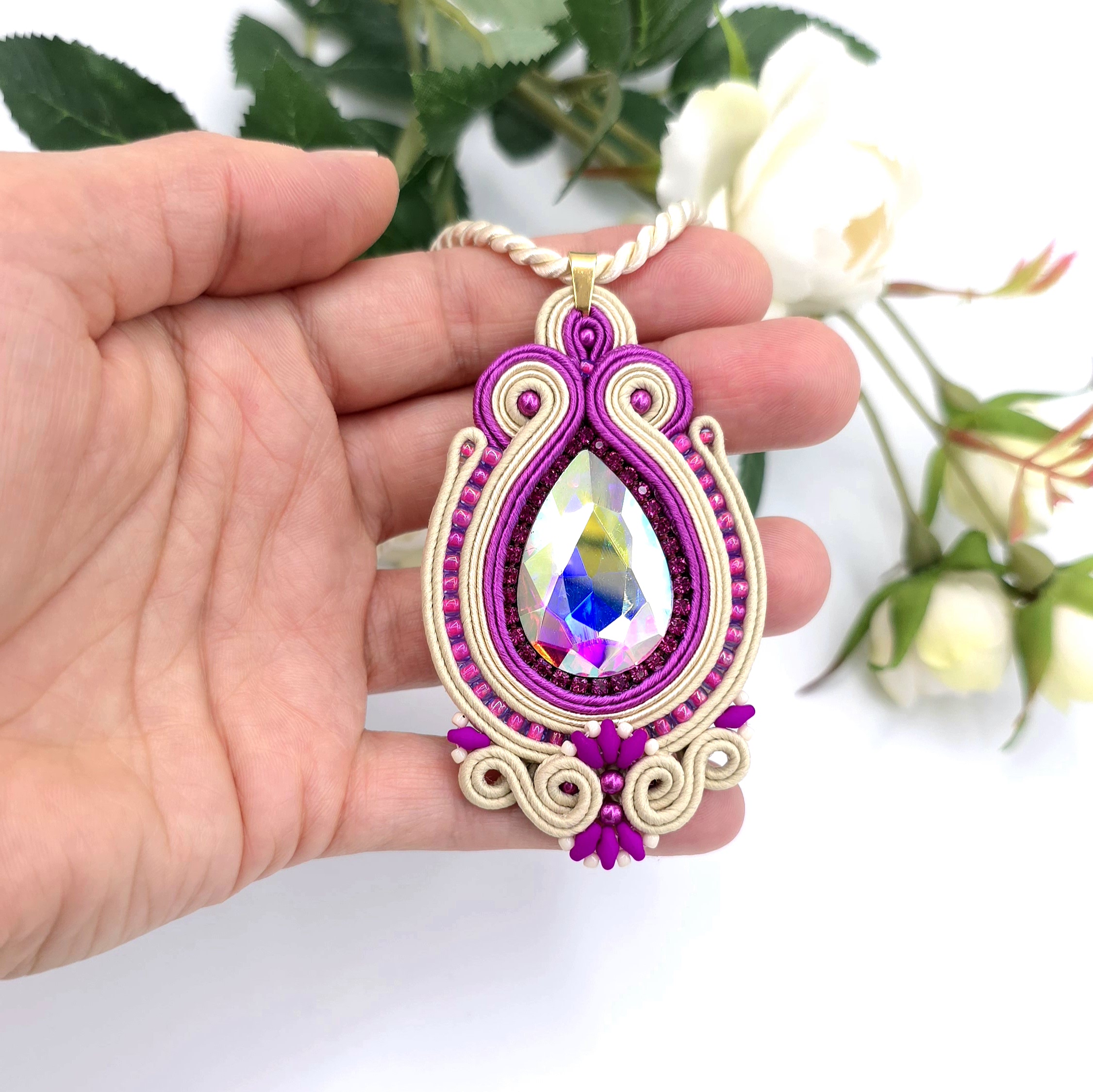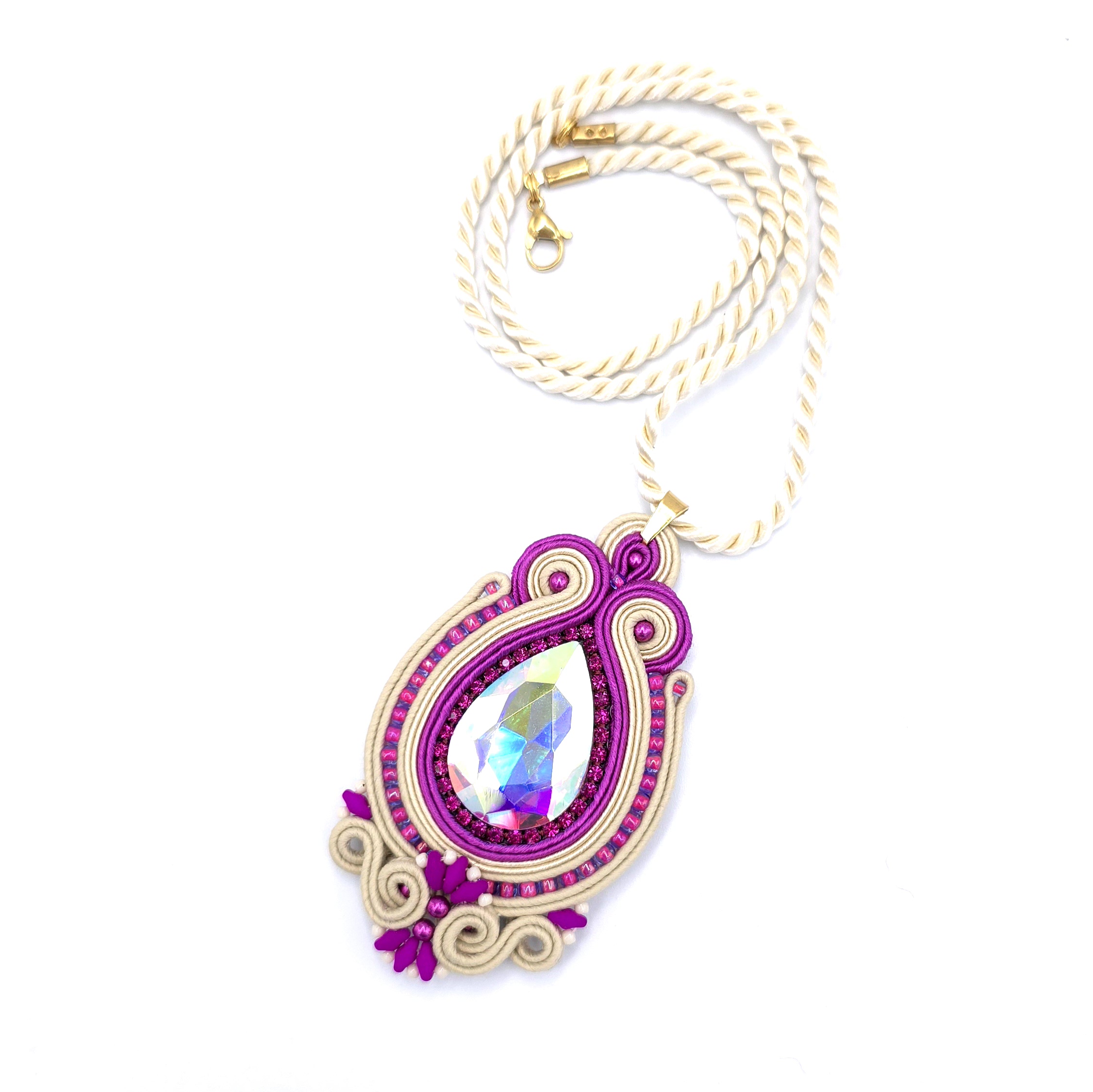 kaboszon kryształowy, koraliki Toho, koraliki Round Beads, koraliki SuperDuo, taśma z cyrkoniami, czeskie i greckie sznurki sutasz, zapięcie i krawatka ze stali chirurgicznej.