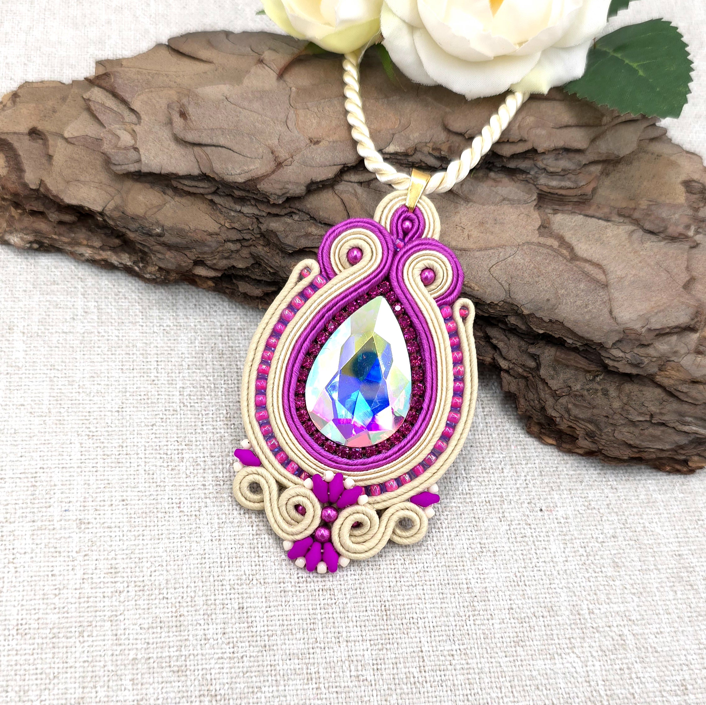 Przepiękny wisiorek z sutaszu, z mieniącym się dużym kryształem pośrodku i taśmą z cyrkoniami wokół niego.