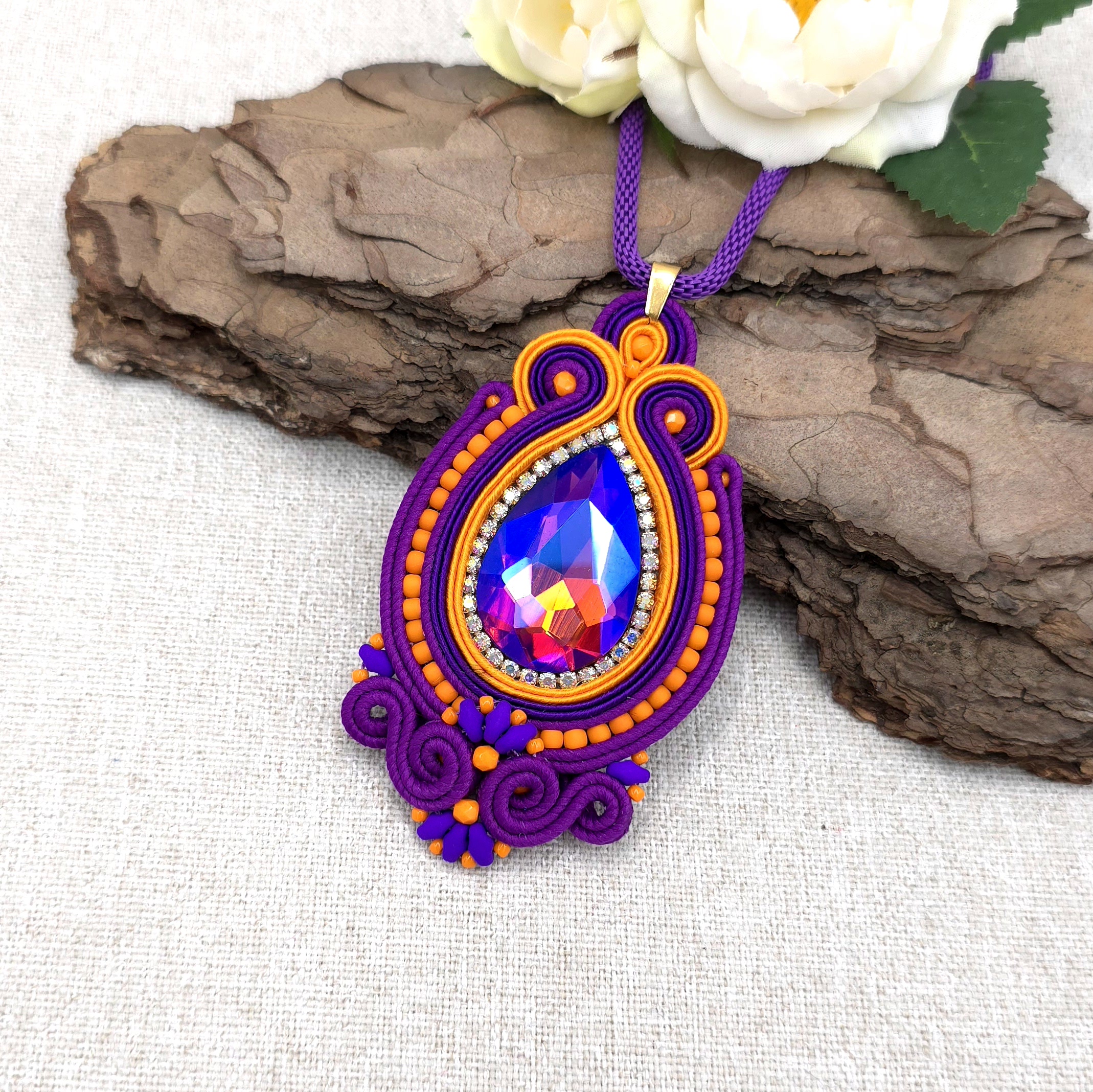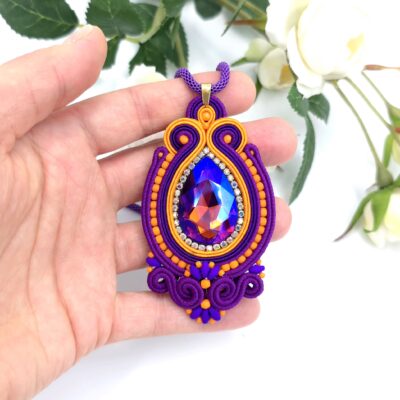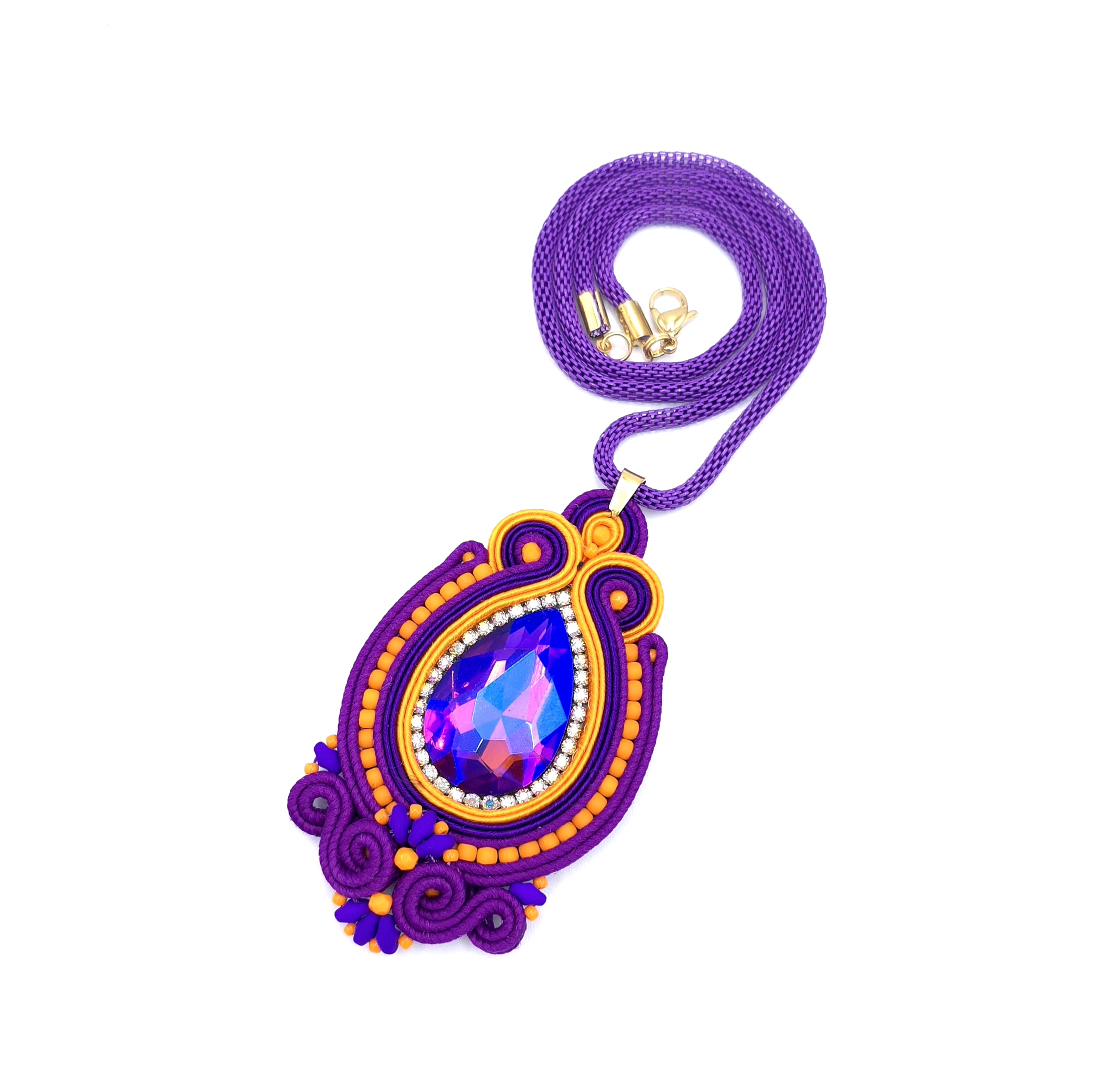Przepiękny wisiorek z sutaszu, z mieniącym się dużym kryształem pośrodku i taśmą z cyrkoniami wokół niego.