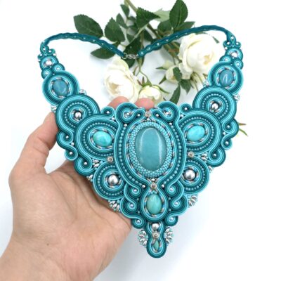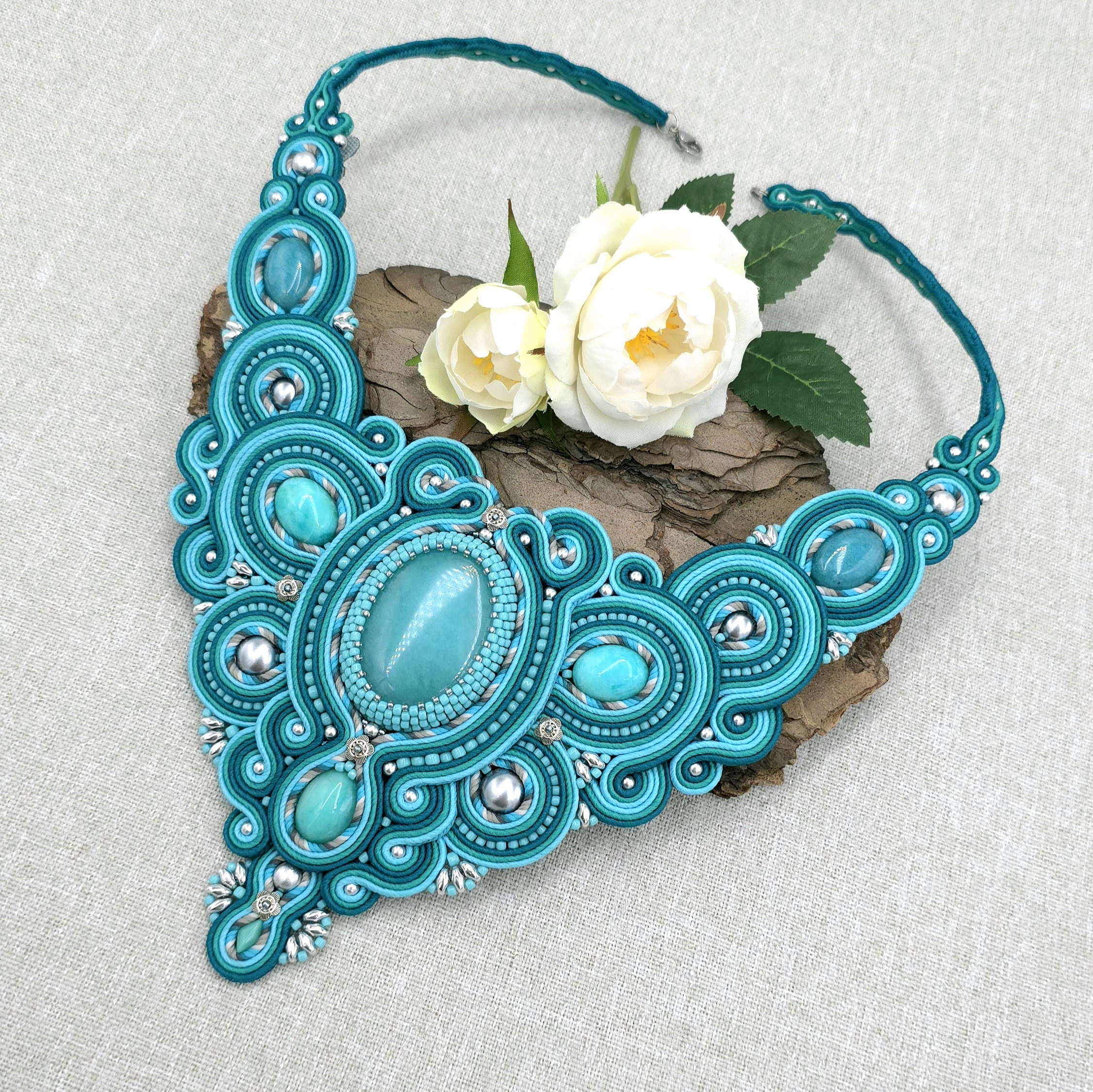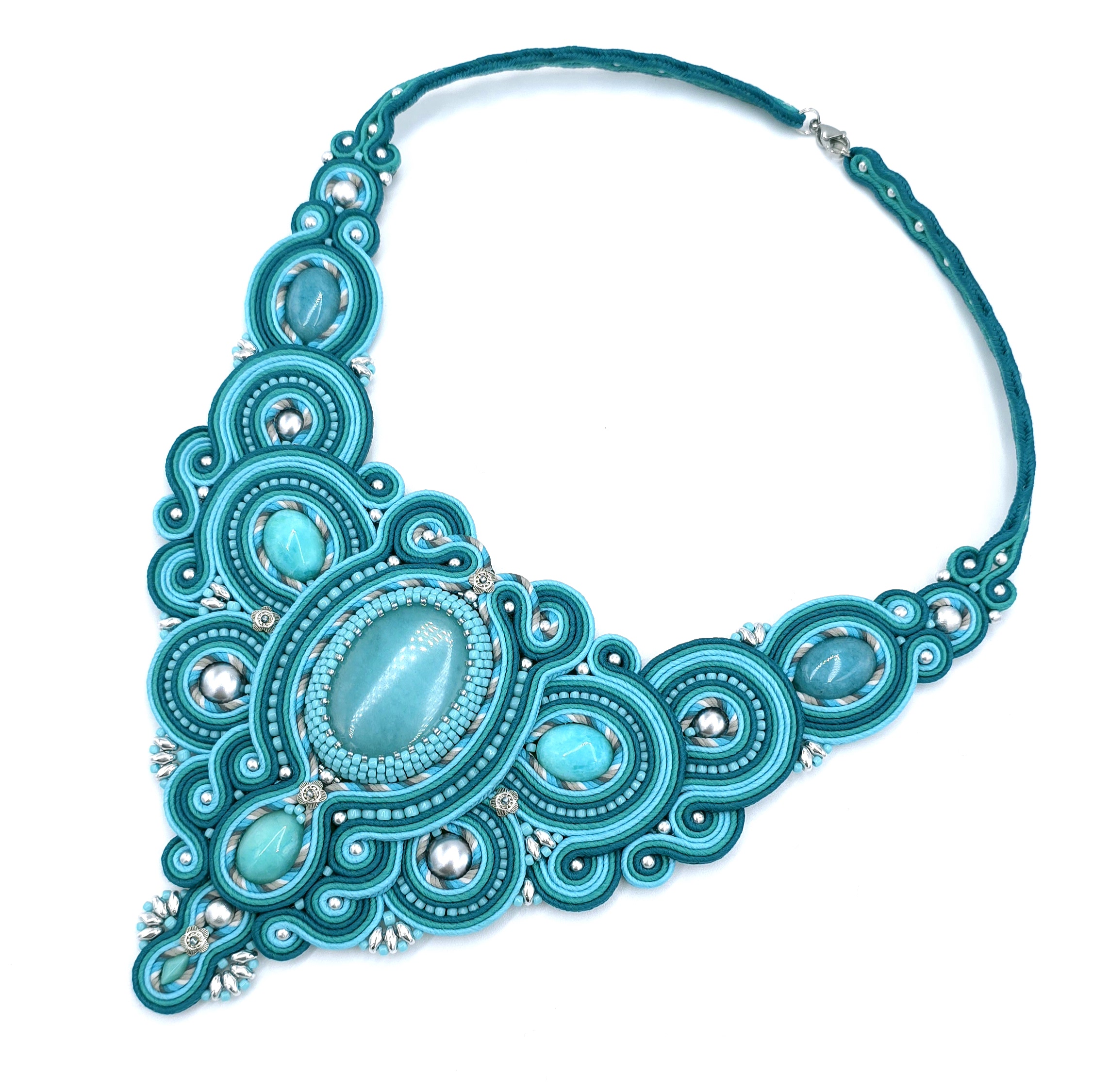 Bogato zdobiony naszyjnik z sutaszu, z pięknymi miętowymi kamieniami jadeitu.