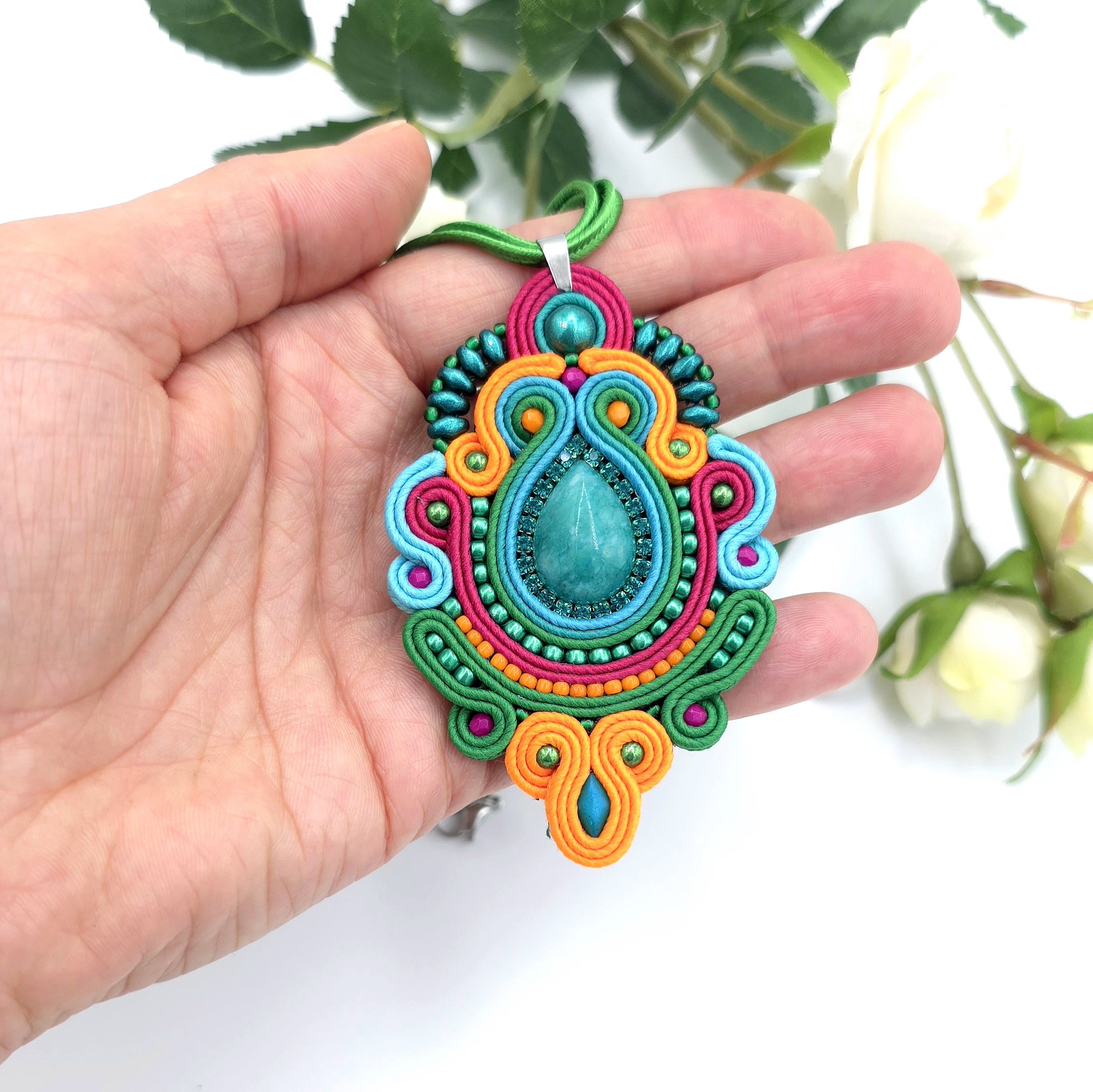 kaboszony jadeitu, koraliki Toho, taśma z cyrkoniami, koraliki Round Beads, koraliki Fire Polish, koraliki GemDuo, koraliki SuperDuo, greckie sznurki sutasz, zapięcie i krawatka ze stali chirurgicznej.