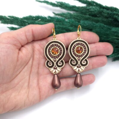kaboszony kryształki, taśma z cyrkoniami, koraliki Toho, koraliki Round Beads, koraliki SuperDuo, duże szklane łezki DropBeads, greckie i czeskie sznurki sutasz, bigle ze stali chirurgicznej.
