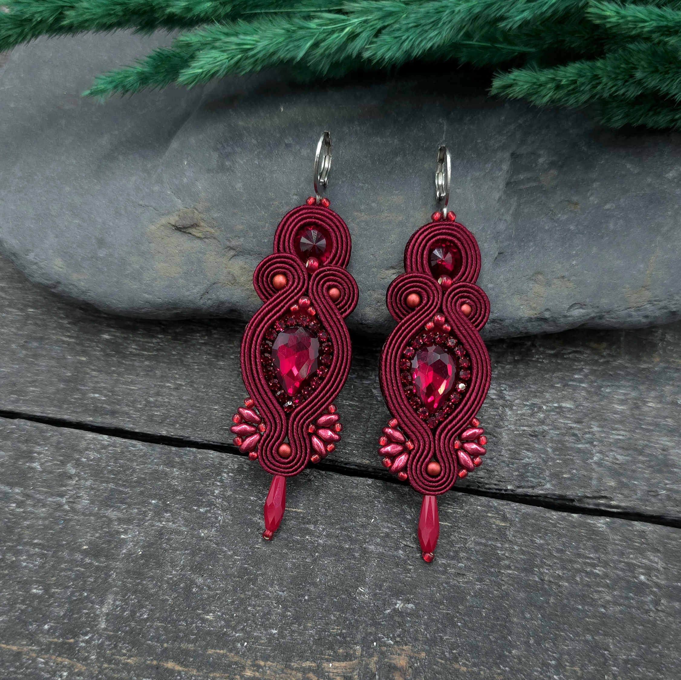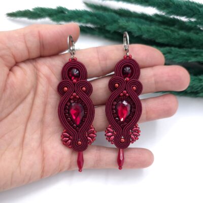 Wieczorowe kolczyki w odcieniu głębokiego bordo, z kryształem pośrodku, a wokół niego błyszczącą taśmą z cyrkoniami.