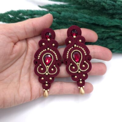 Kolczyki sutasz w odcieniu głębokiego bordo urzekają elegancją i misternie ułożonymi sznureczkami.