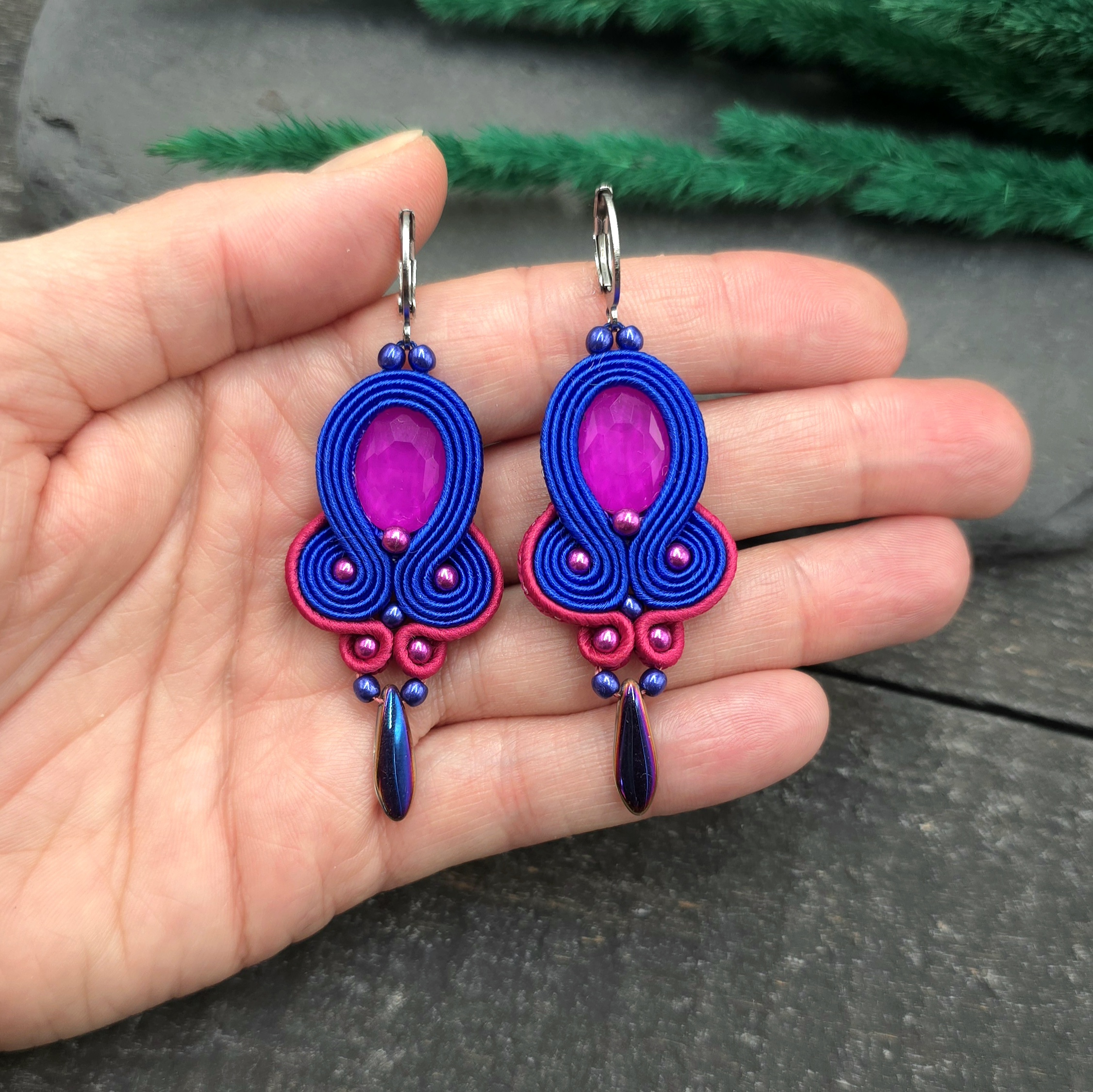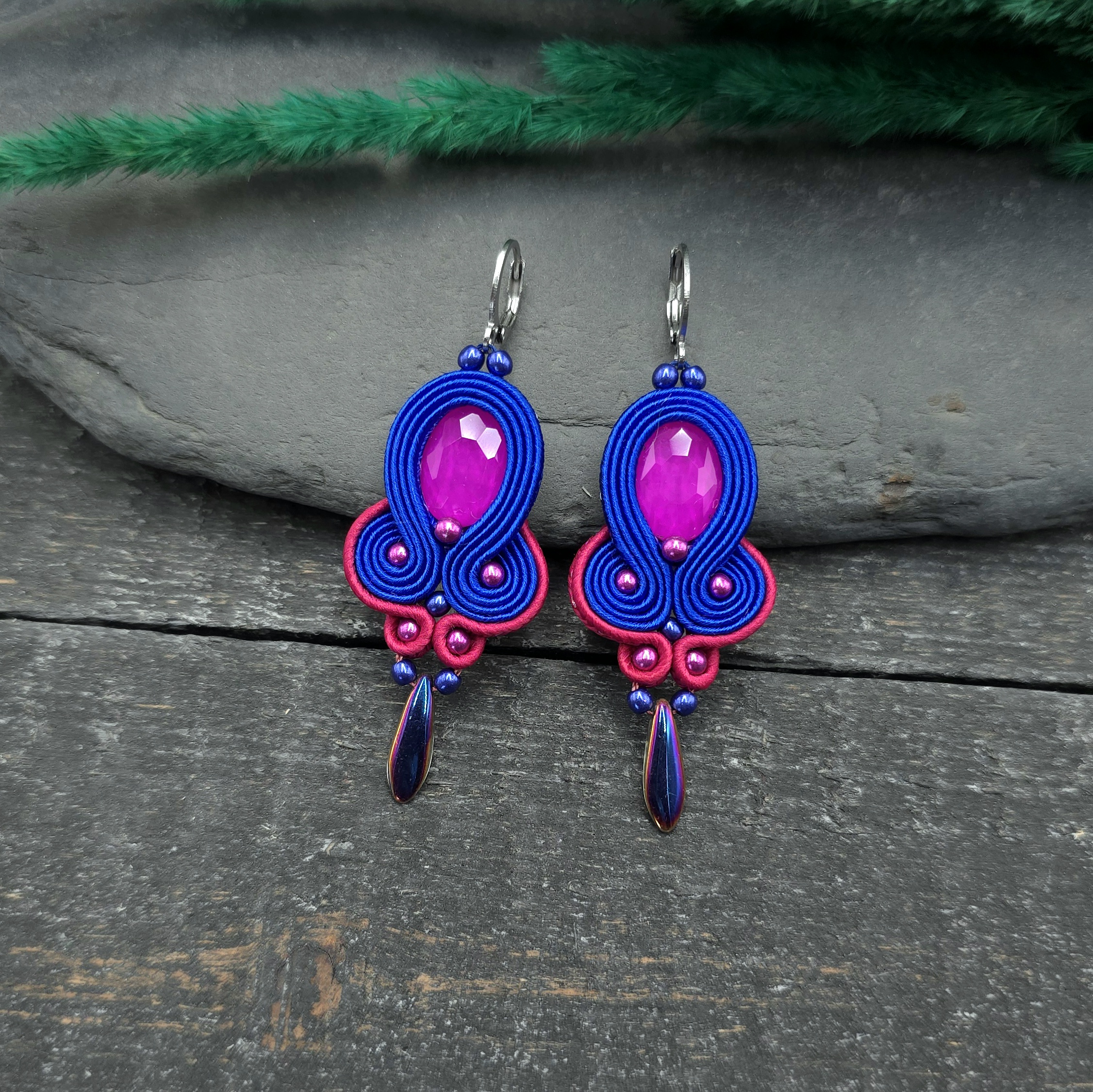 Kolorowe kolczyki wykonane w technice sutasz, z delikatnymi kryształkami i starannym wykończeniem.