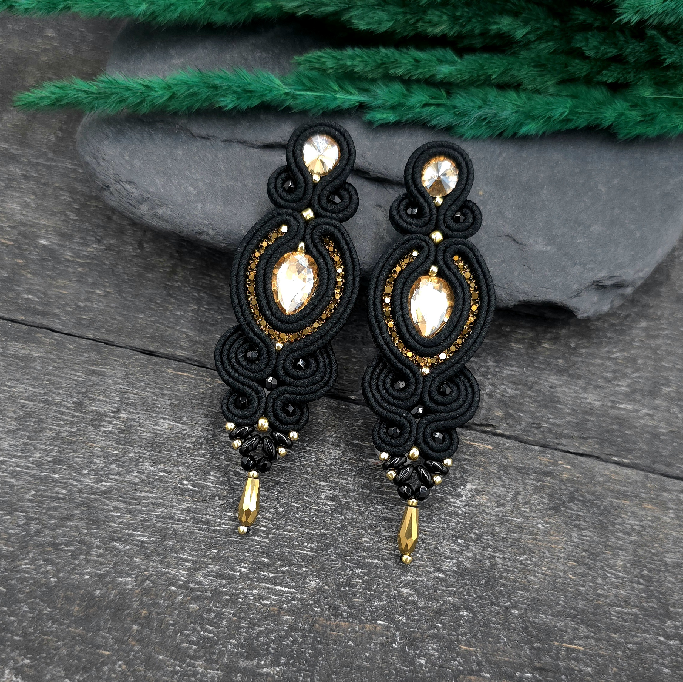 kaboszony kryształki, koraliki Toho, taśma z cyrkoniami, koraliki Fire Polish, koraliki SuperDuo, szklane łezki, polskie sznurki sutasz, sztyfty ze stali chirurgicznej.