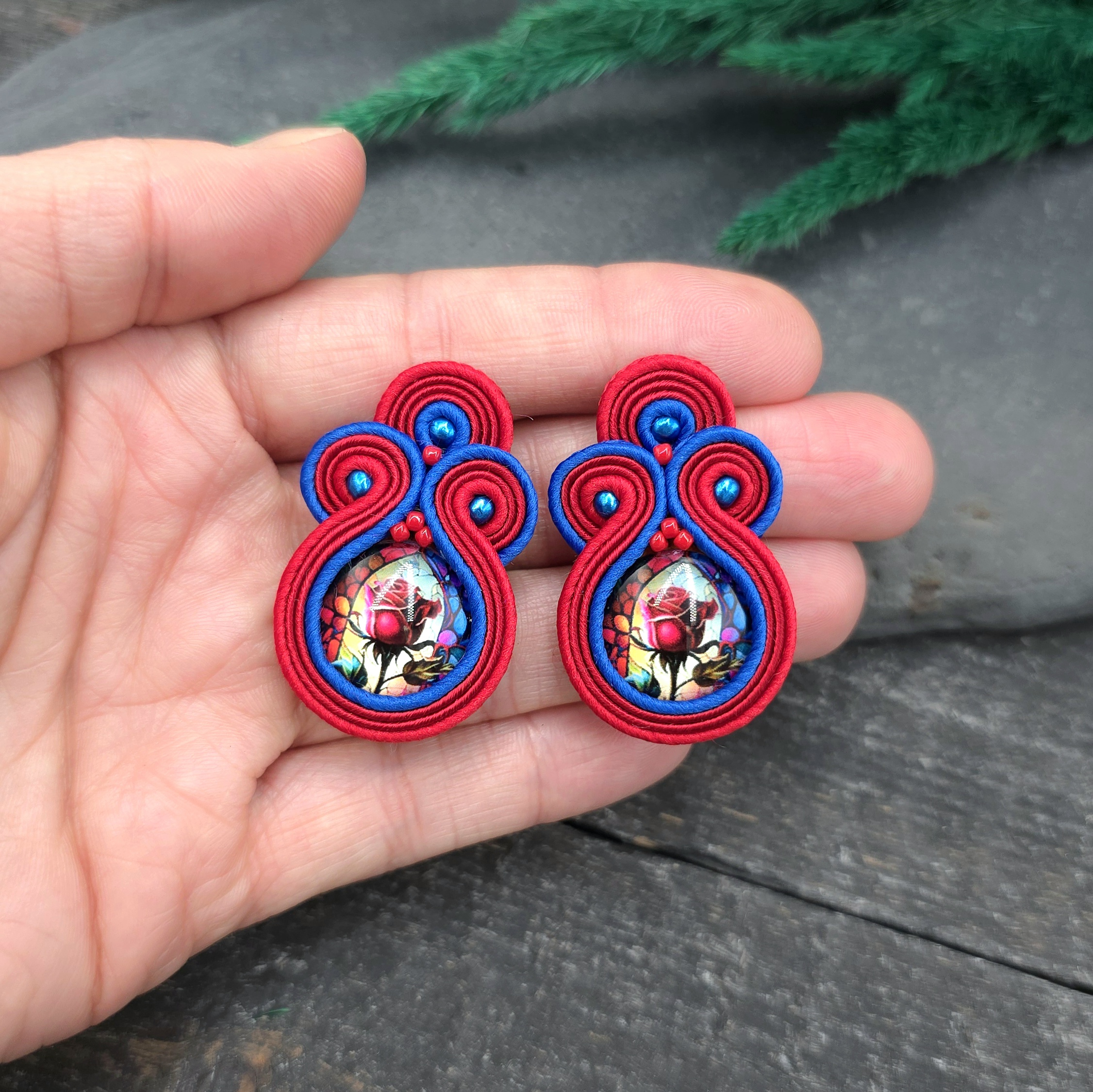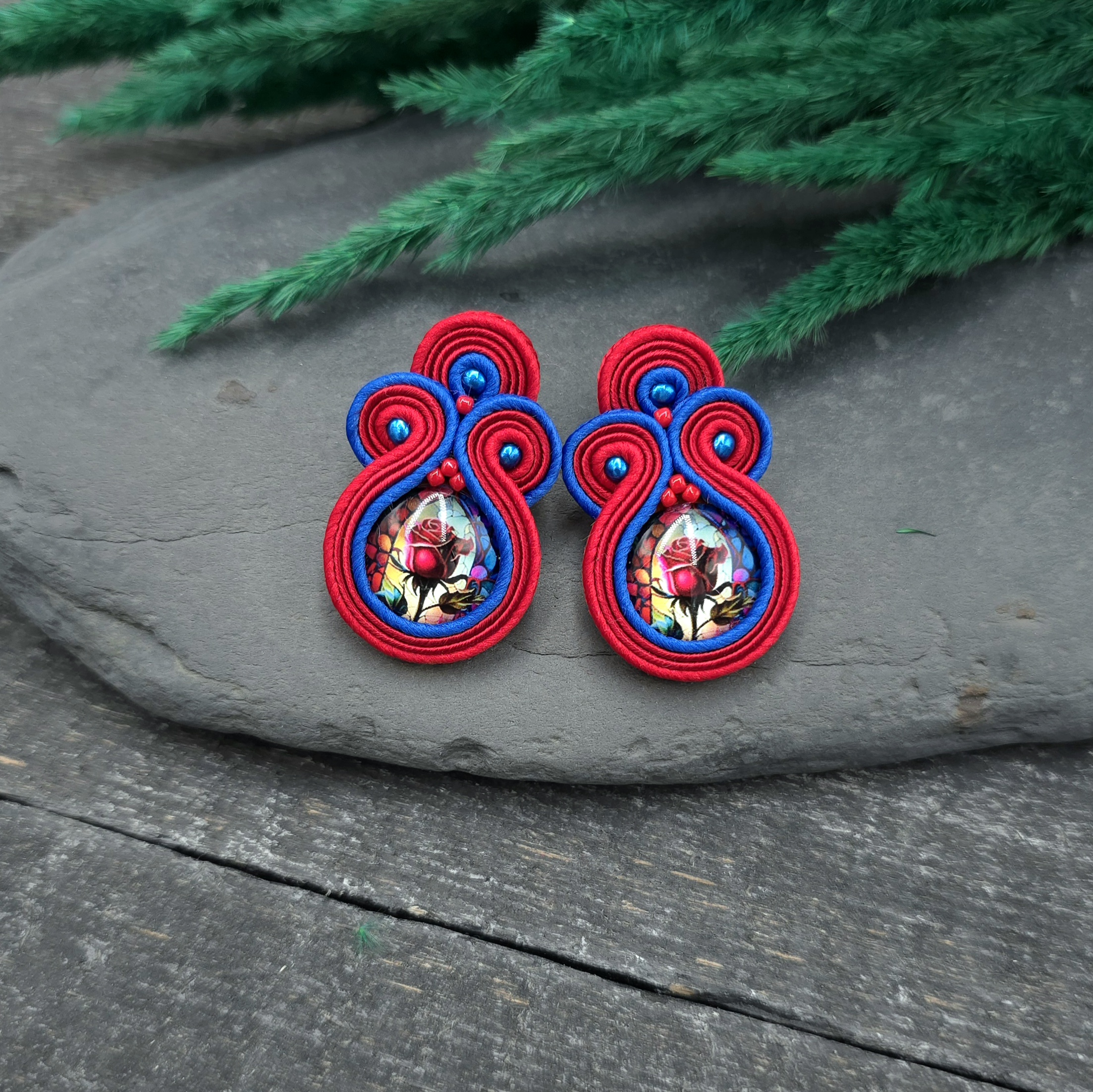 kaboszony z grafiką kwiatów, koraliki Round Beads, koraliki Toho, czeskie i greckie sznurki sutasz, sztyfty ze stali chirurgicznej.