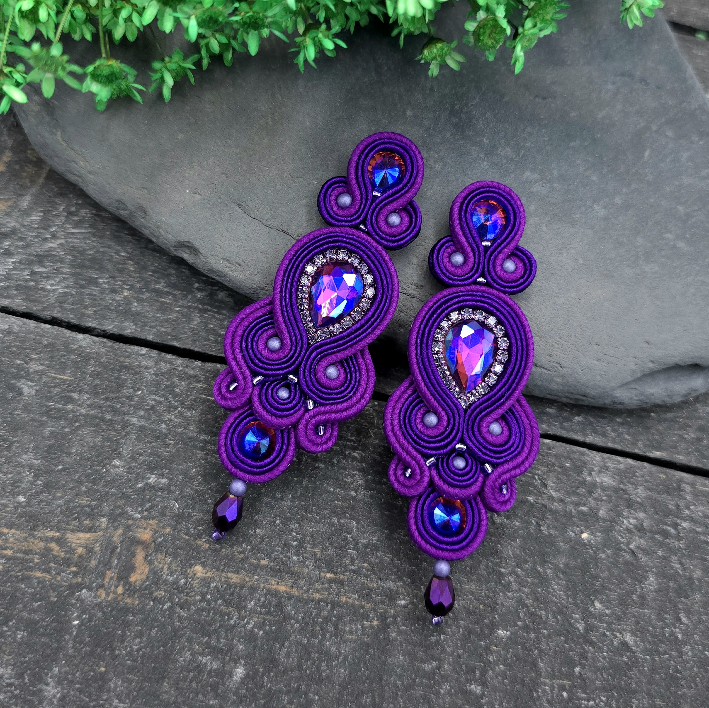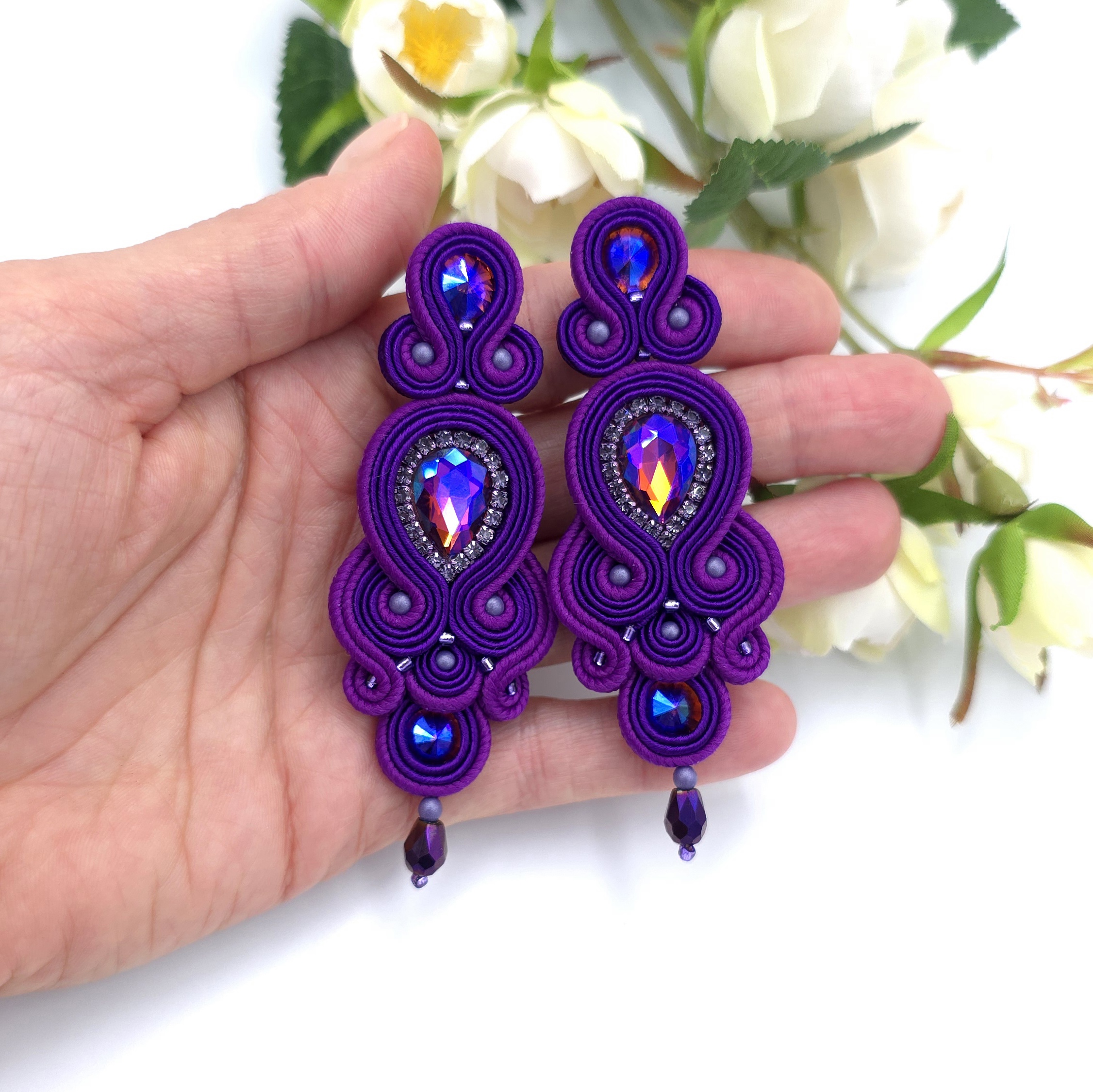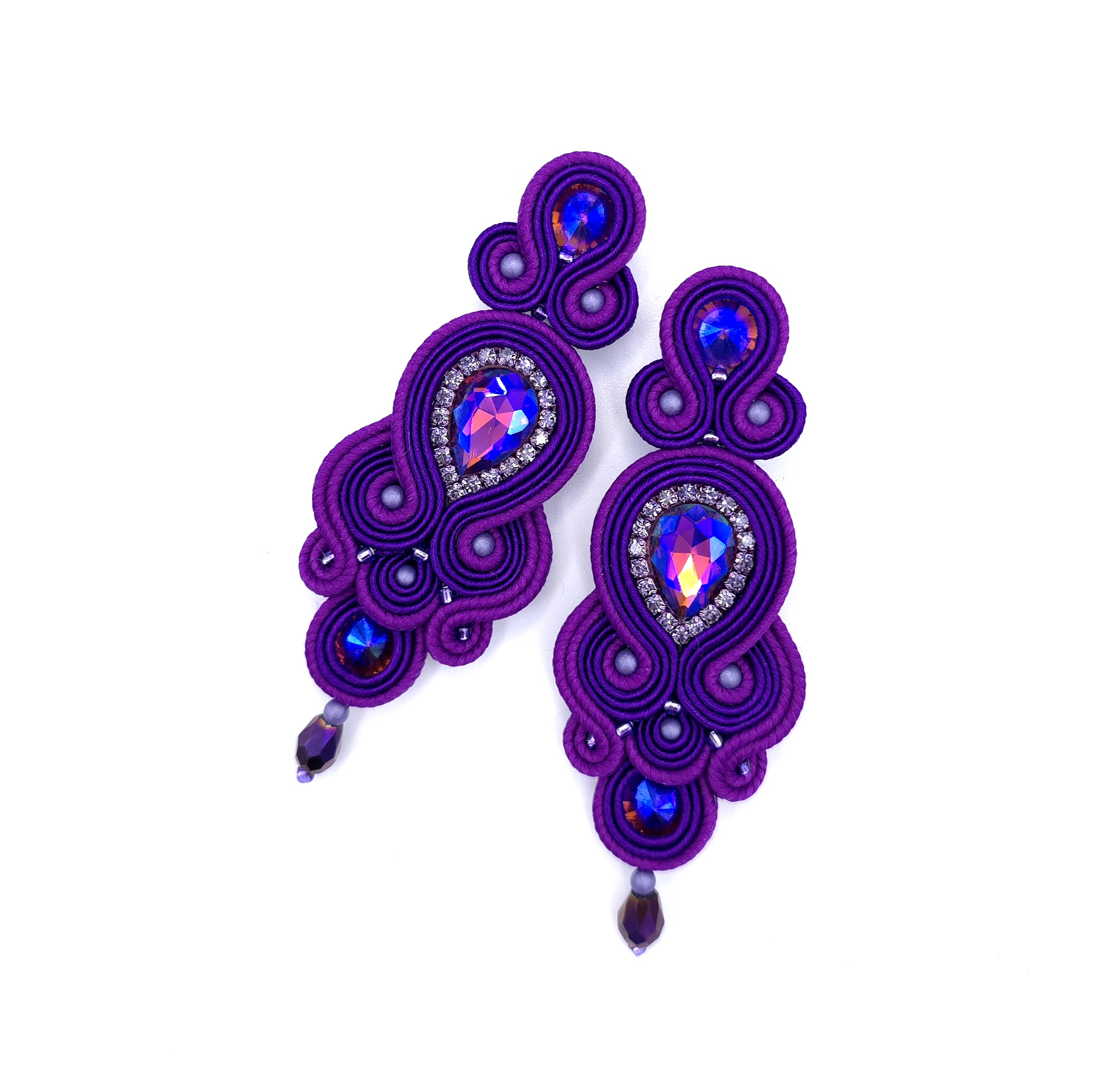 kaboszony kryształki, taśma z cyrkoniami, koraliki Toho, koraliki Round Beads, szklane łezki, czeskie i polskie sznurki sutasz, sztyfty ze stali chirurgicznej.