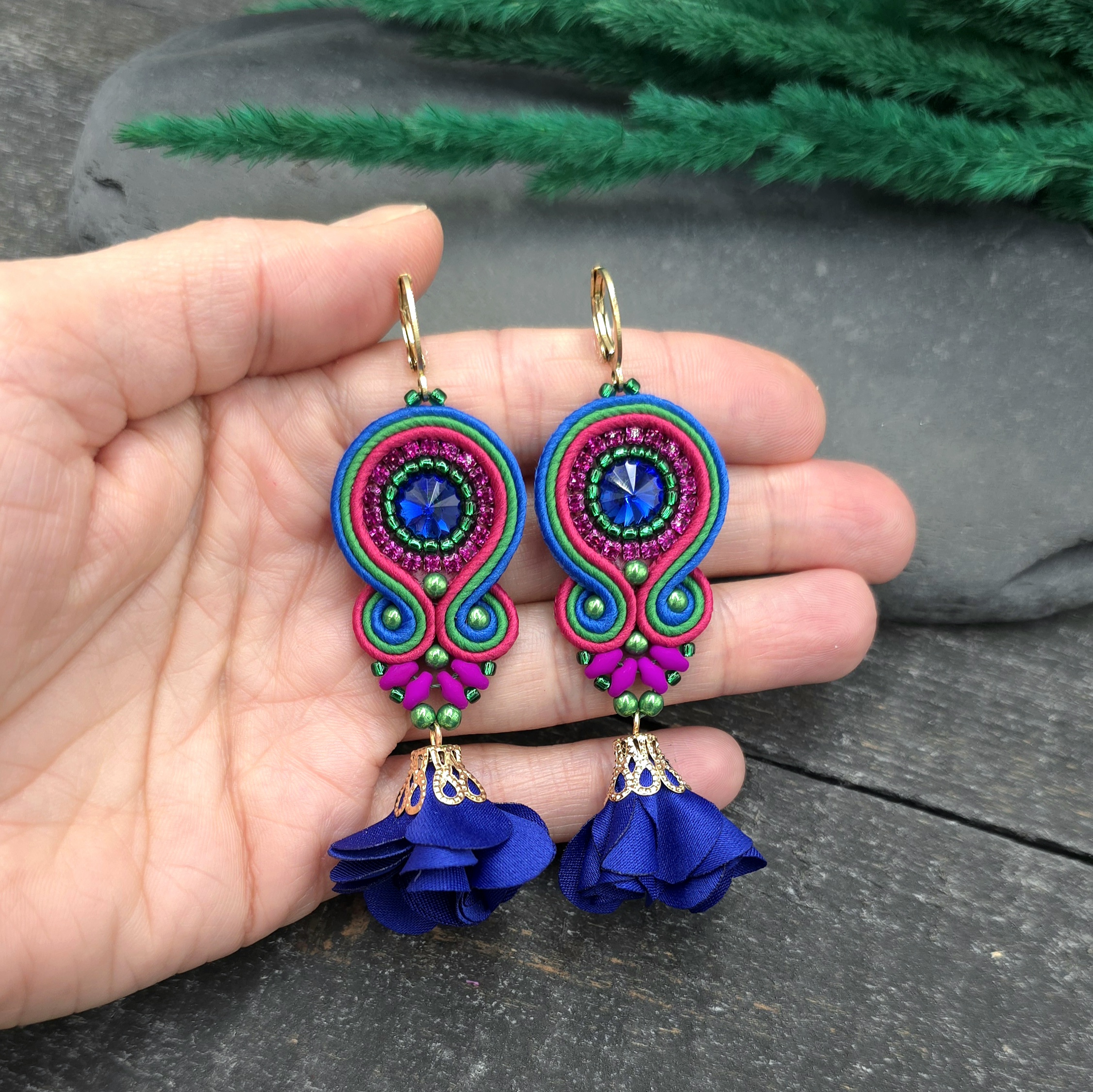 kaboszony kryształki, taśma z cyrkoniami, koraliki Toho, koraliki Round Beads, koraliki SuperDuo, materiałowe kwiatki, greckie sznurki sutasz, bigle ze stali chirurgicznej.