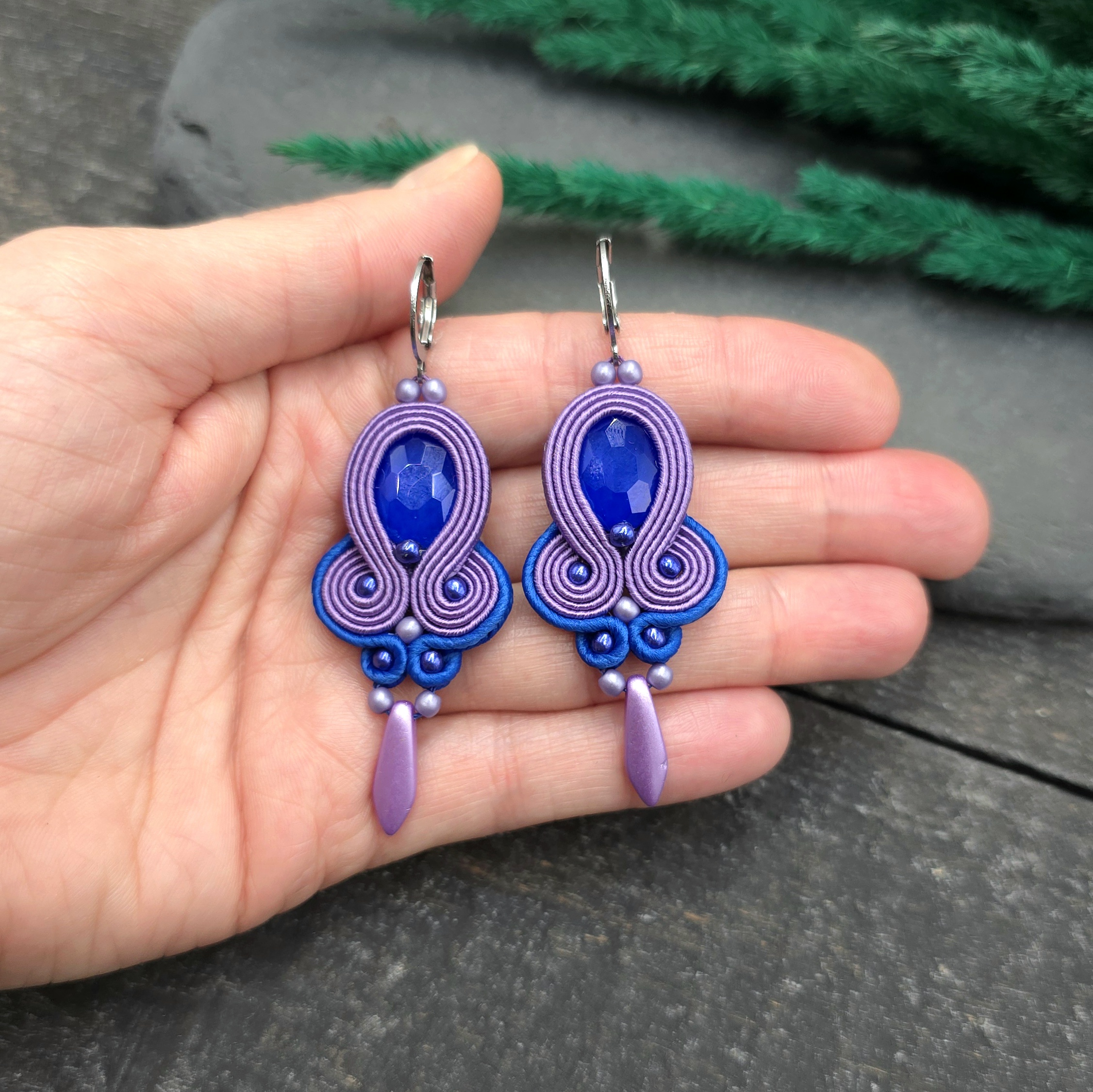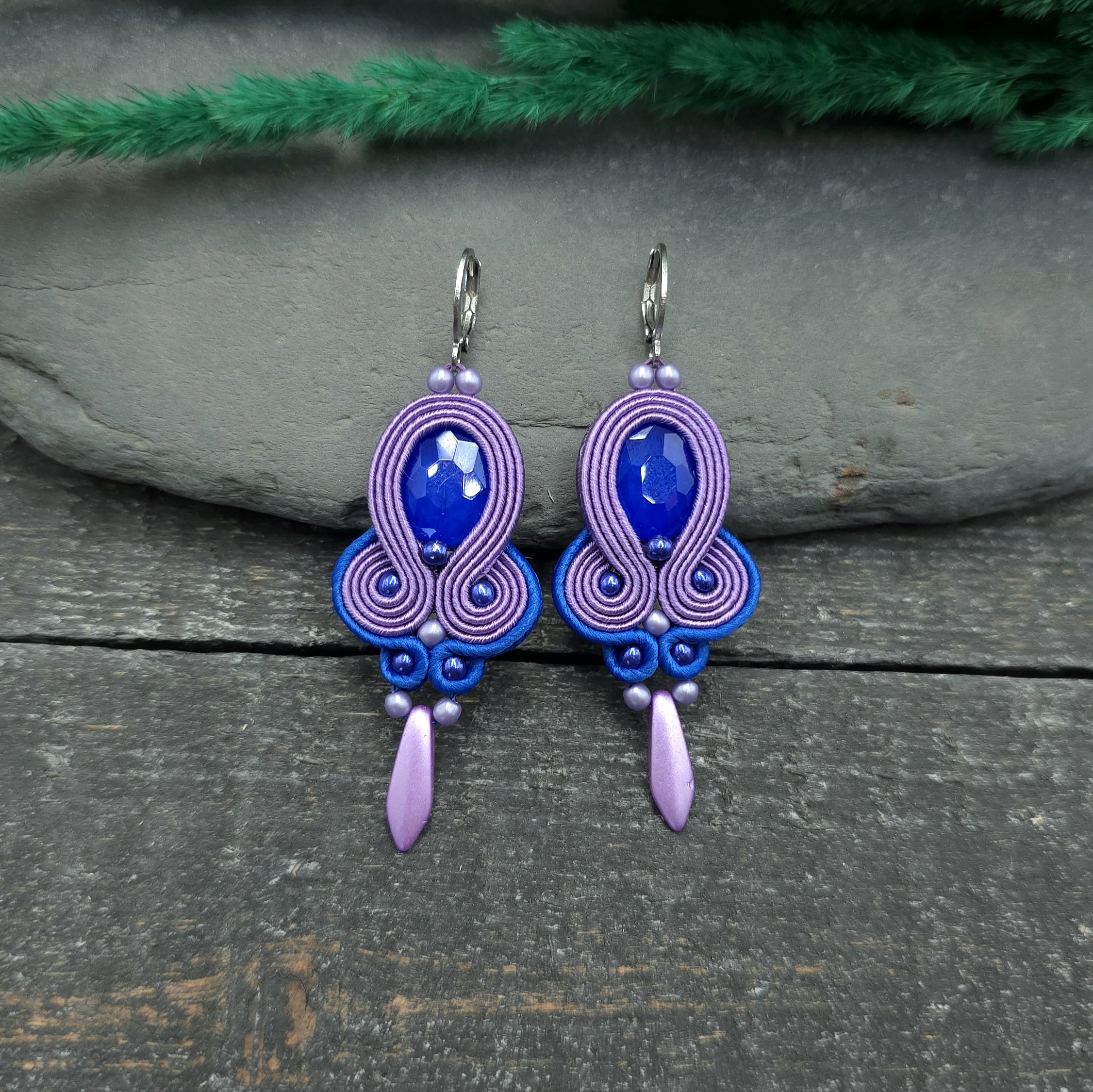 Kolorowe kolczyki wykonane w technice sutasz, z delikatnymi kryształkami i starannym wykończeniem.