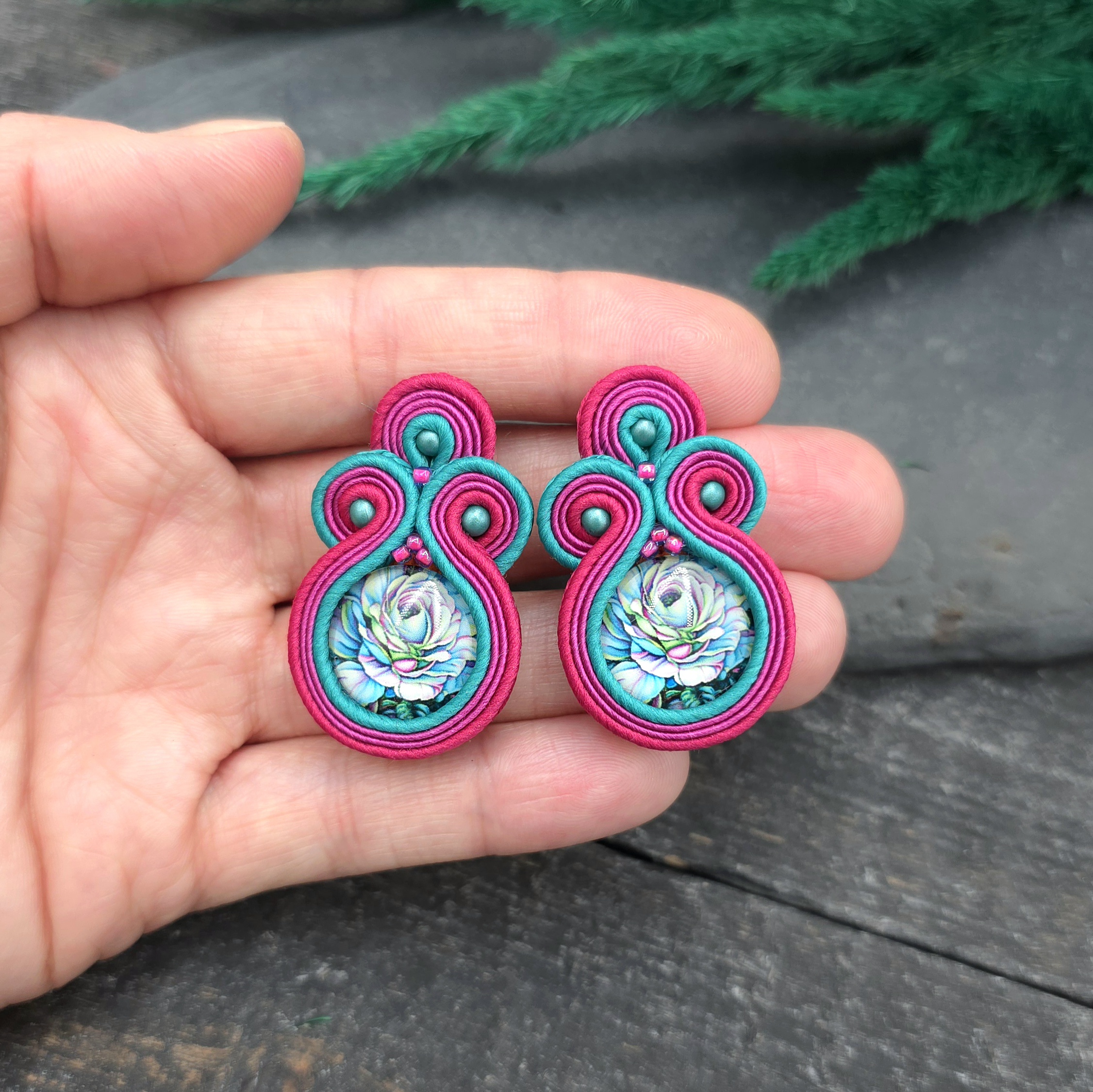 kaboszony z grafiką kwiatów, koraliki Round Beads, koraliki Toho, czeskie i greckie sznurki sutasz, sztyfty ze stali chirurgicznej.