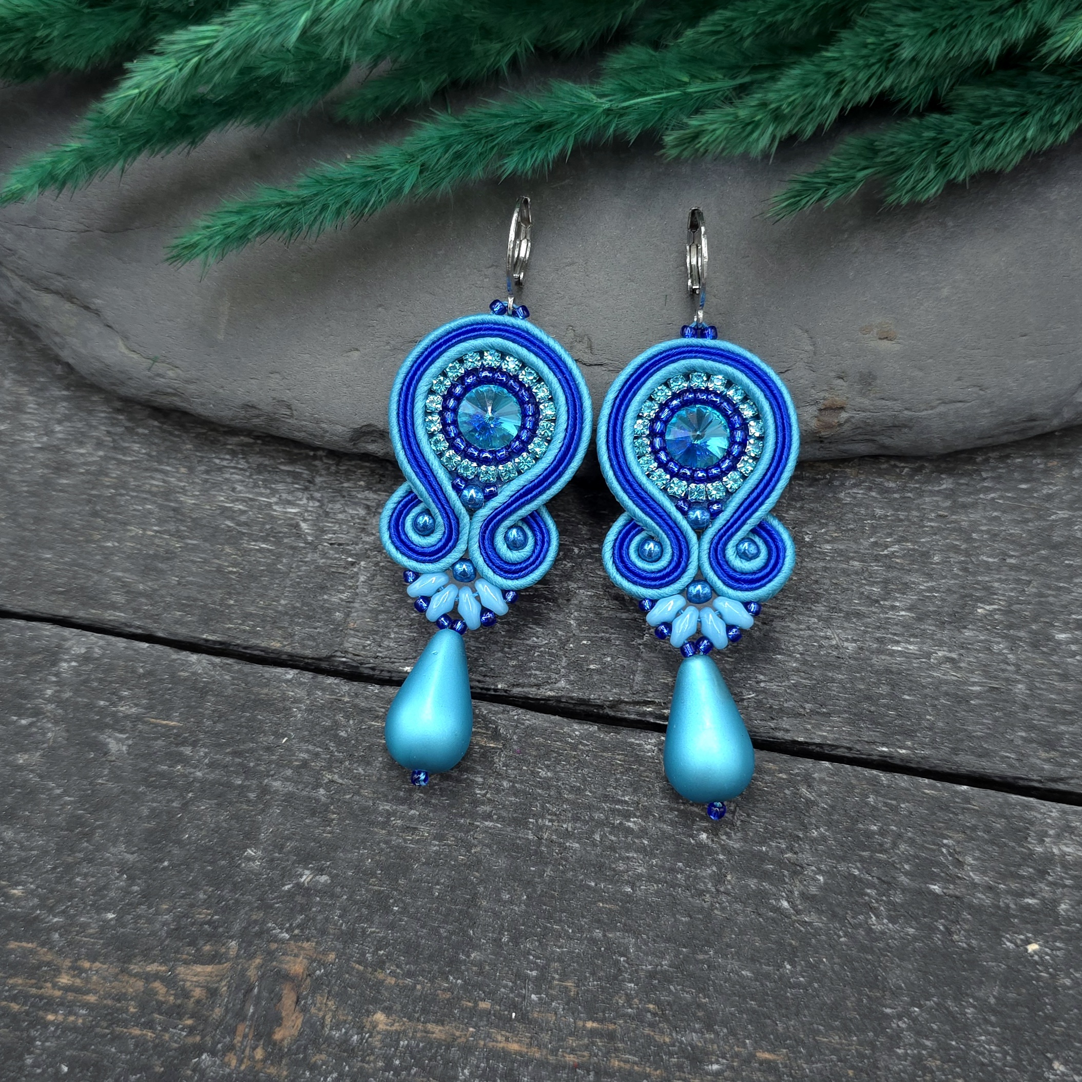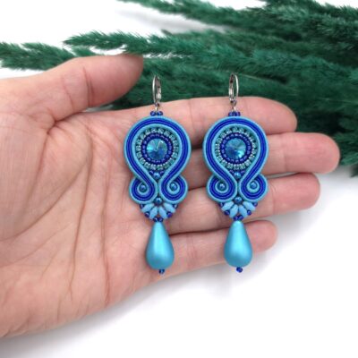 kaboszony kryształki, taśma z cyrkoniami, koraliki Toho, koraliki Round Beads, koraliki SuperDuo, duże szklane łezki DropBeads, greckie i czeskie sznurki sutasz, bigle ze stali chirurgicznej.