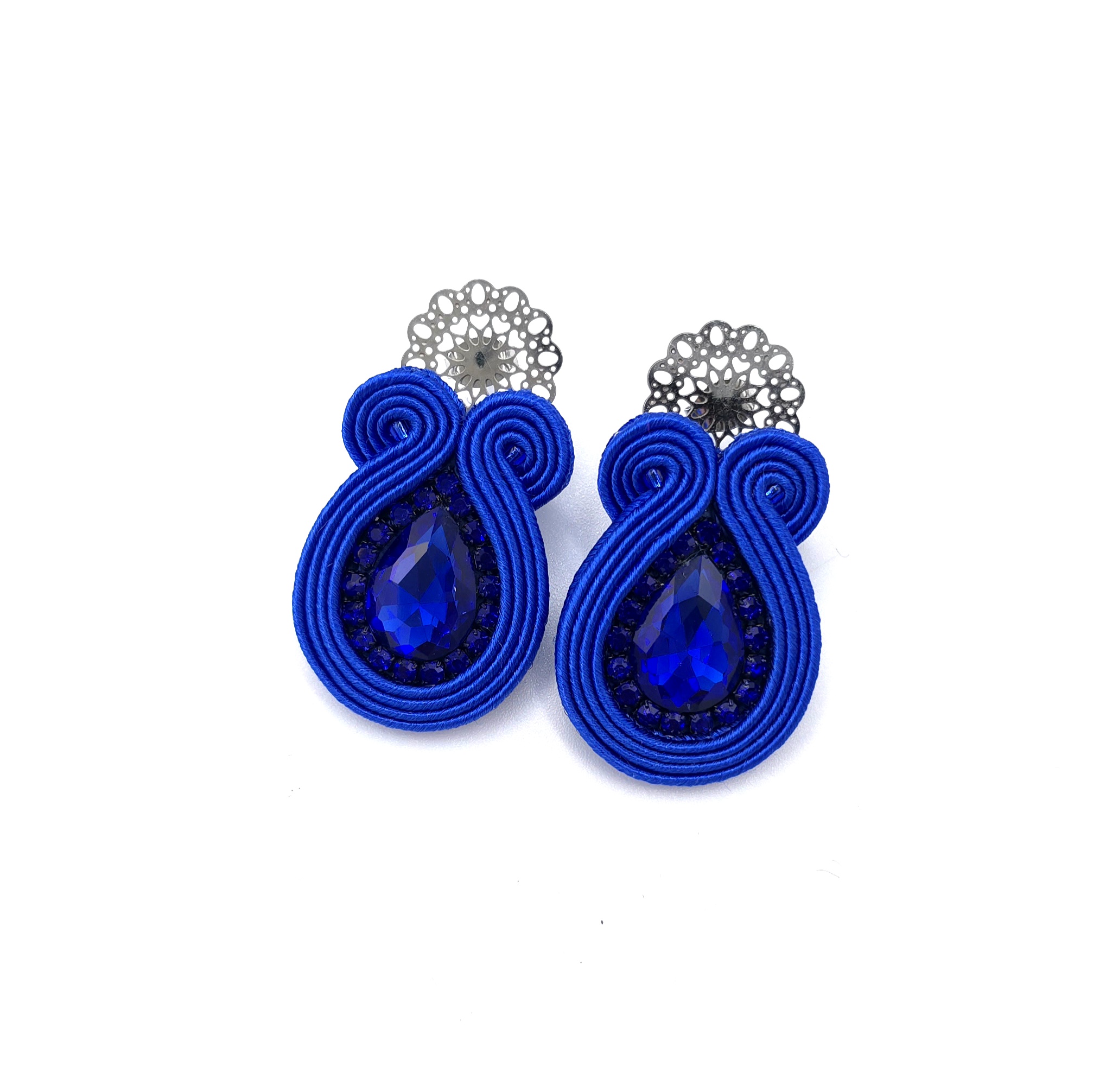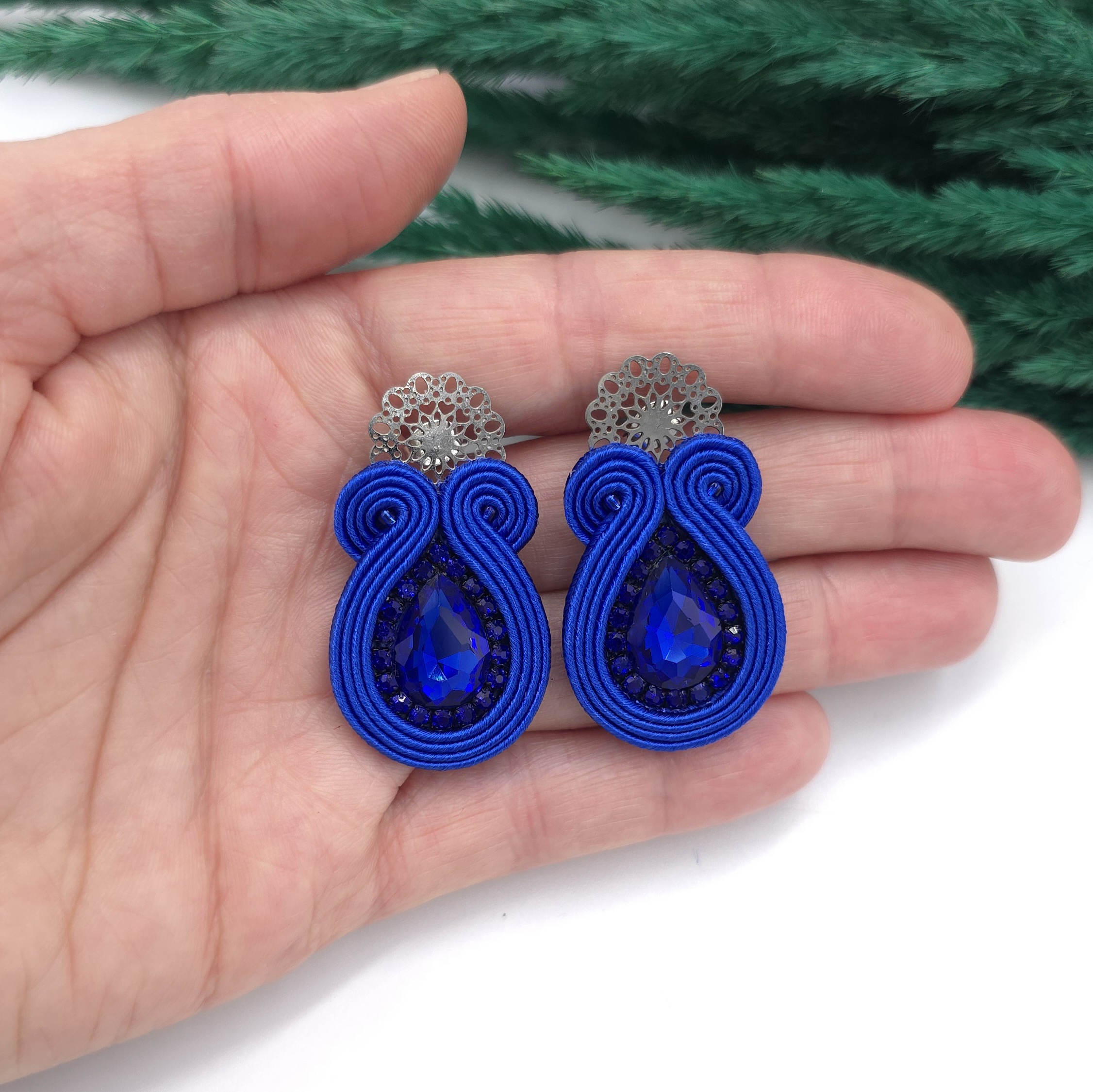kaboszony kryształki, taśma z cyrkoniami, koraliki Toho, czeskie sznurki sutasz, sztyfty kwiatki ze stali chirurgicznej.