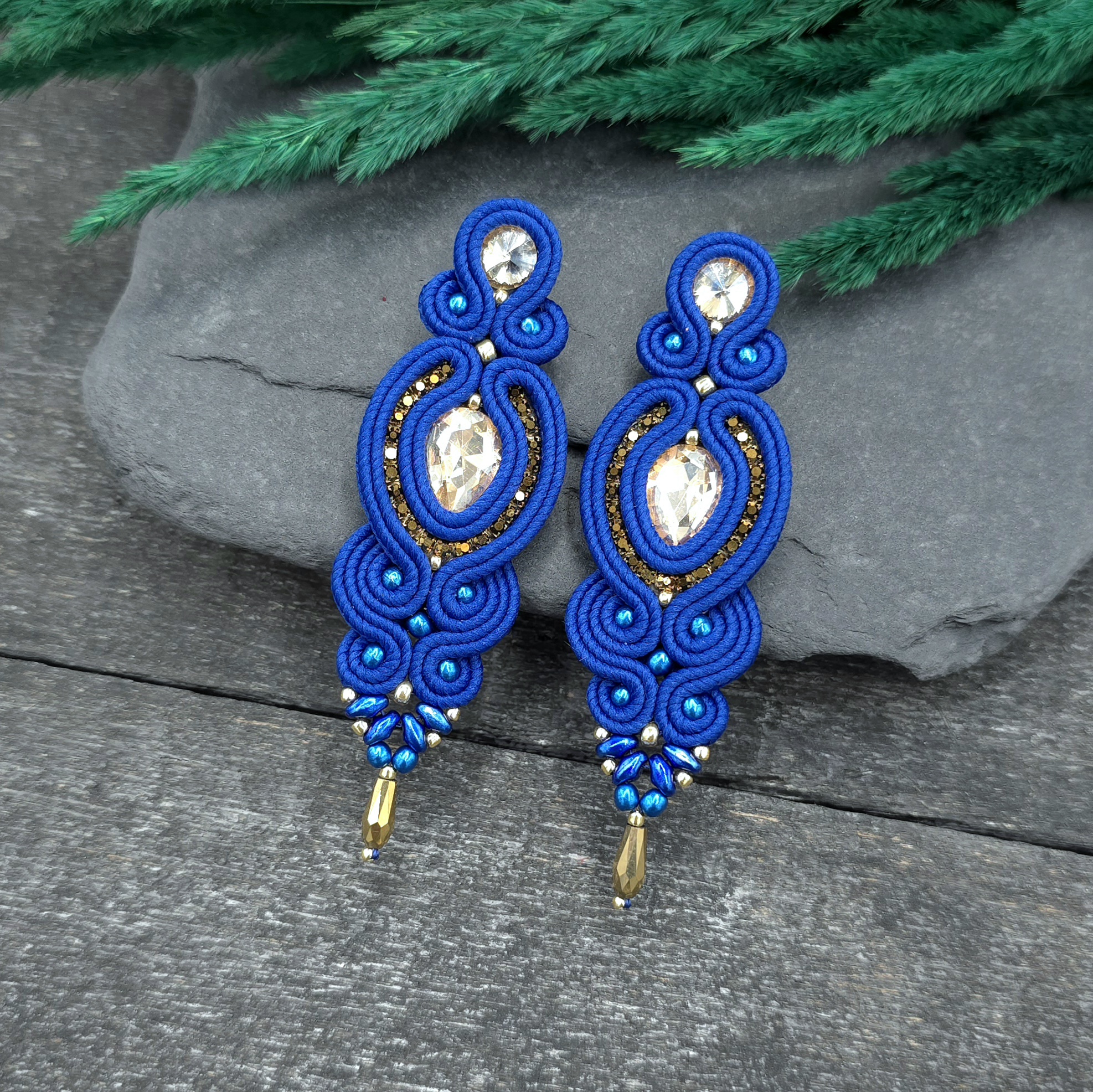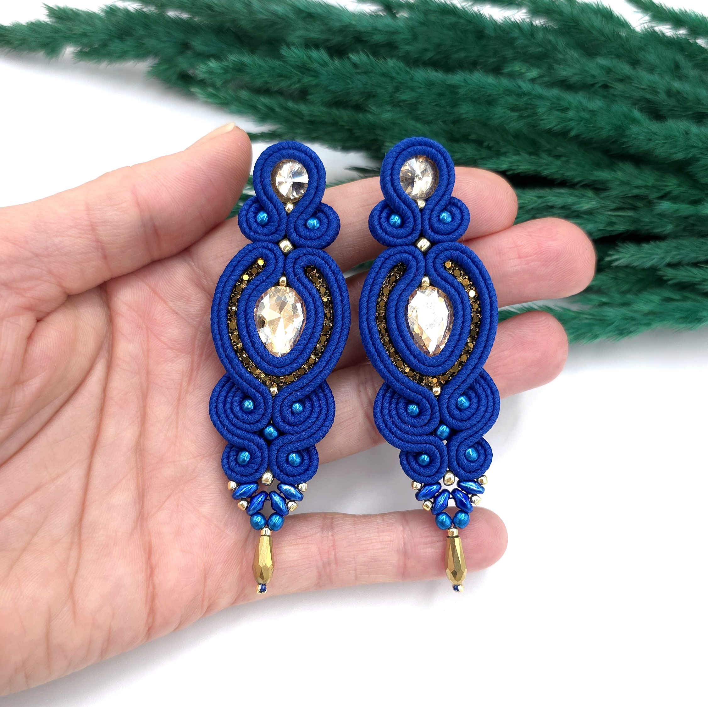 kaboszony kryształki, koraliki Toho, taśma z cyrkoniami, koraliki Round Beads, koraliki SuperDuo, szklane łezki, polskie sznurki sutasz, sztyfty ze stali chirurgicznej.