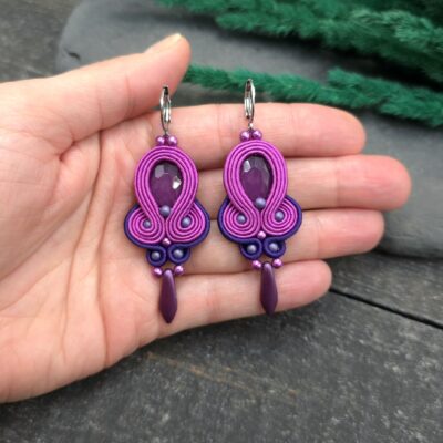 Kolorowe kolczyki wykonane w technice sutasz, z delikatnymi kryształkami i starannym wykończeniem.