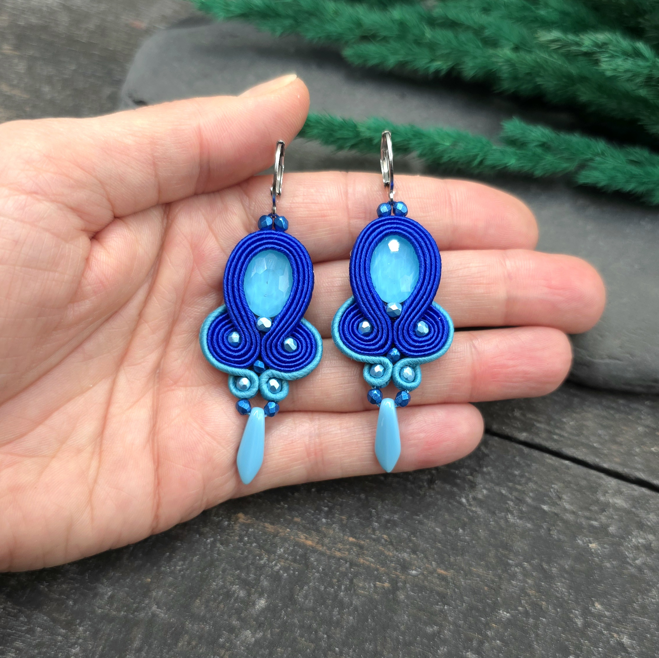 Kolorowe kolczyki wykonane w technice sutasz, z delikatnymi kryształkami i starannym wykończeniem.