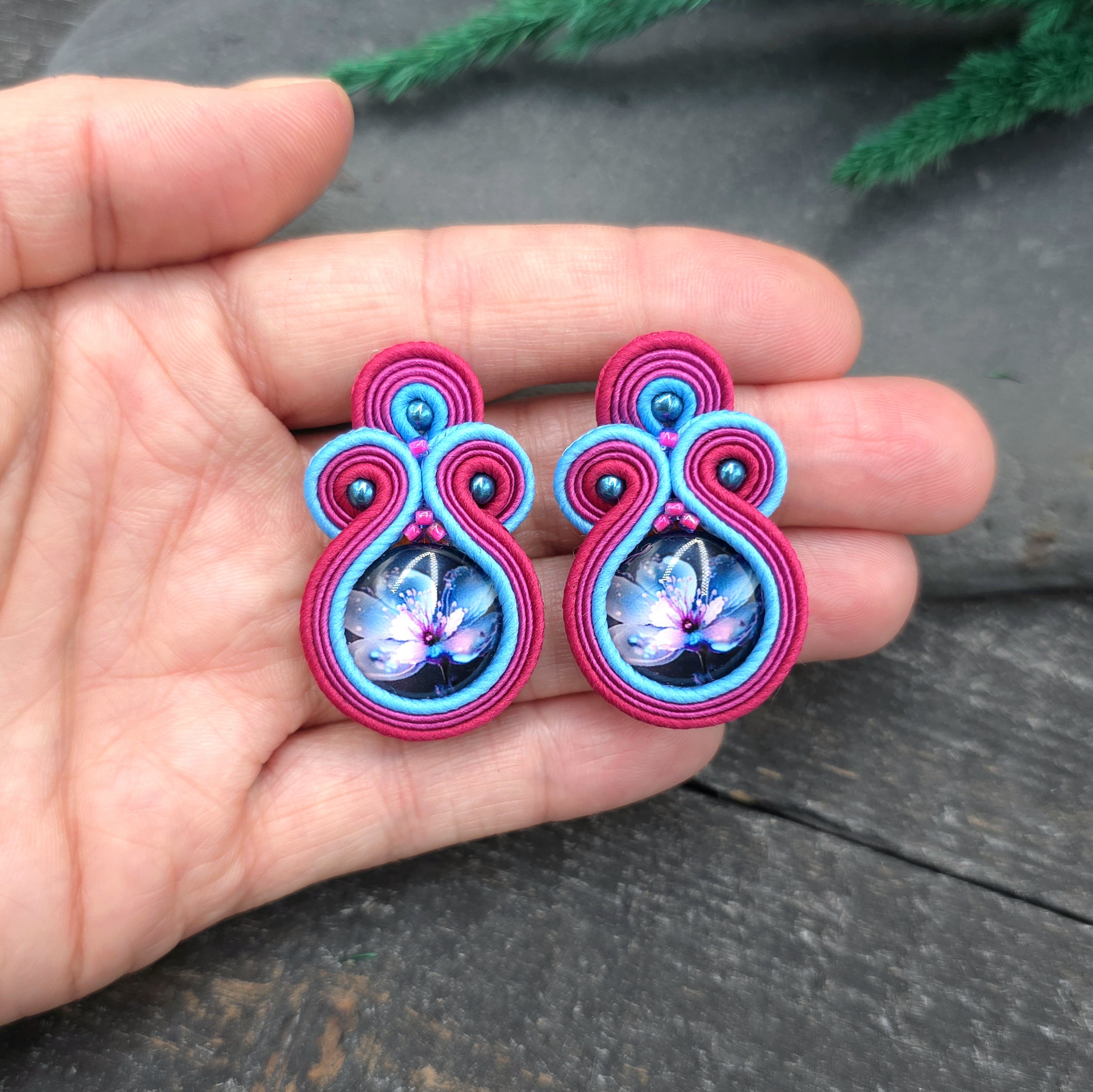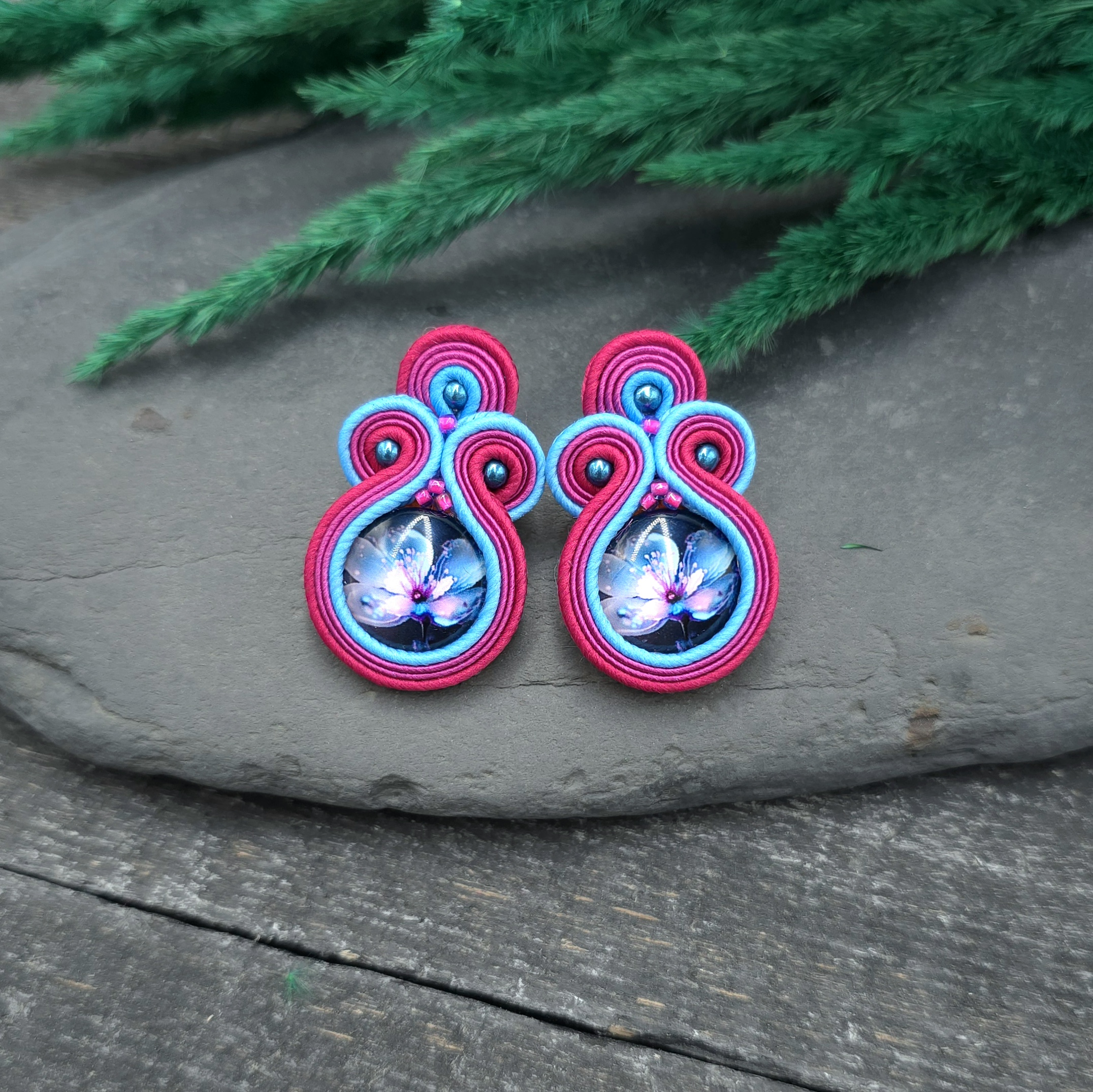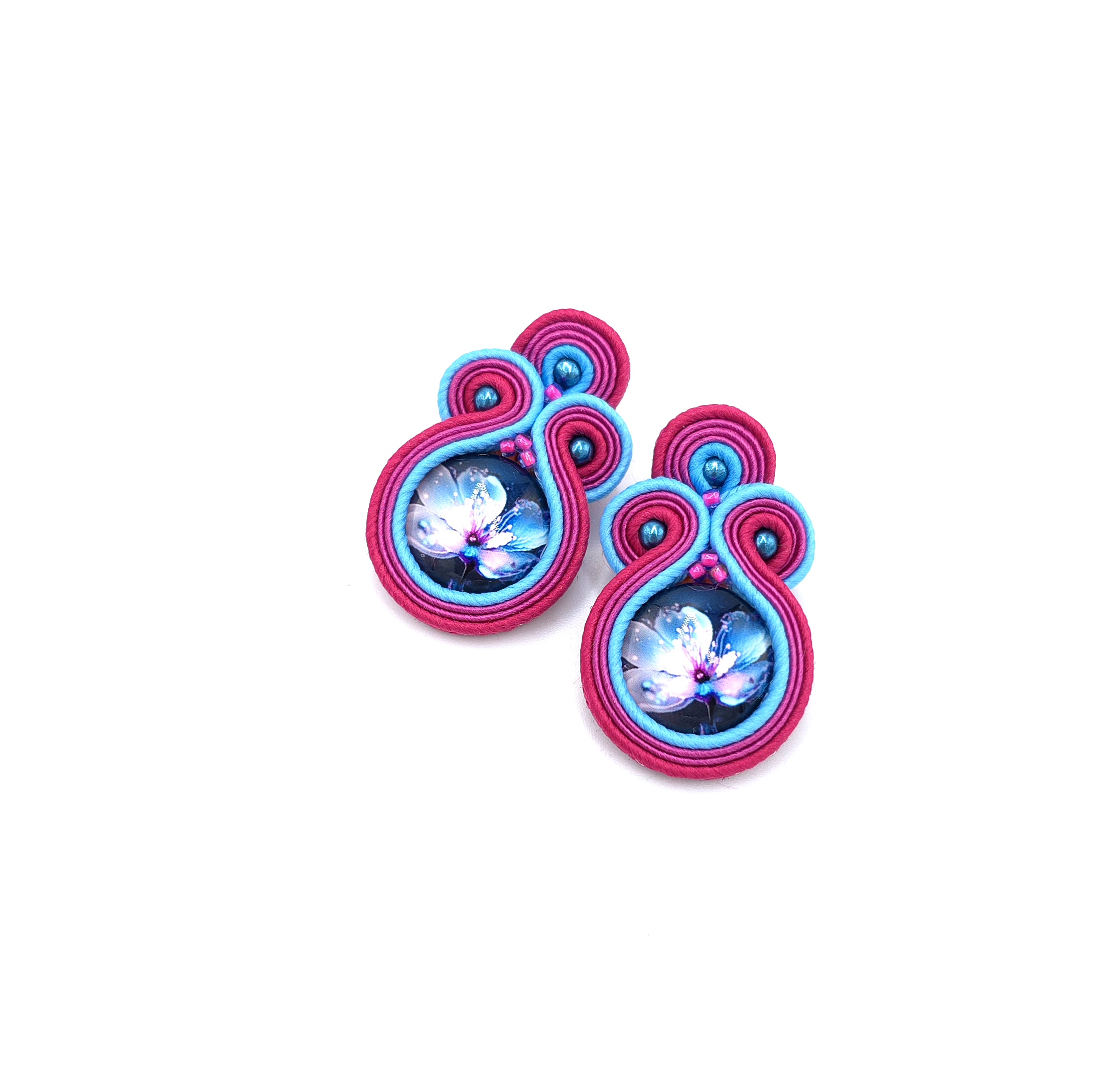 kaboszony z grafiką kwiatów, koraliki Round Beads, koraliki Toho, czeskie i greckie sznurki sutasz, sztyfty ze stali chirurgicznej.