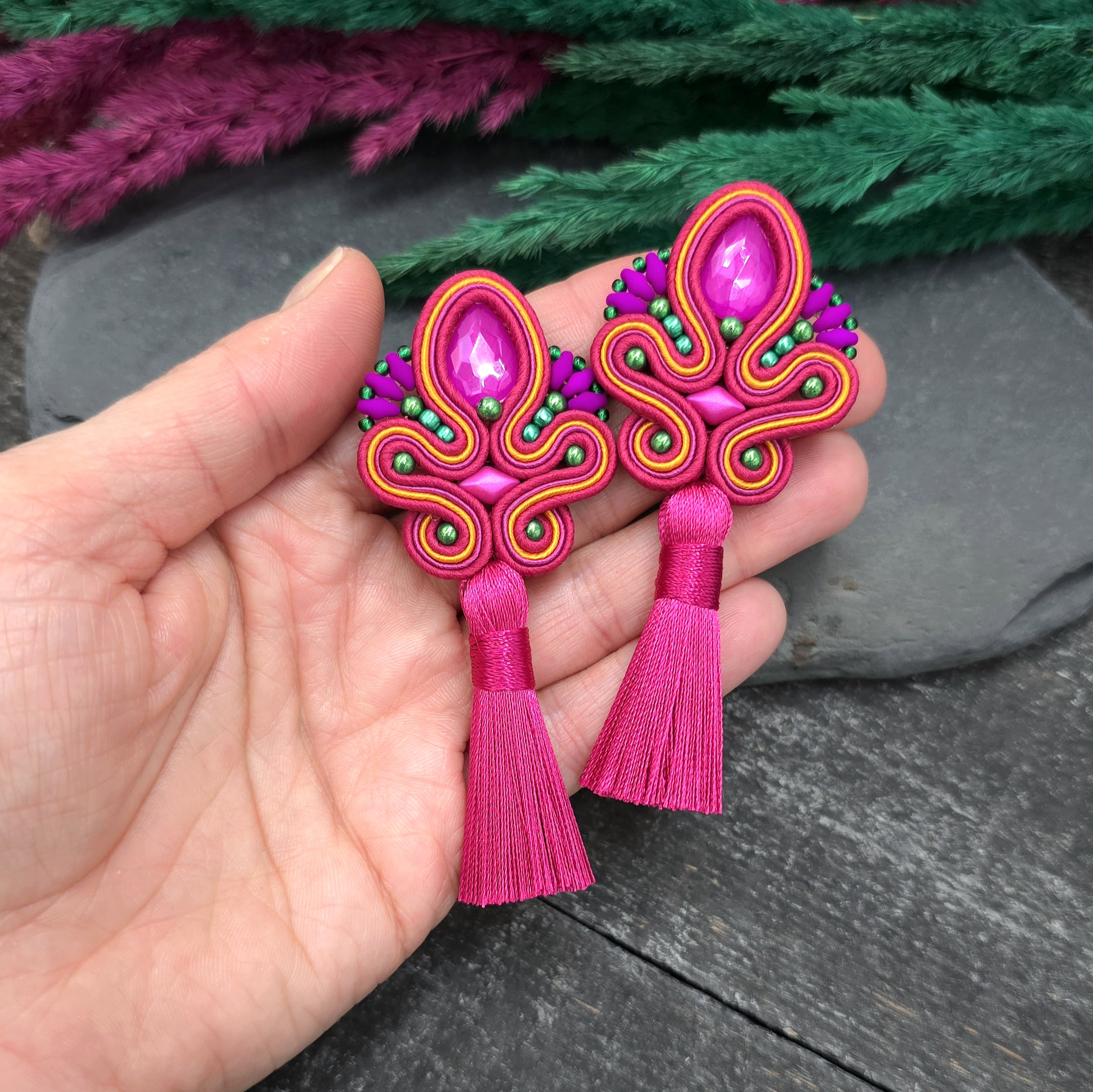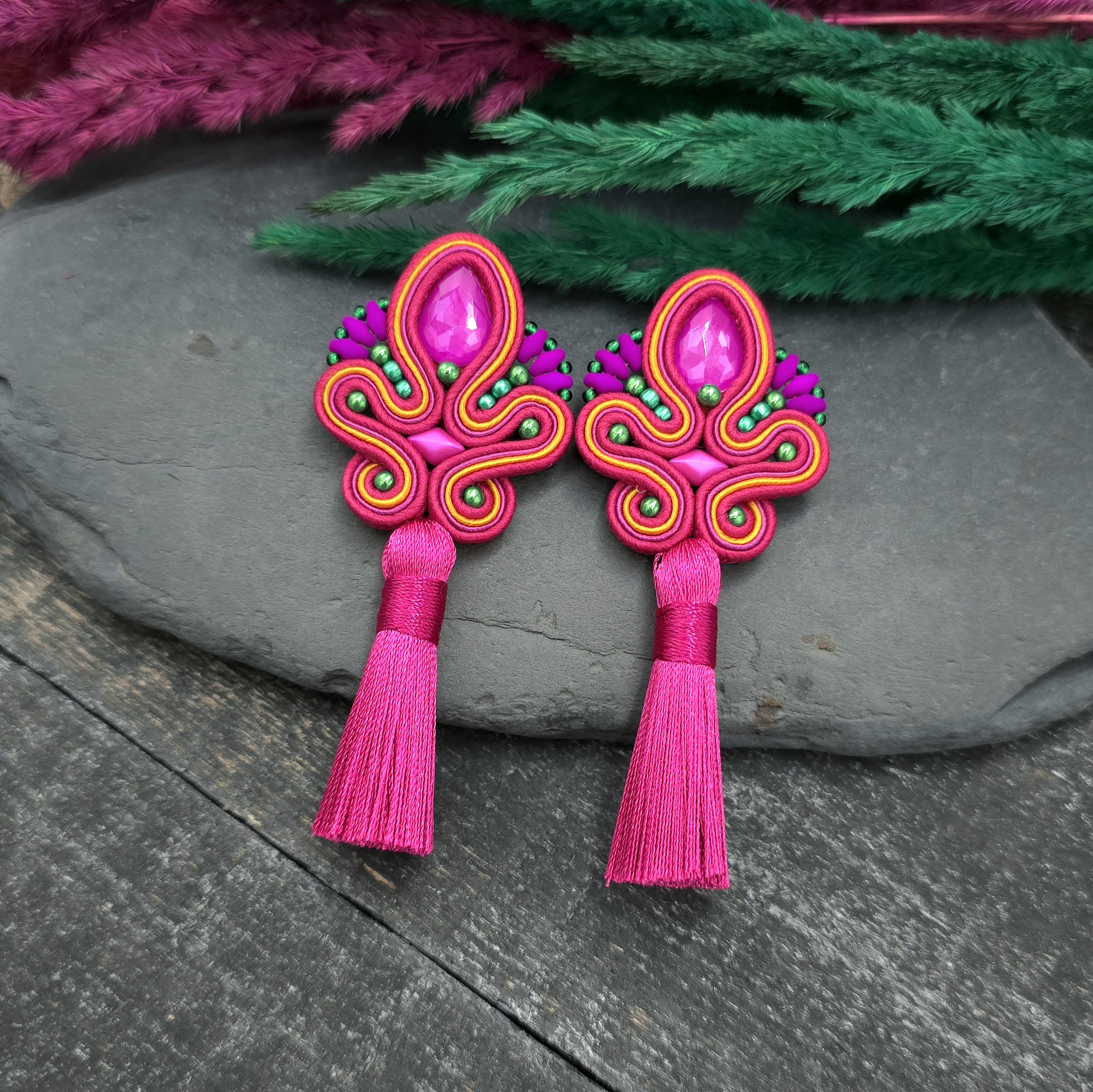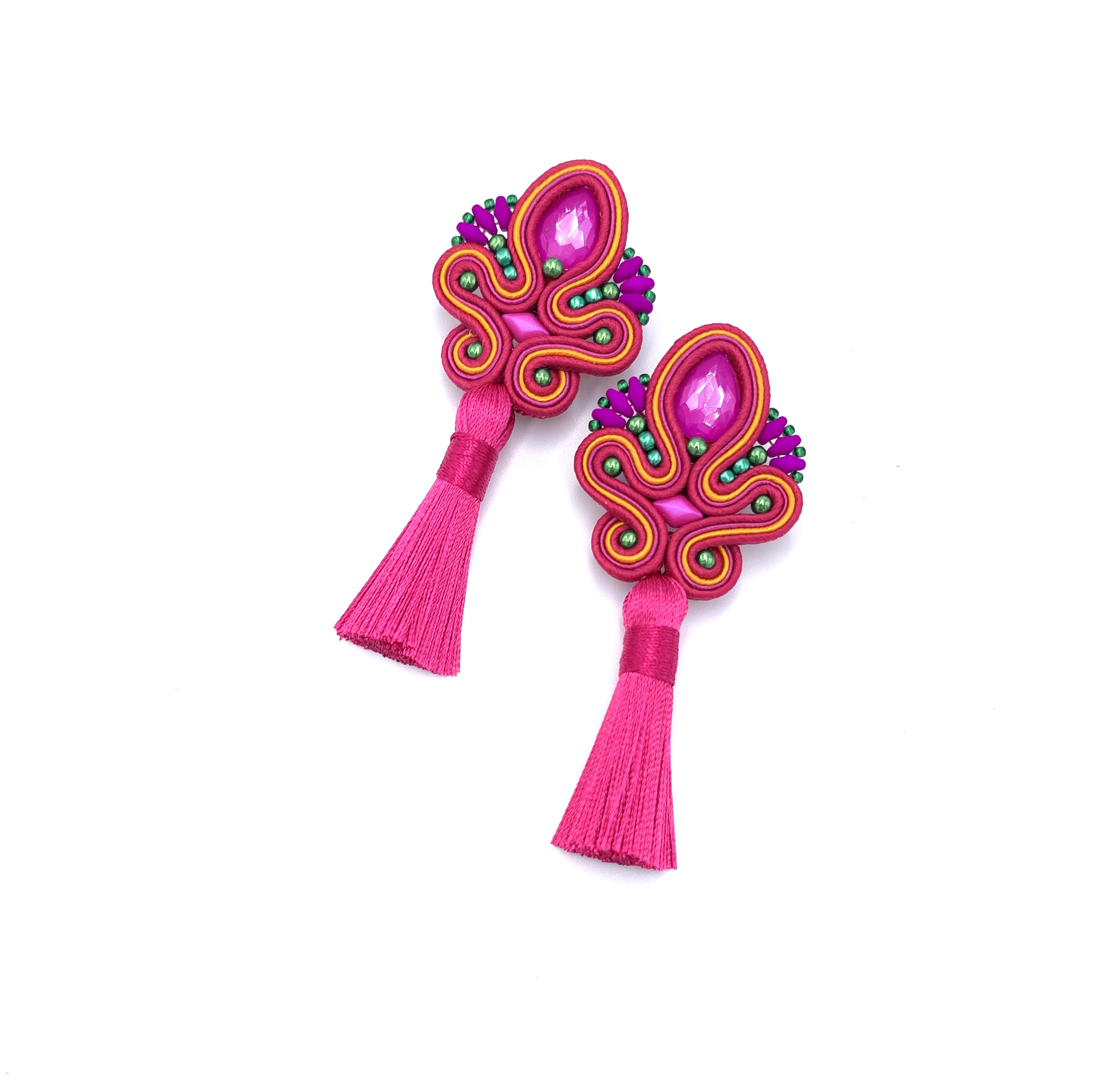 Kolczyki sutasz z chwostami to ręcznie wykonana biżuteria, w której precyzyjny splot i duża ilość drobnych koralików tworzą pozytywną kompozycję.