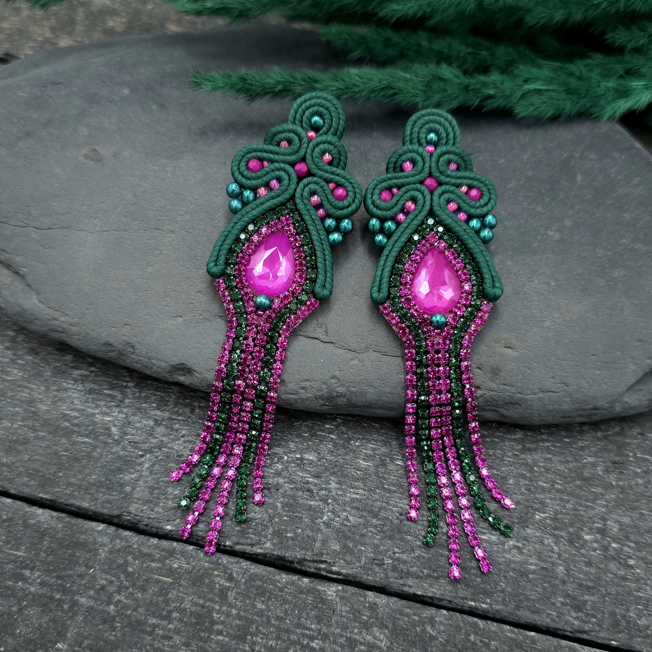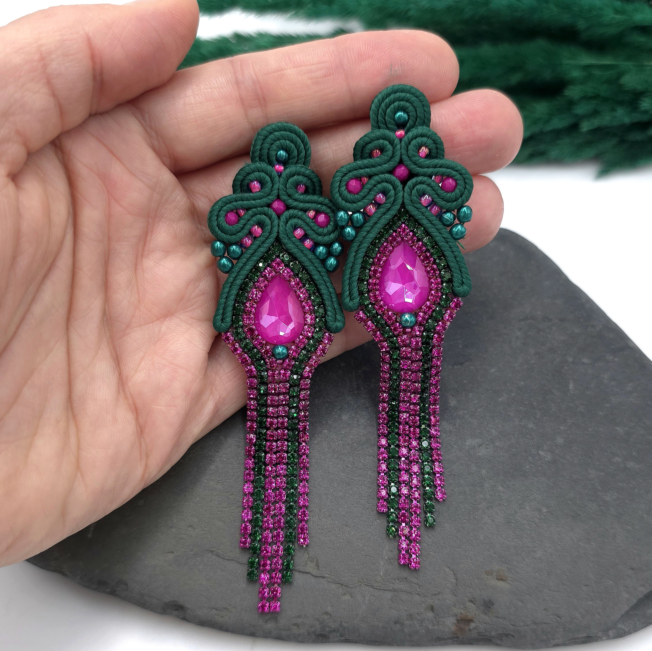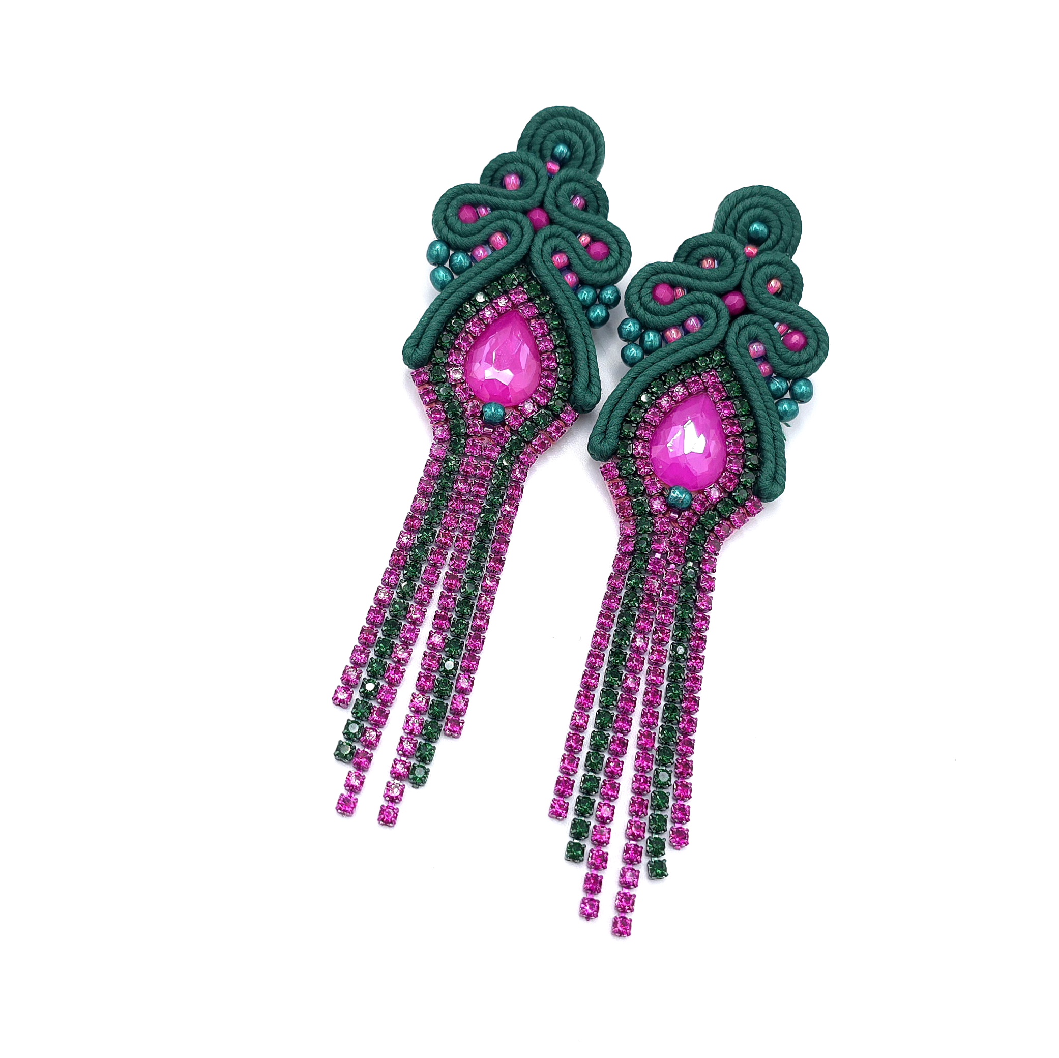 Długie kolczyki sutasz w kolorze zielono-fuksjowym to wyjątkowa propozycja na wieczorowe wyjścia i karnawałowe stylizacje.