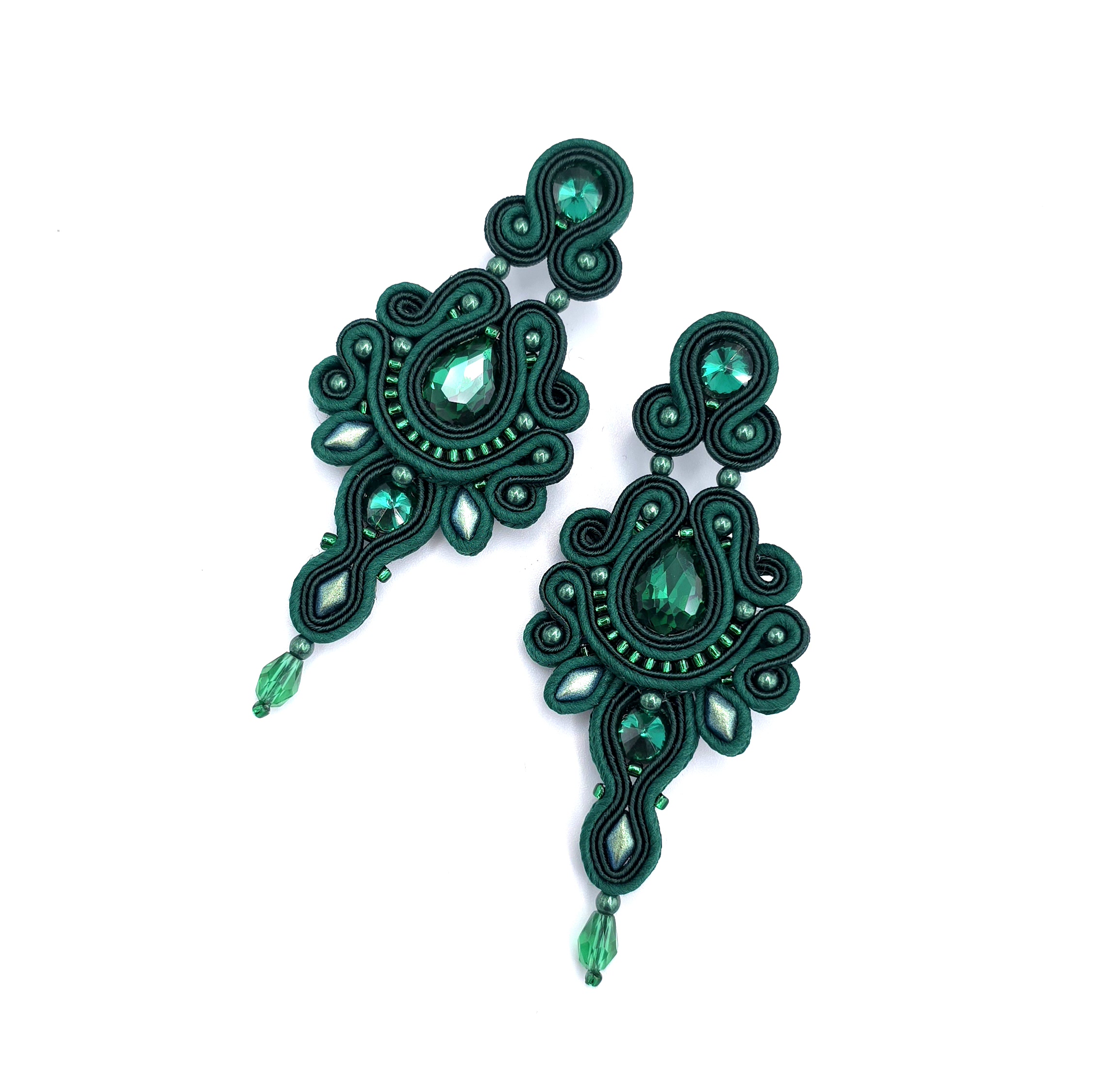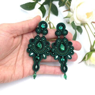Wieczorowe kolczyki, o podłużnej, rozbudowanej pośrodku formie niczym kwiat.
