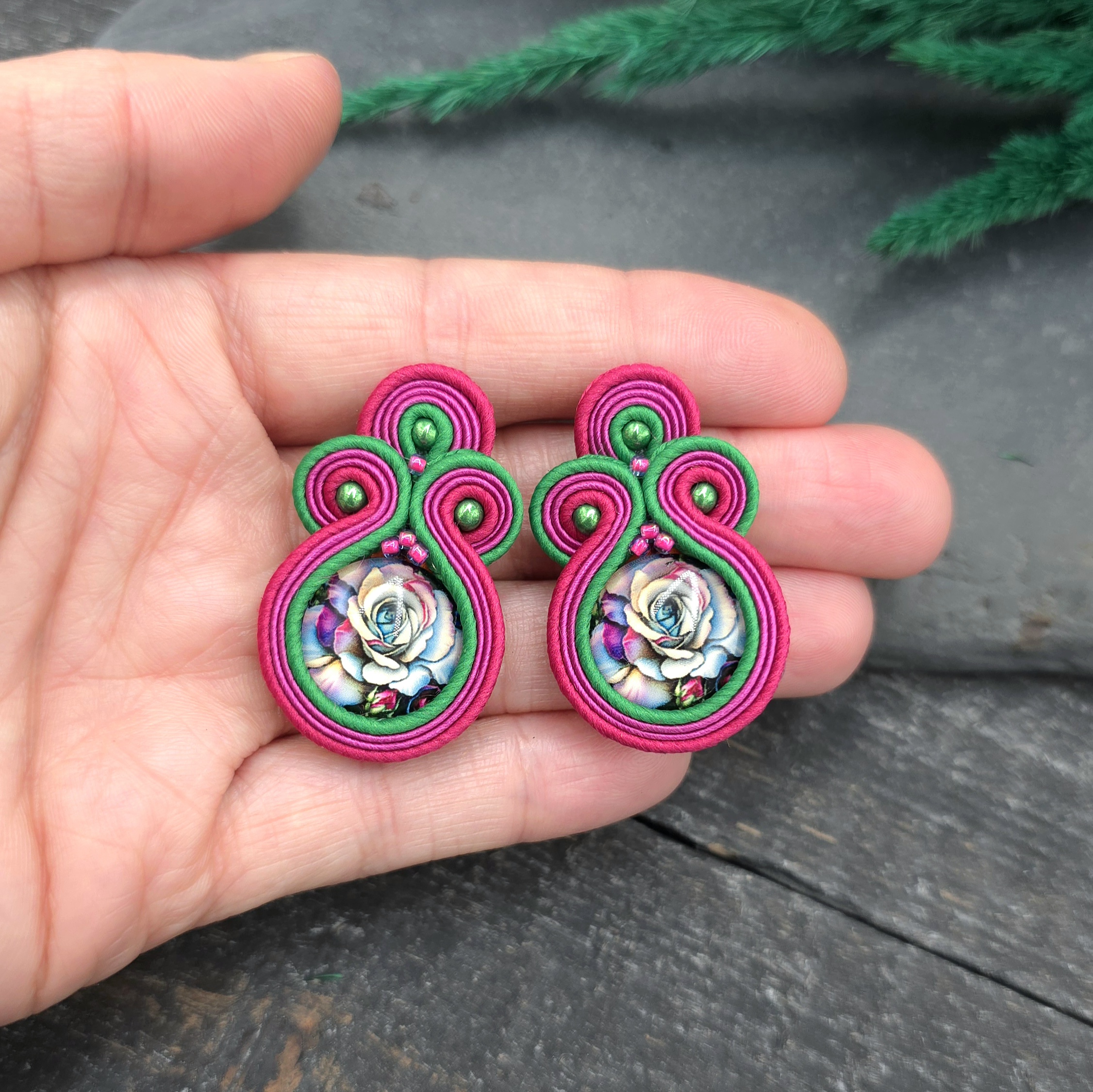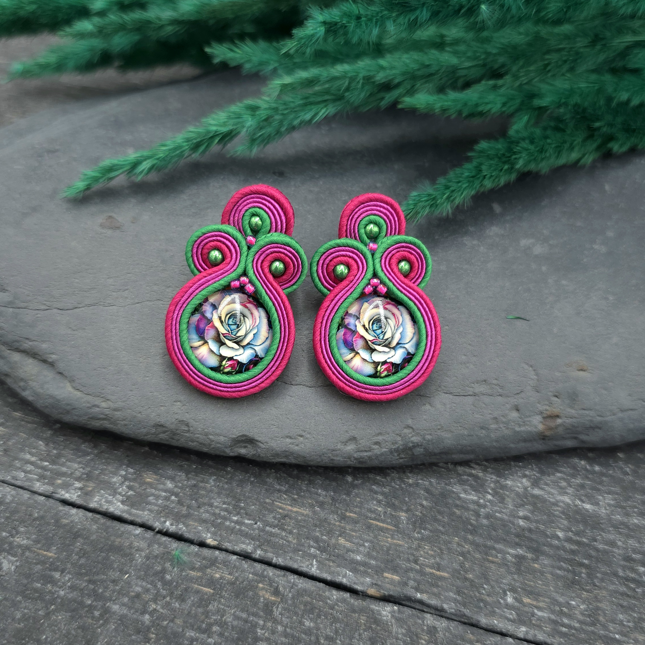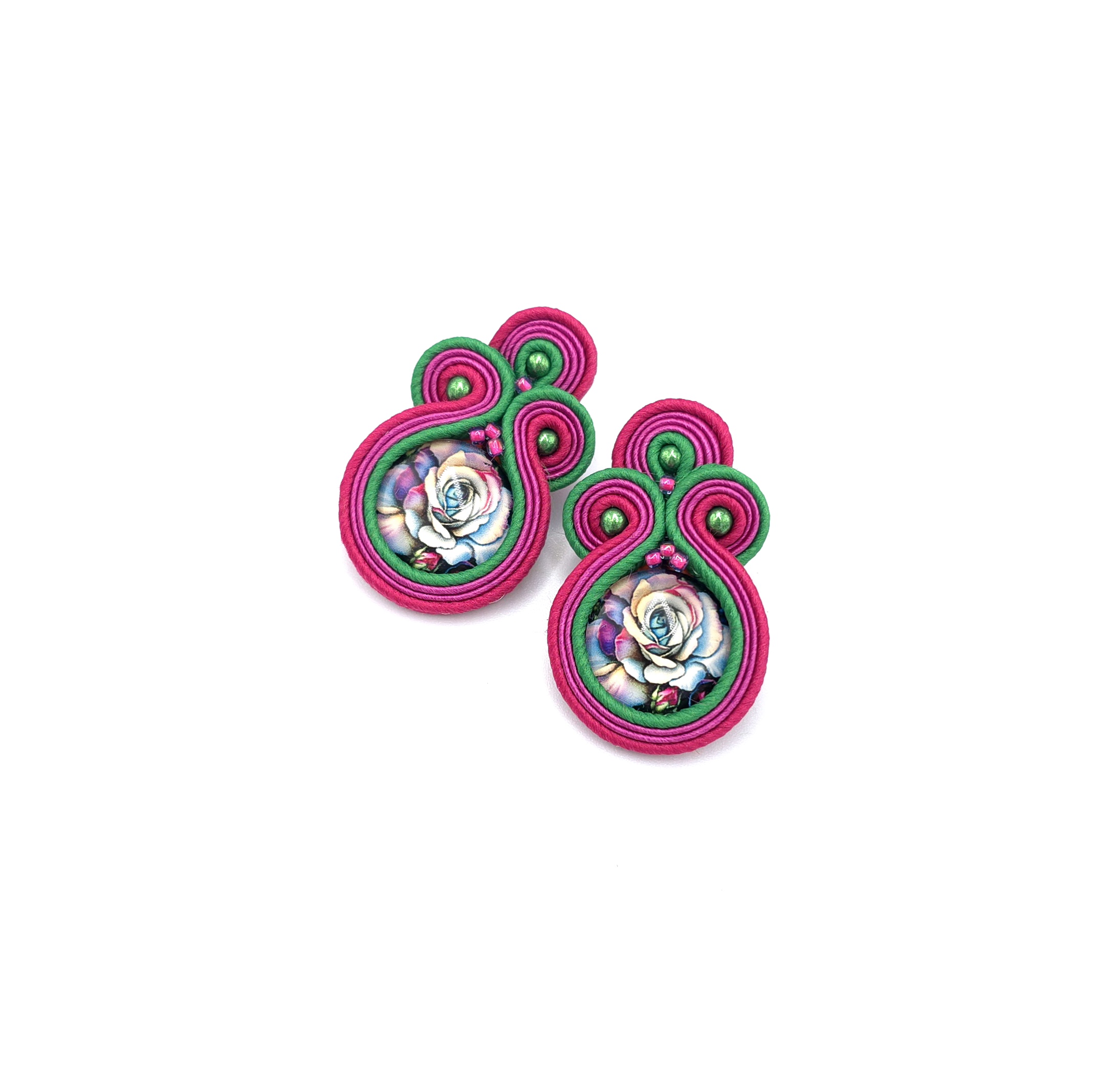 kaboszony z grafiką kwiatów, koraliki Round Beads, koraliki Toho, czeskie i greckie sznurki sutasz, sztyfty ze stali chirurgicznej.