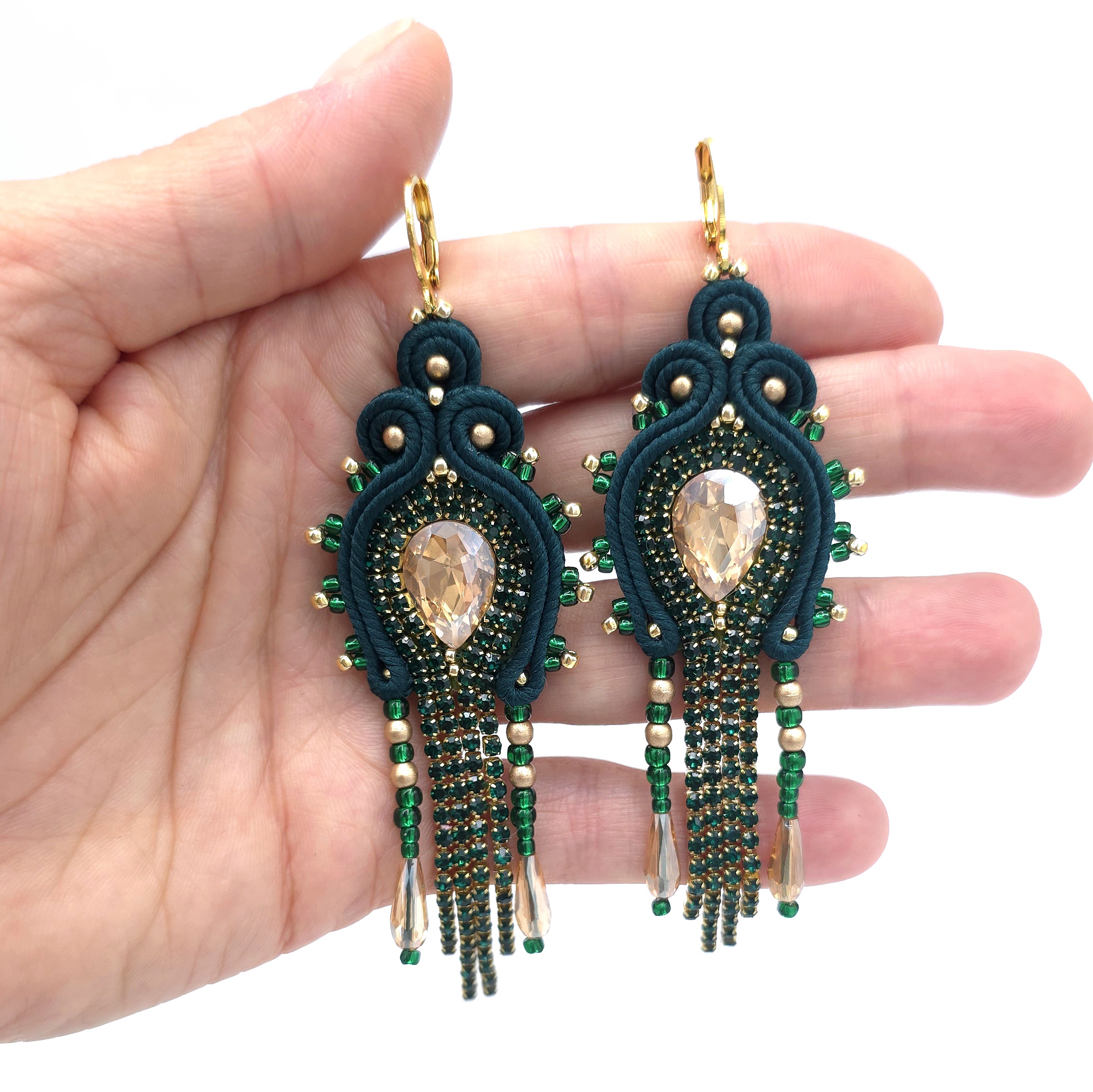 Utrzymane w stylu boho, z błyszczącą taśmą cyrkoniową i łezkami po bokach.
