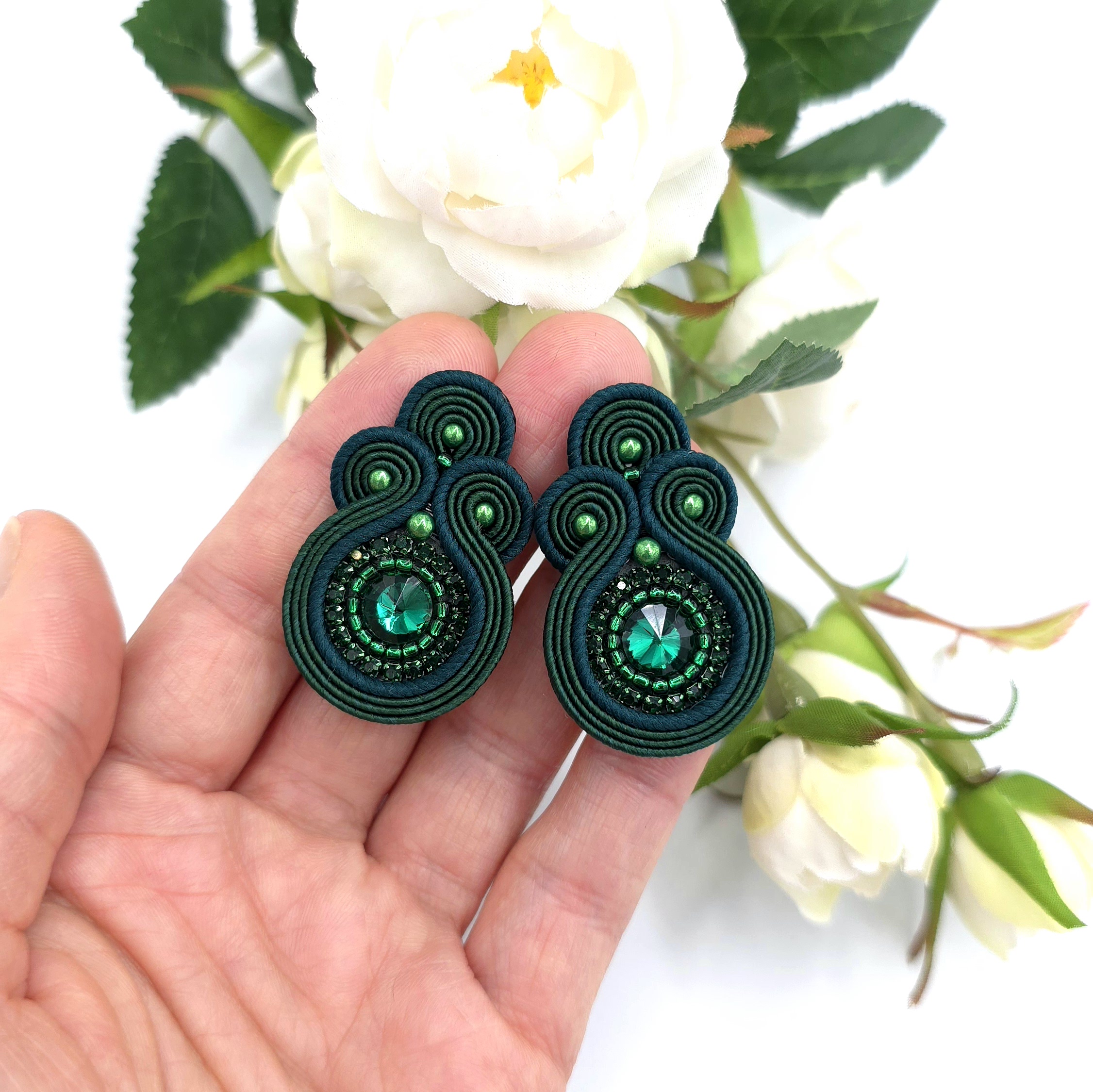 kaboszony kryształki, taśma z cyrkoniami, koraliki Toho, koraliki Round Beads, czeskie i polskie sznurki sutasz, sztyfty ze stali chirurgicznej.