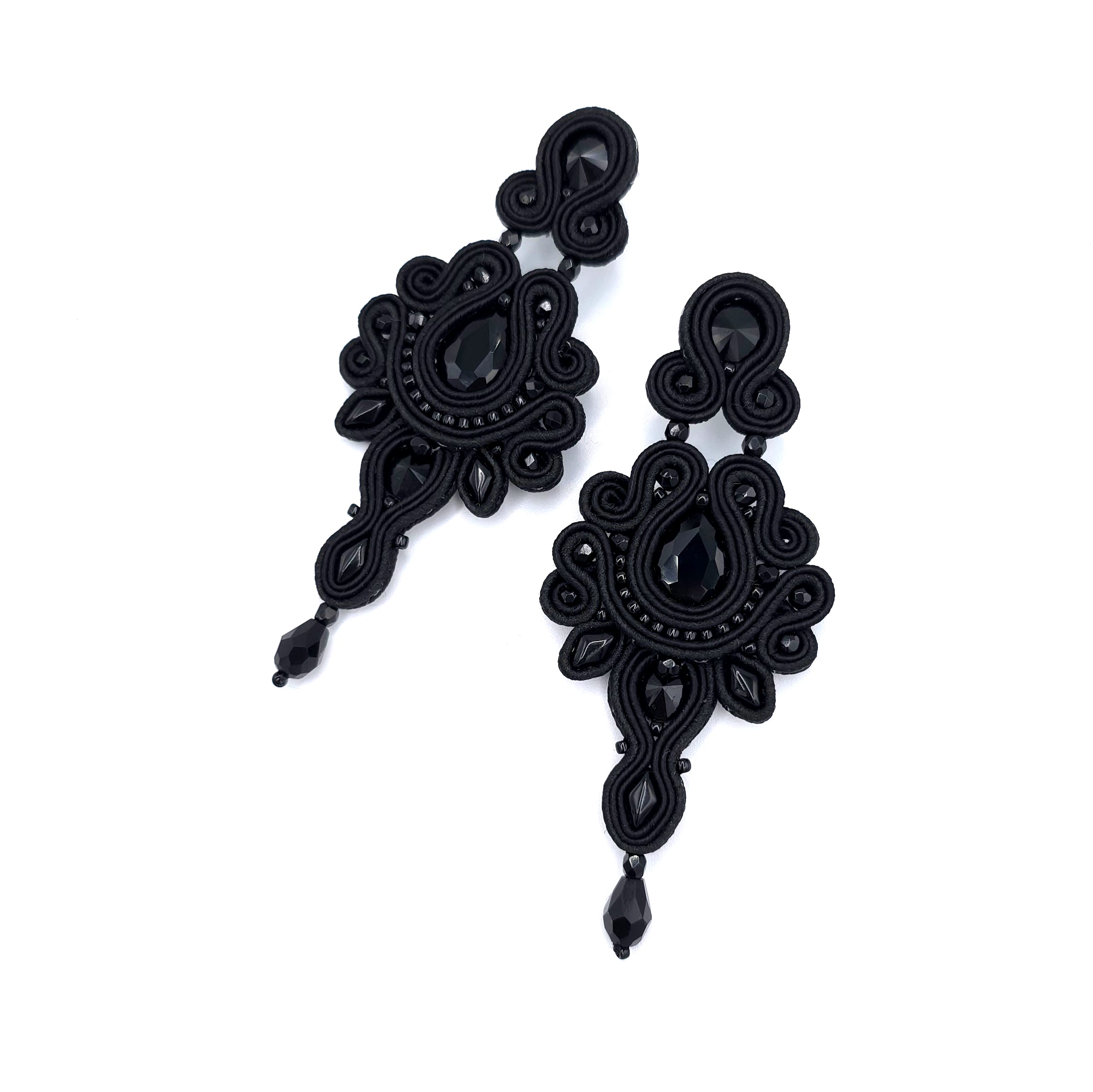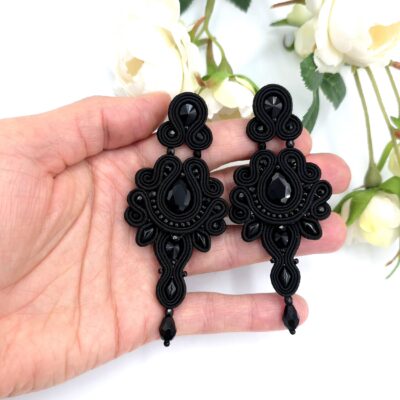 Wieczorowe kolczyki, o podłużnej, rozbudowanej pośrodku formie niczym kwiat.