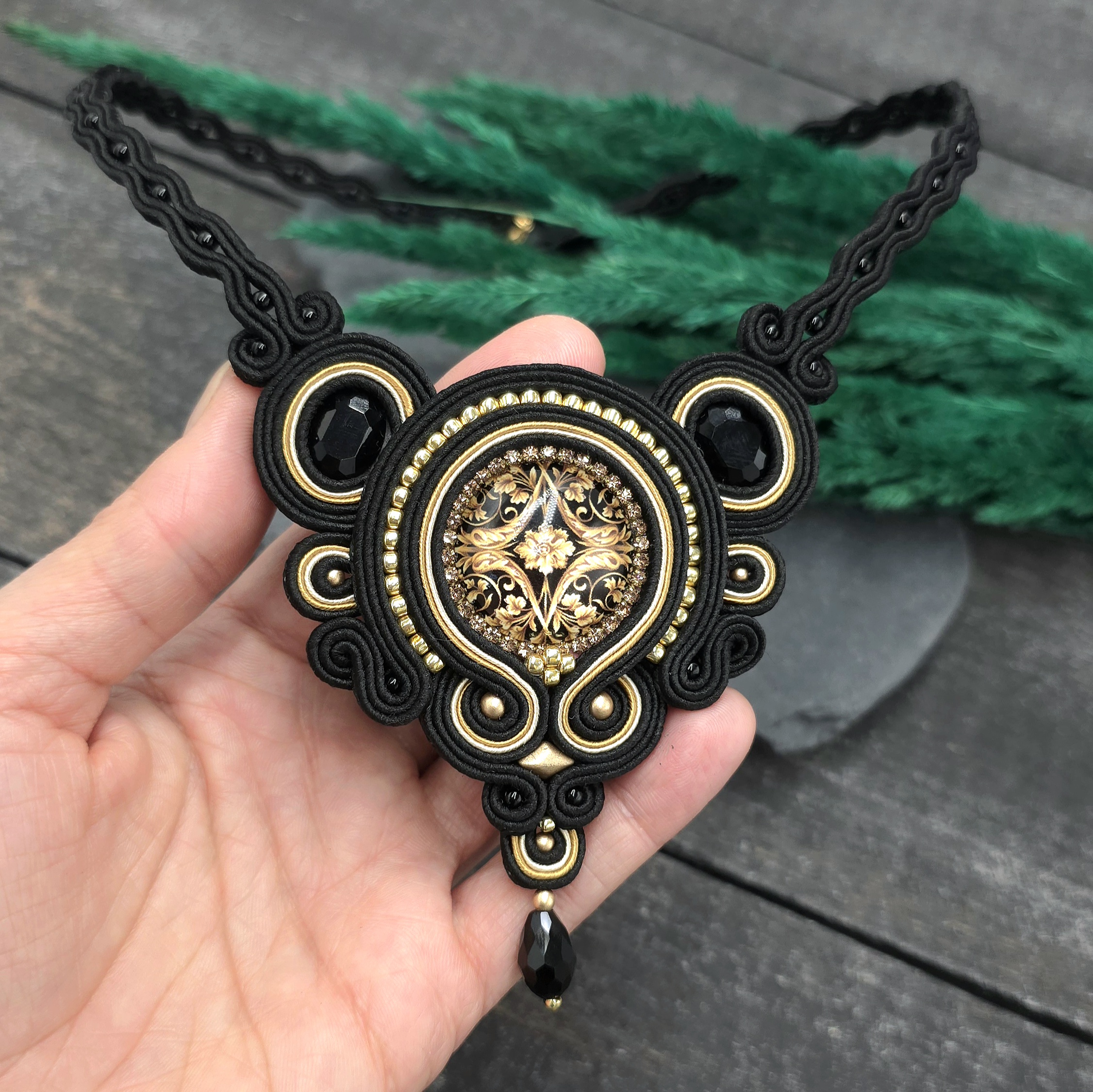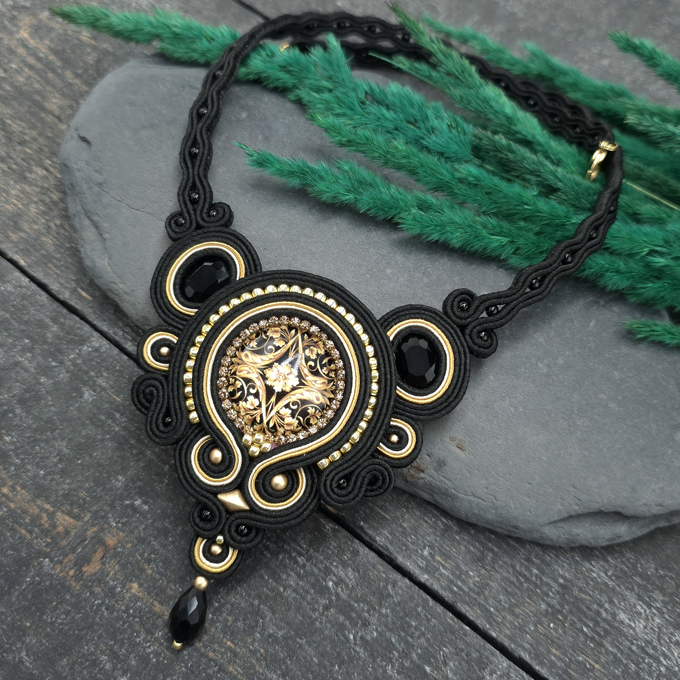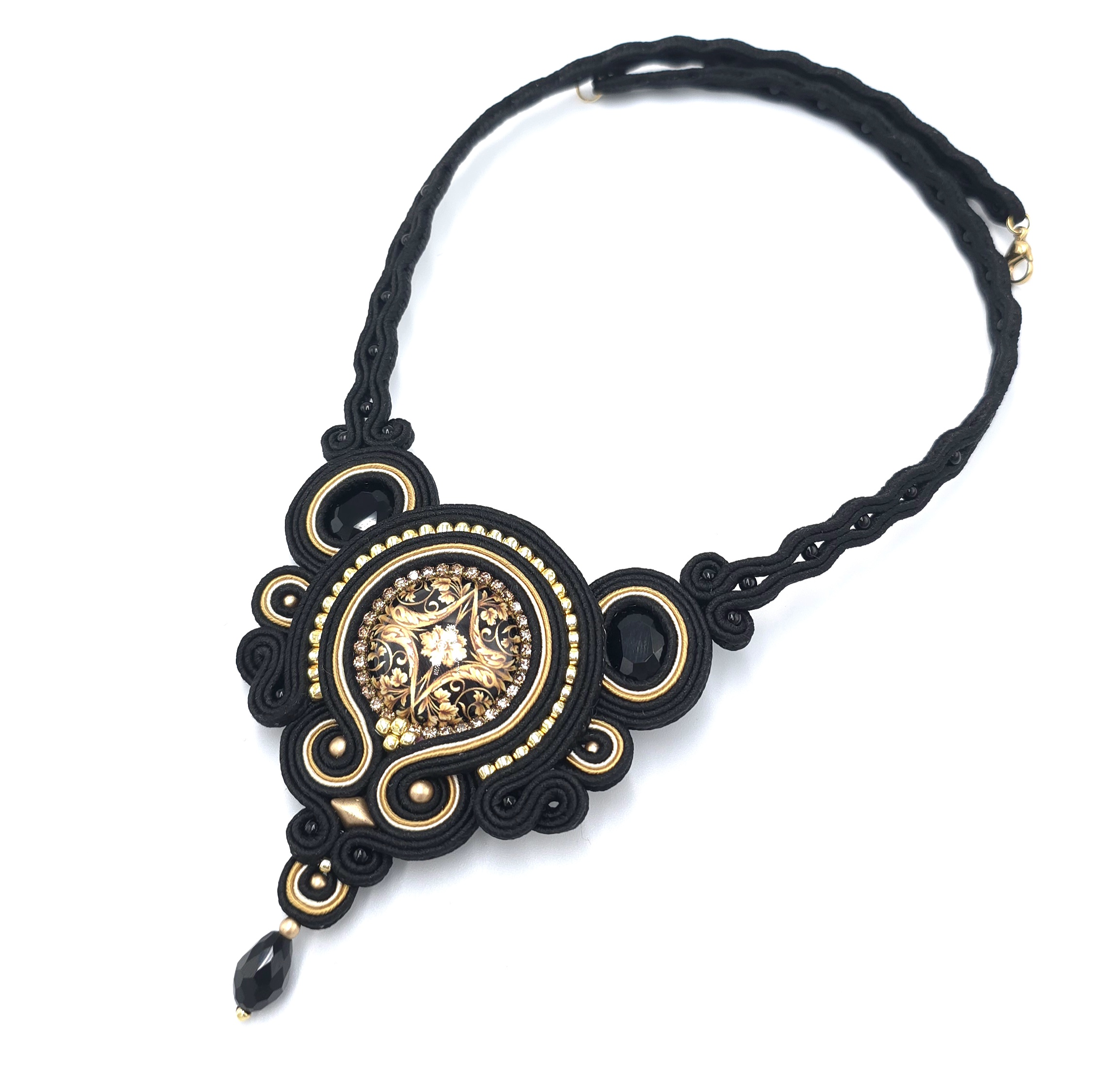 kaboszon szklany z motywem barokowym, kaboszony kryształki, koraliki Toho, koraliki Round Beads, koralik GemDuo, szklana łezka, greckie i czeskie sznurki sutasz, zapięcie ze stali chirurgicznej.