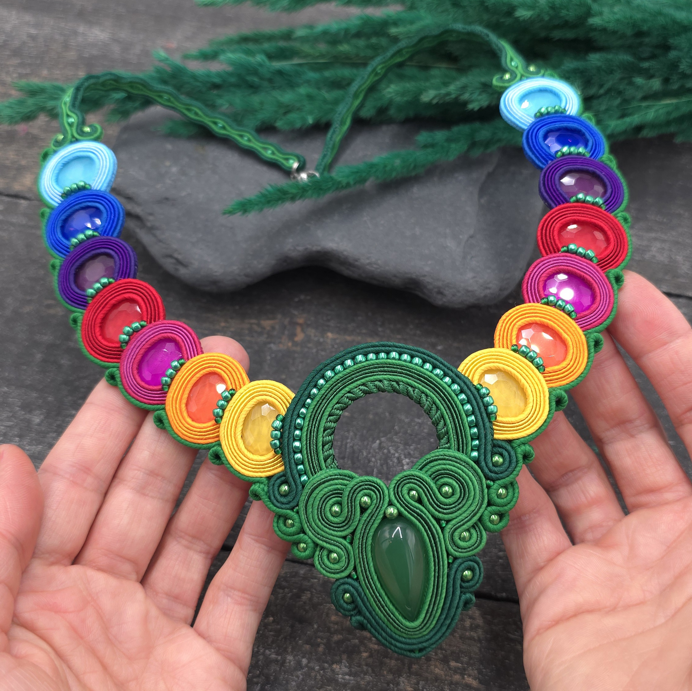 Centralny element z naturalnym zielonym agatem pięknie kontrastuje z kolorowymi kamieniami, tworząc efekt wiosennej świeżości.