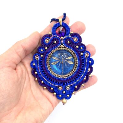 szklany czeski guzik z ważką, kaboszon kryształek, koraliki Toho, koraliki Round Beads, taśma z cyrkoniami, greckie, polskie i czeskie sznurki sutasz, łańcuszek żmijka, zapięcie ze stali chirurgicznej.