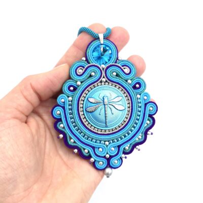 szklany czeski guzik z ważką, kaboszon kryształek, koraliki Toho, koraliki Round Beads, taśma z cyrkoniami, greckie, polskie i czeskie sznurki sutasz, łańcuszek żmijka, zapięcie ze stali chirurgicznej.