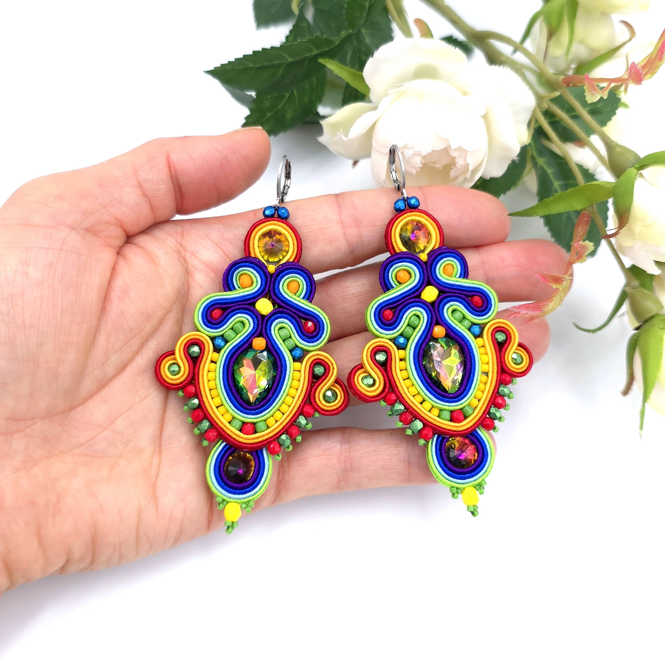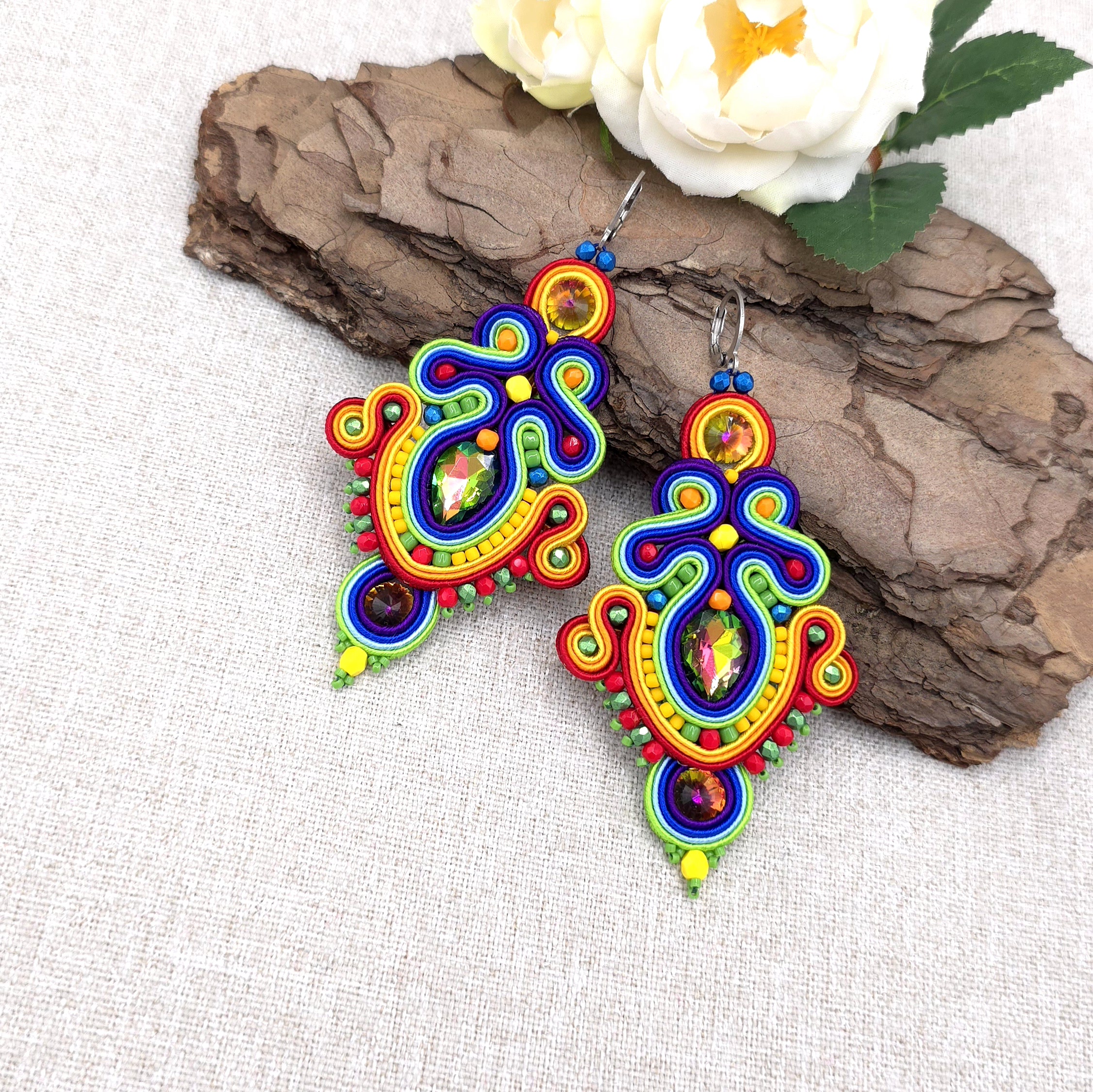 Unikatowe kolczyki sutasz, o pięknej, rozbudowanej formie, pełne barw.