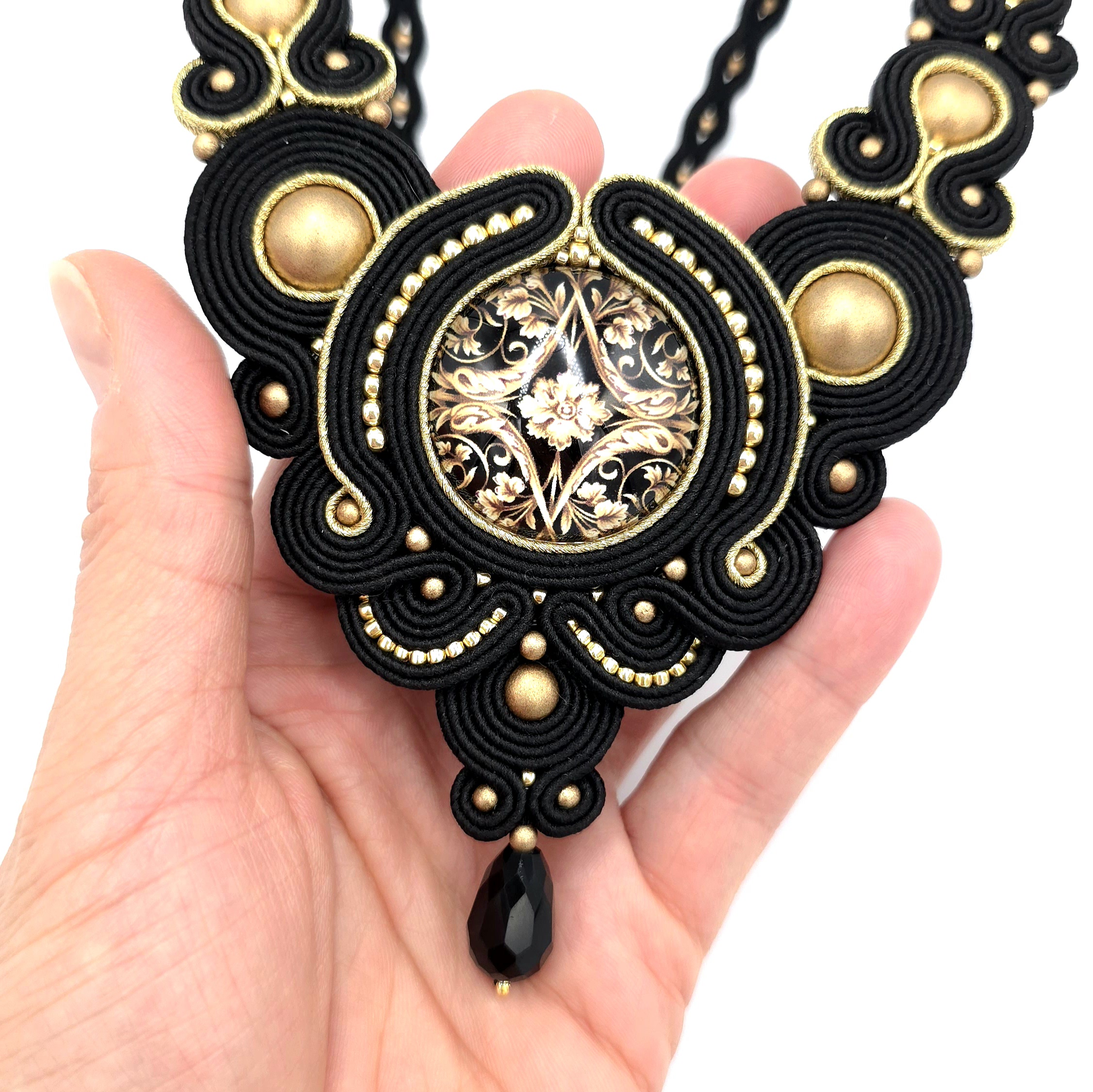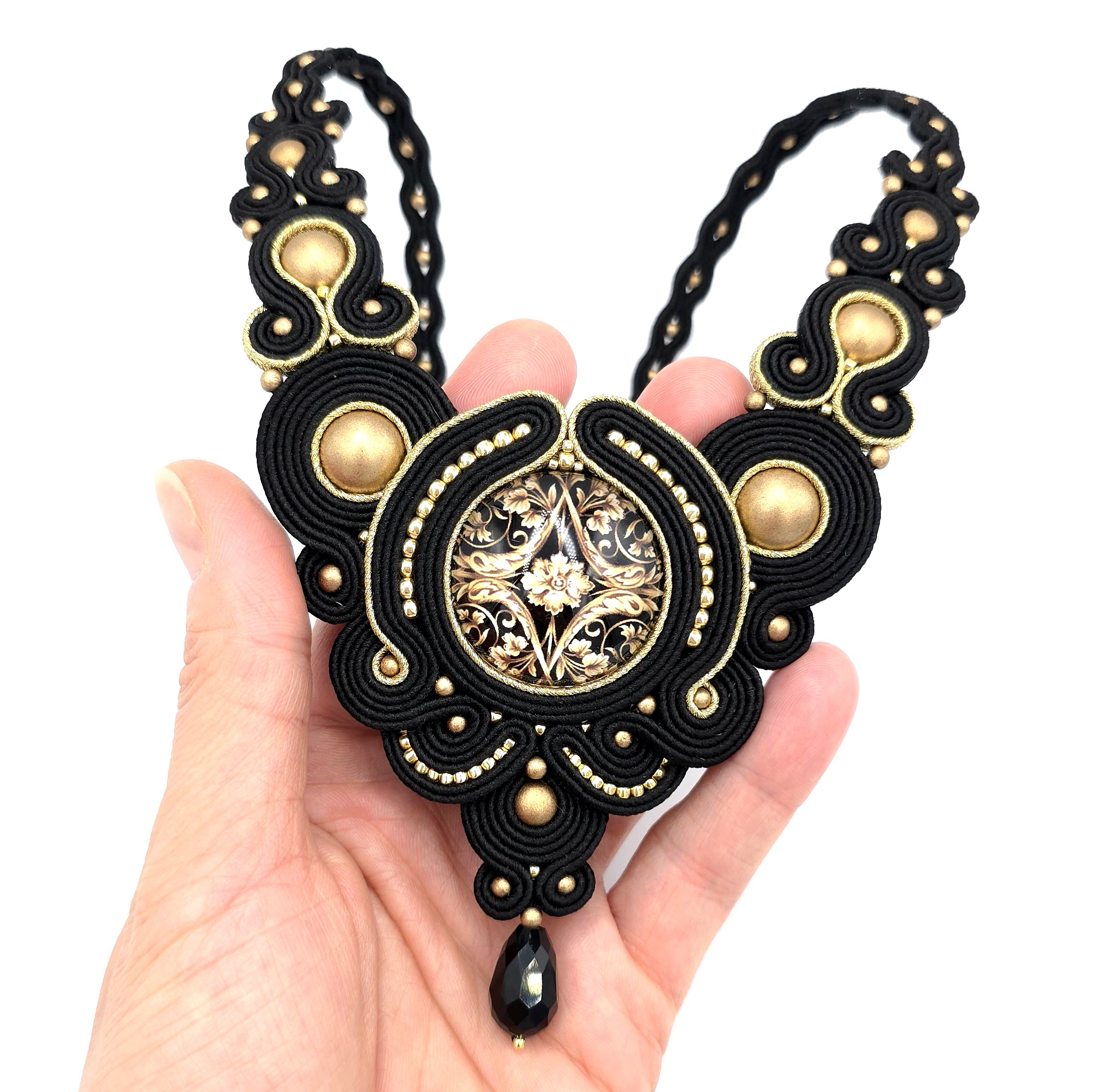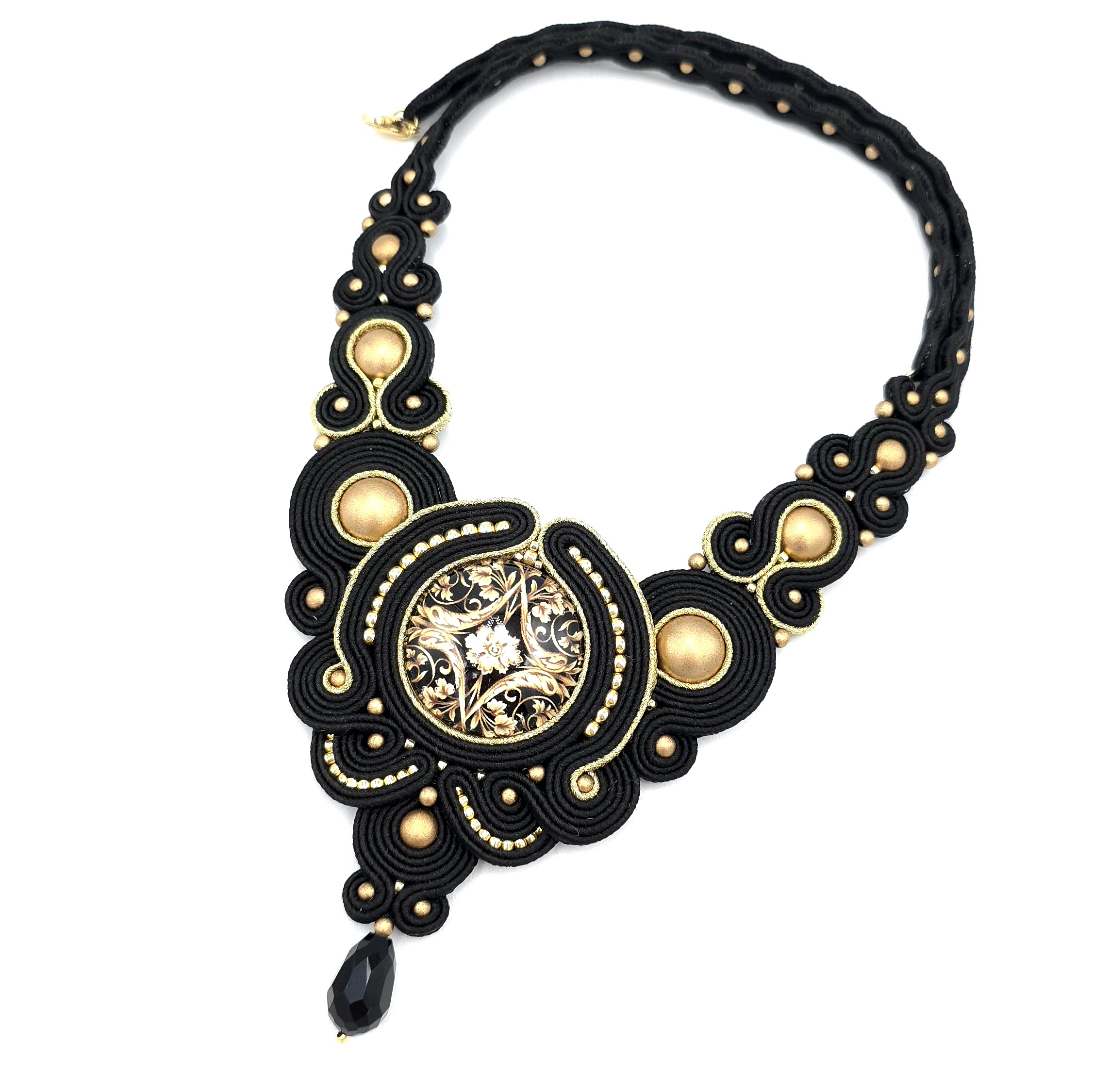 kaboszon szklany z grafiką barokową, kaboszony perłowe w kolorze złota, koraliki Toho, koraliki Round Beads, łezka szklana, greckie sznurki sutasz, zapięcie ze stali chirurgicznej.