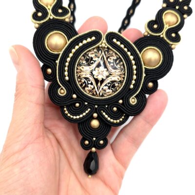 Całość wykonana w stylu klasycznym, gdzie czerń przeplata się ze złotem, tworząc niezwykle elegancką biżuterię.