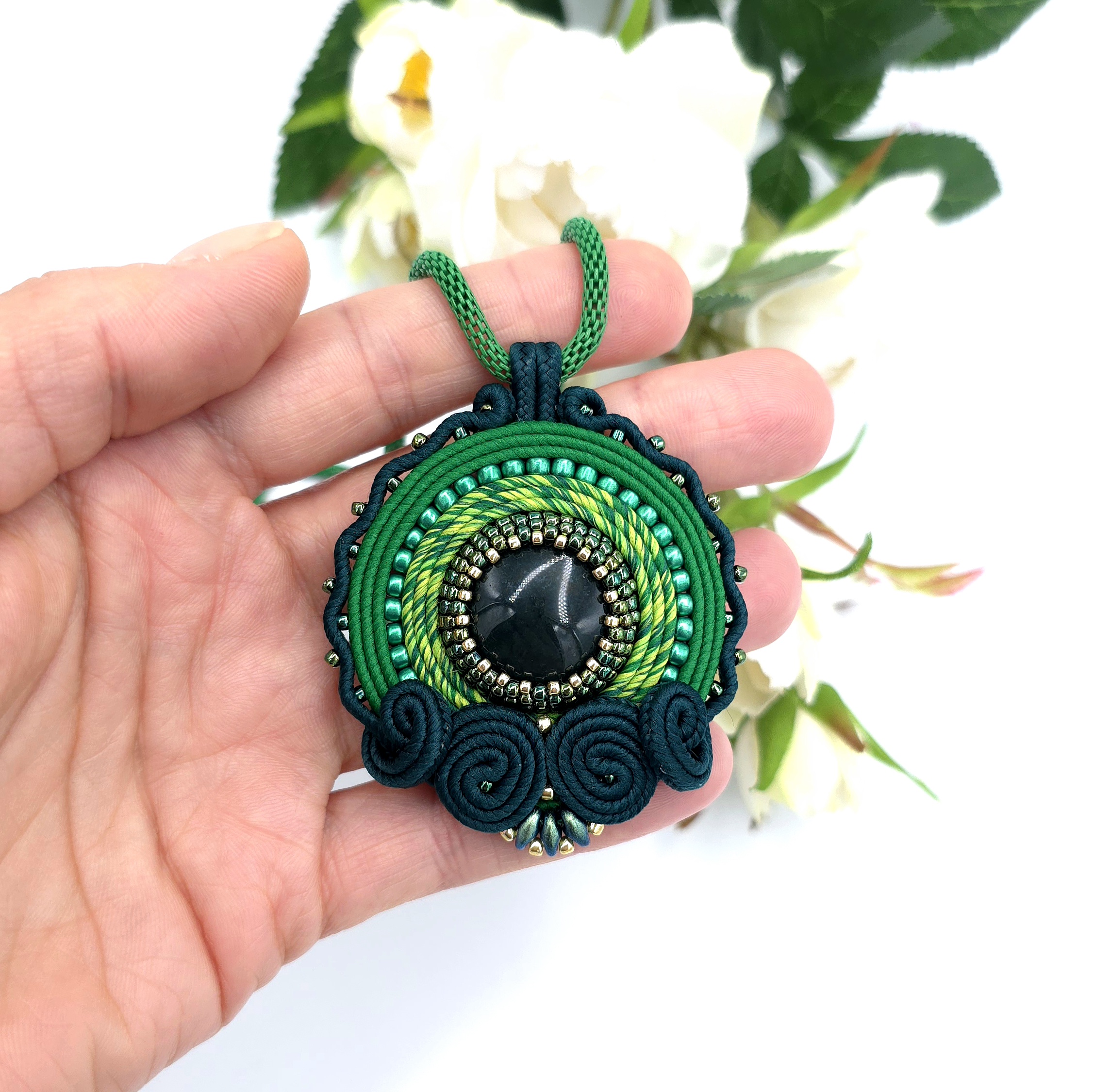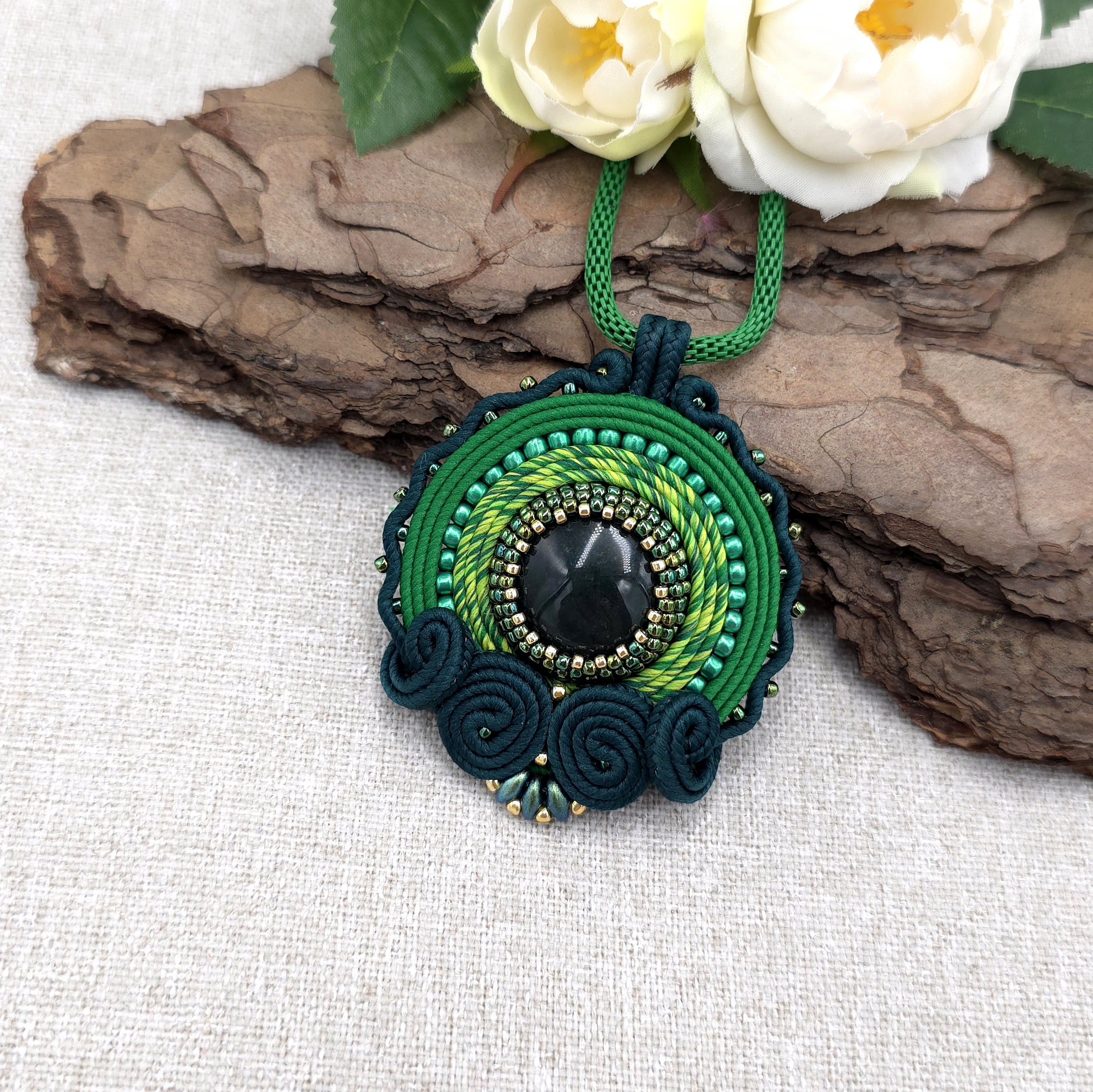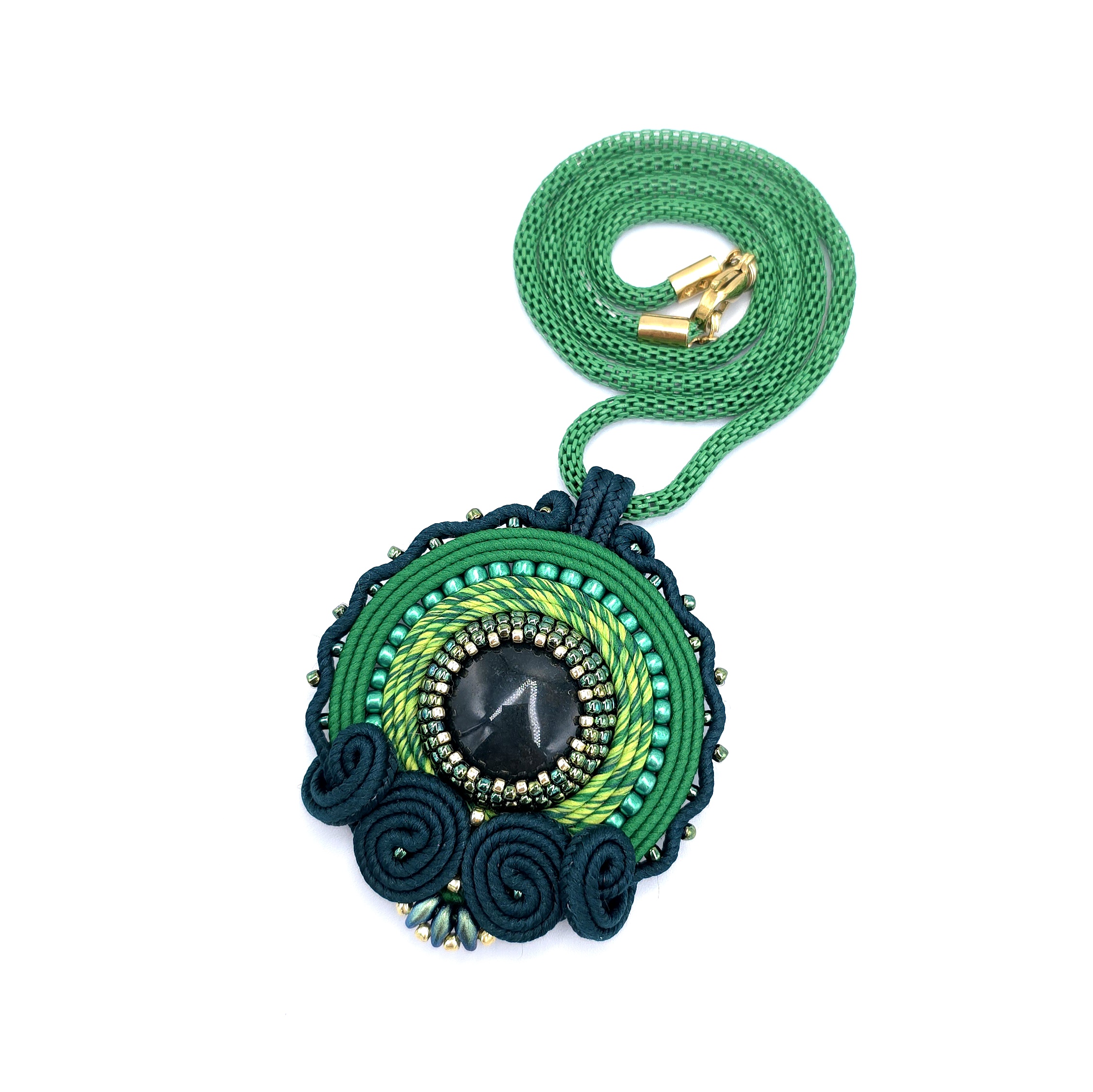 Ten ręcznie wykonany wisiorek sutasz zachwyca bogactwem zielonych odcieni.