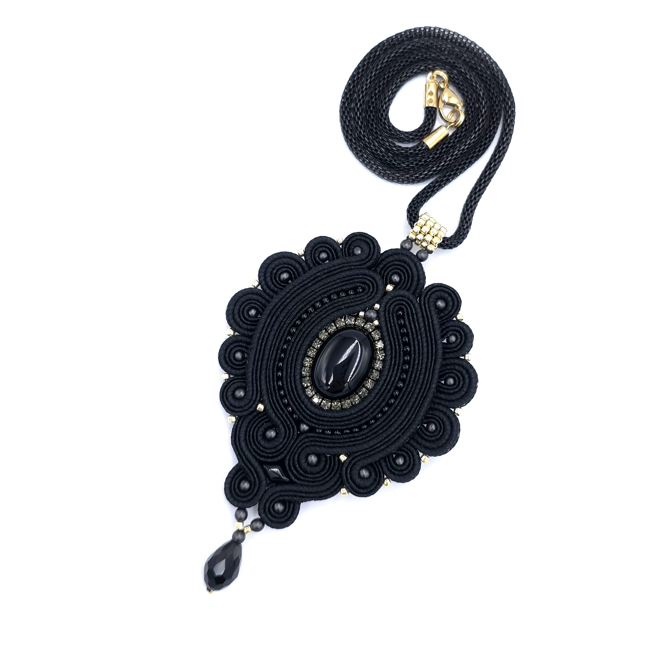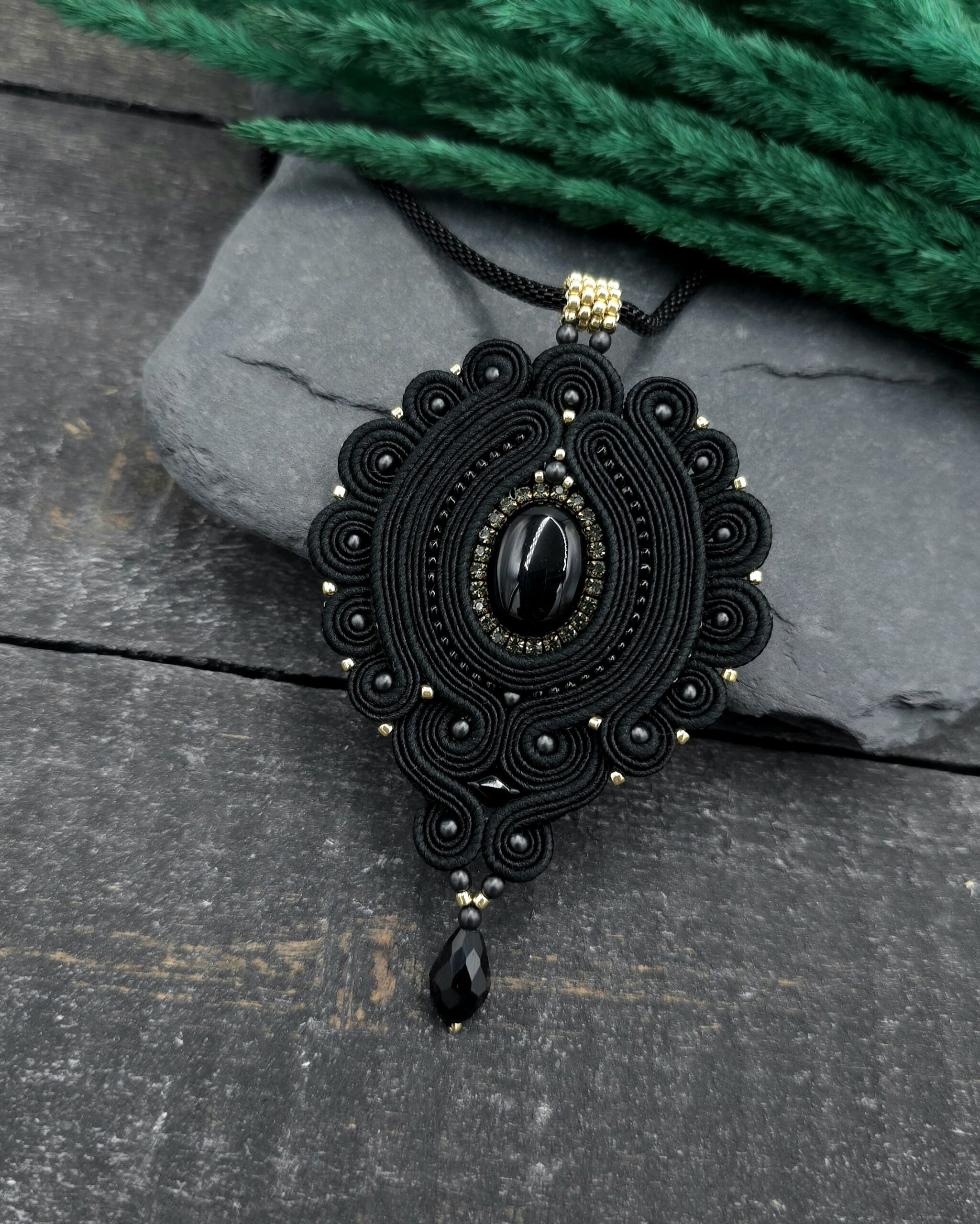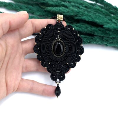 Klasyczny wisiorek sutasz w odcieniach głębokiej czerni z dodatkiem odrobiny złota.