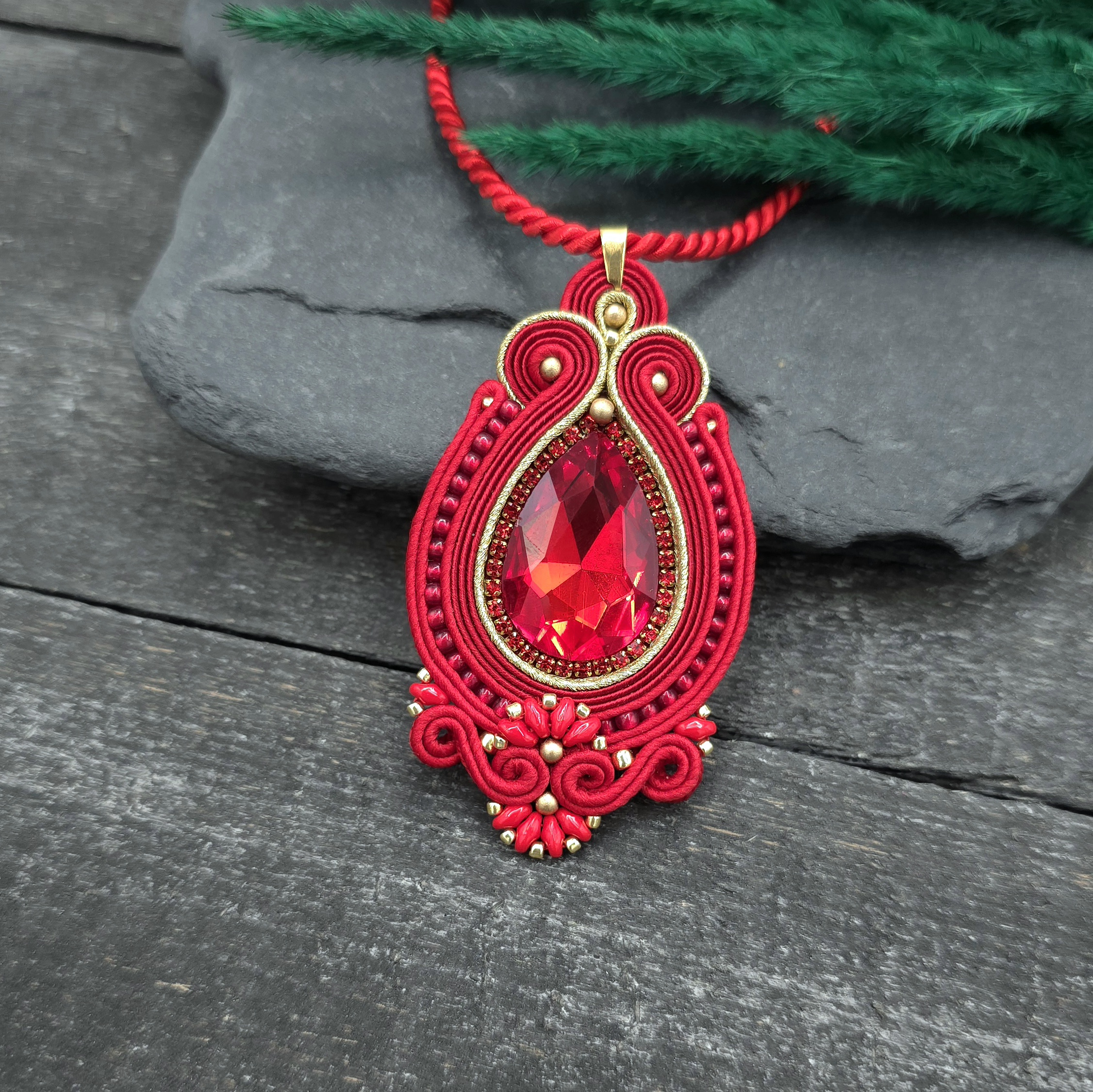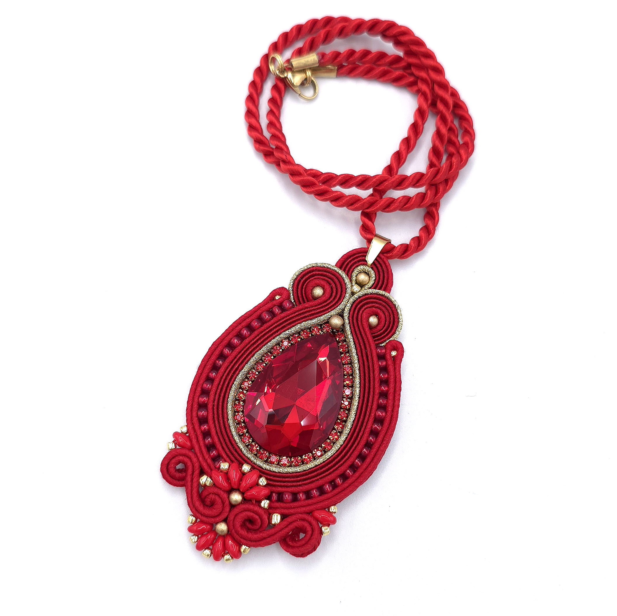 Przepiękny wisiorek z sutaszu, z mieniącym się dużym kryształem pośrodku i taśmą z cyrkoniami wokół niego.