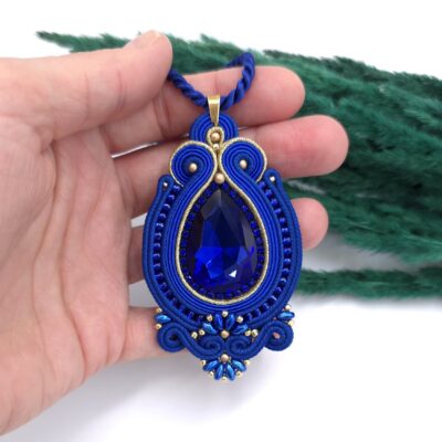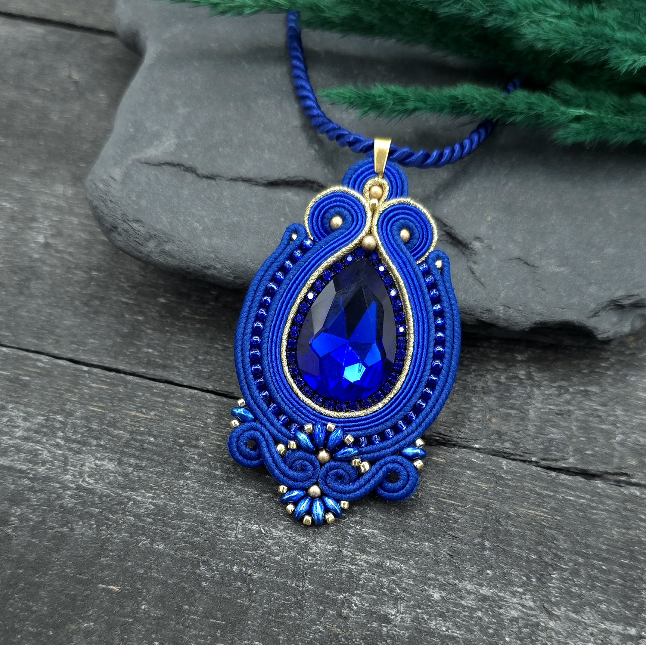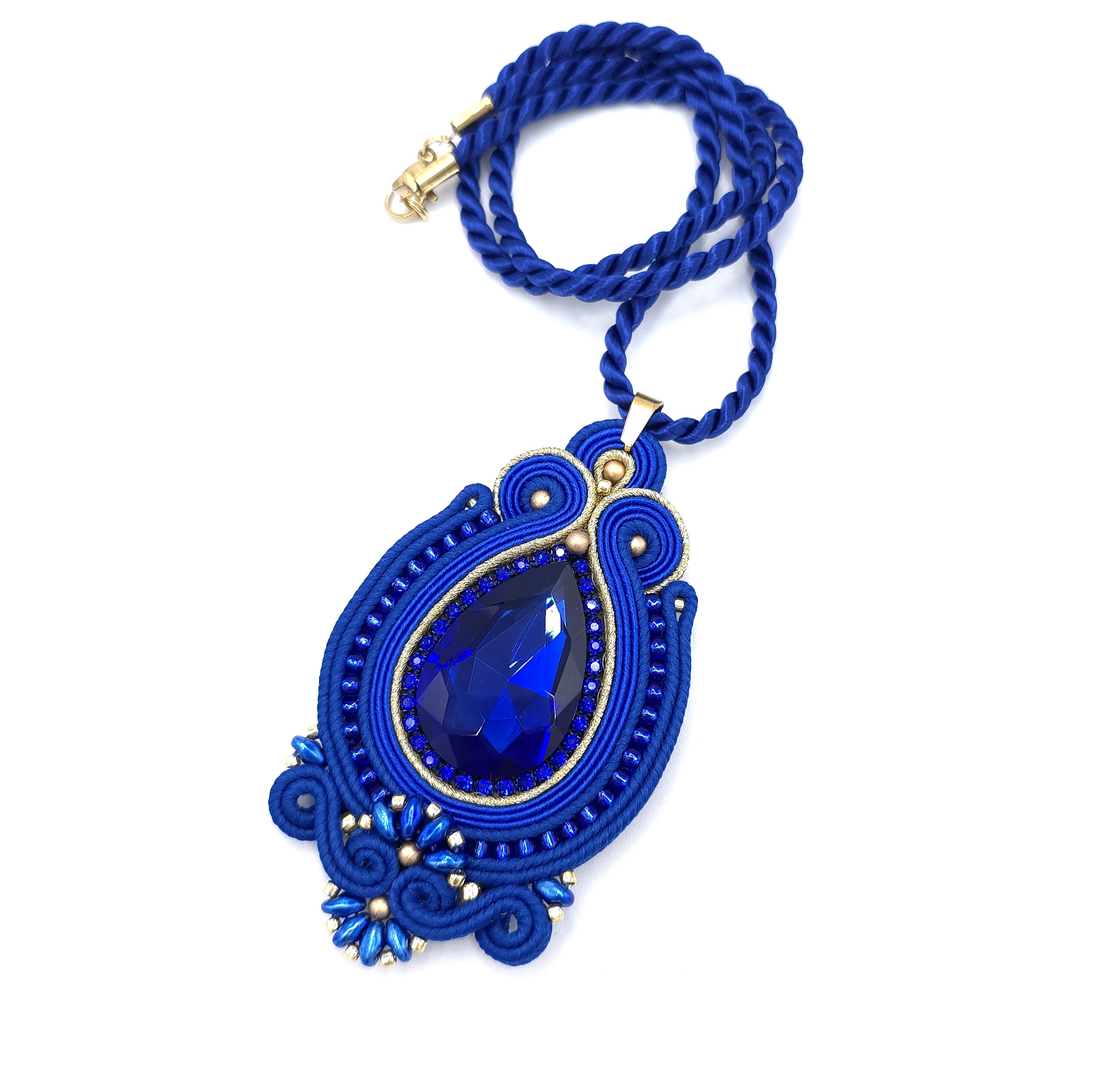 Przepiękny wisiorek z sutaszu, z mieniącym się dużym kryształem pośrodku i taśmą z cyrkoniami wokół niego.