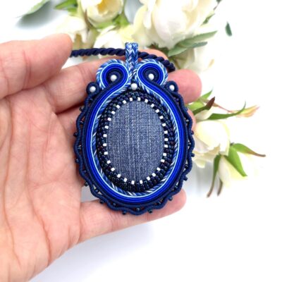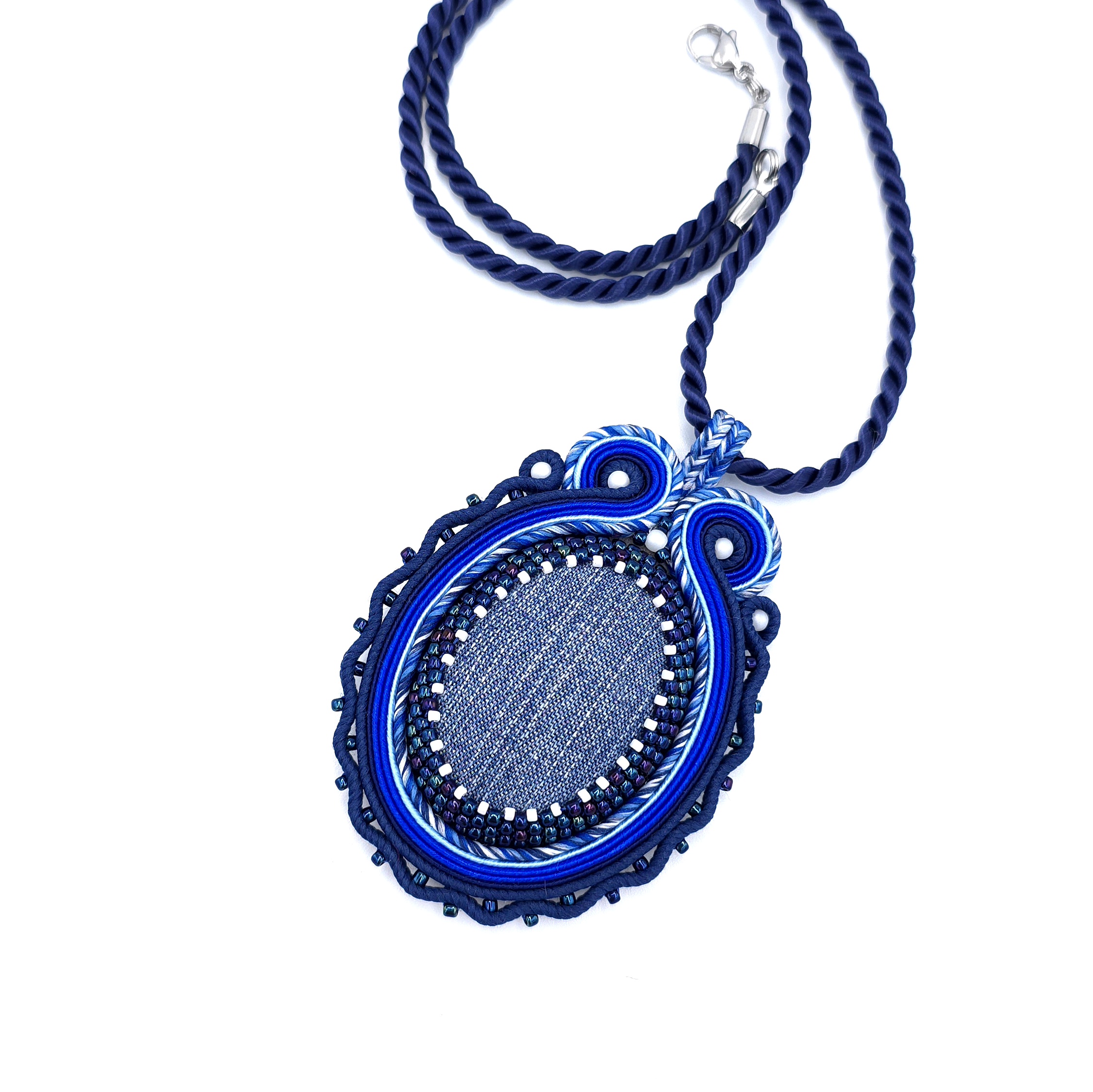 Wisiorek z sutaszu o nowoczesnym, codziennym charakterze dzięki centralnemu elementowi wykonanemu z dżinsu.
