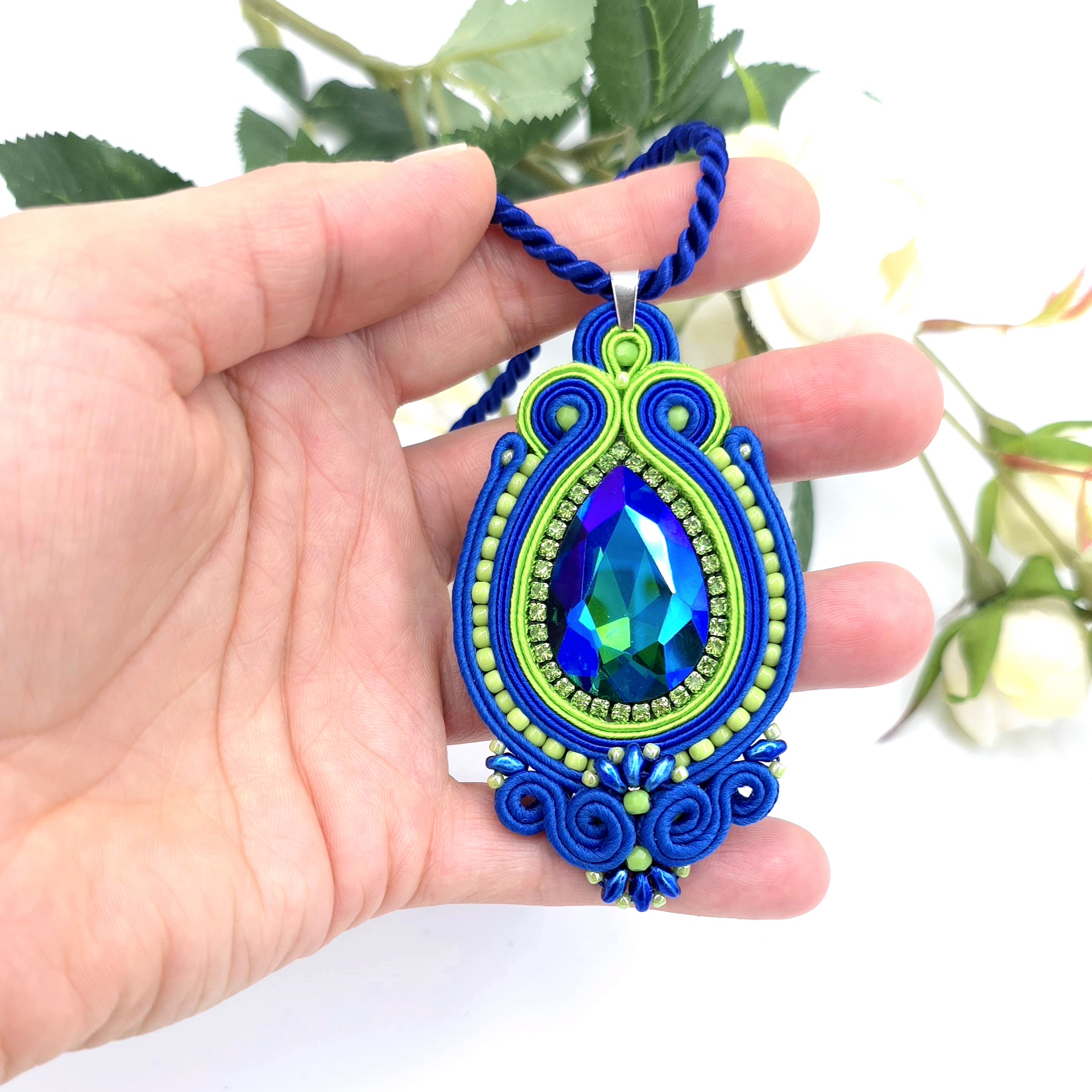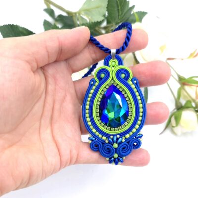 Przepiękny wisiorek z sutaszu, z mieniącym się dużym kryształem pośrodku i taśmą z cyrkoniami wokół niego.